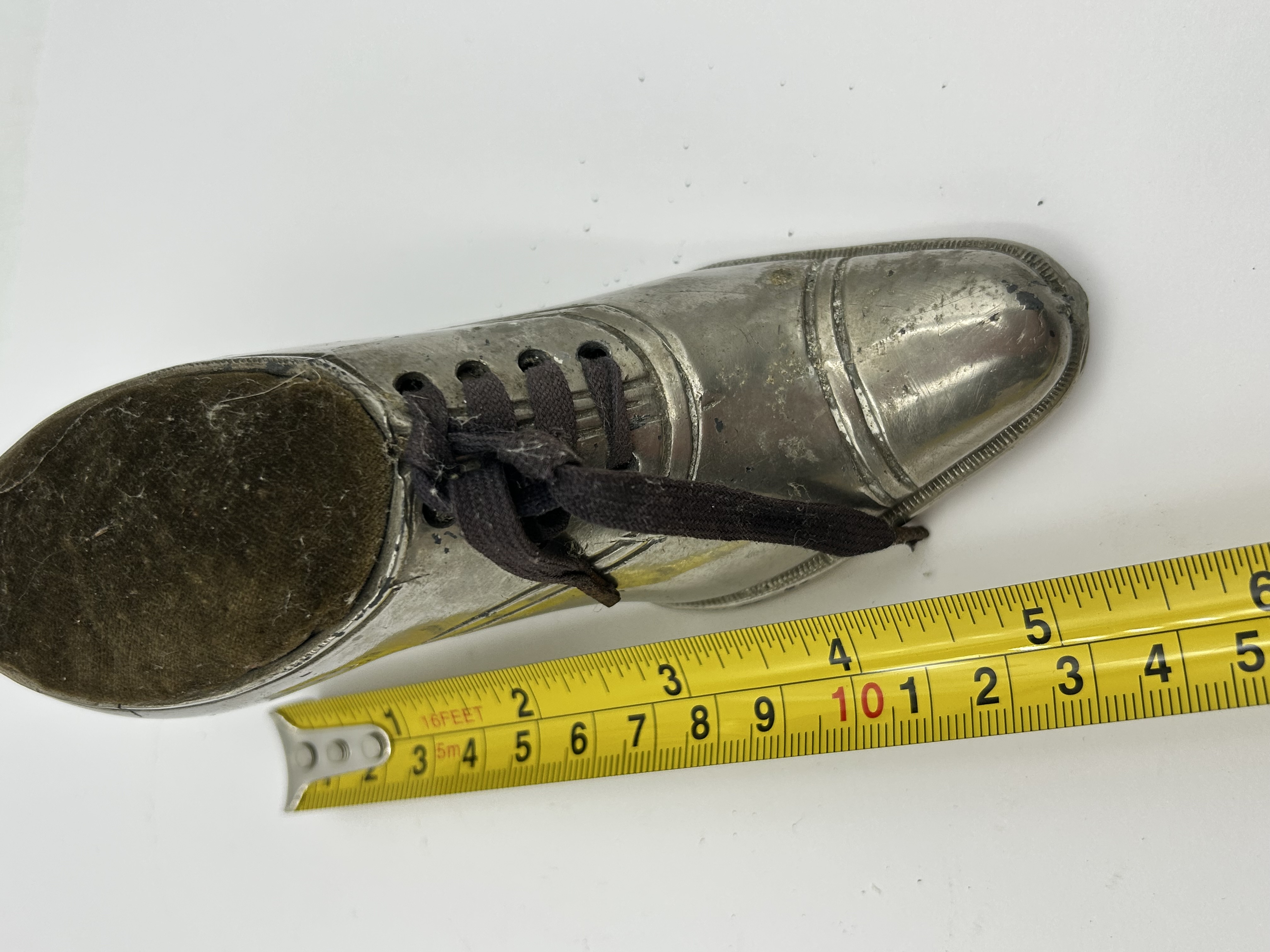 This novelty pin cushion is modeled in the form of a heeled lace-up shoe, crafted from silver-plated metal. The design features a capped toe, incised decorative seam lines, and a textured pattern along the edge of the sole. Dark fabric laces are fed through eyelets in the upper. A dark olive plush fabric cushion is set into the heel opening for the storage of pins. The underside of the shoe is hollowed.
