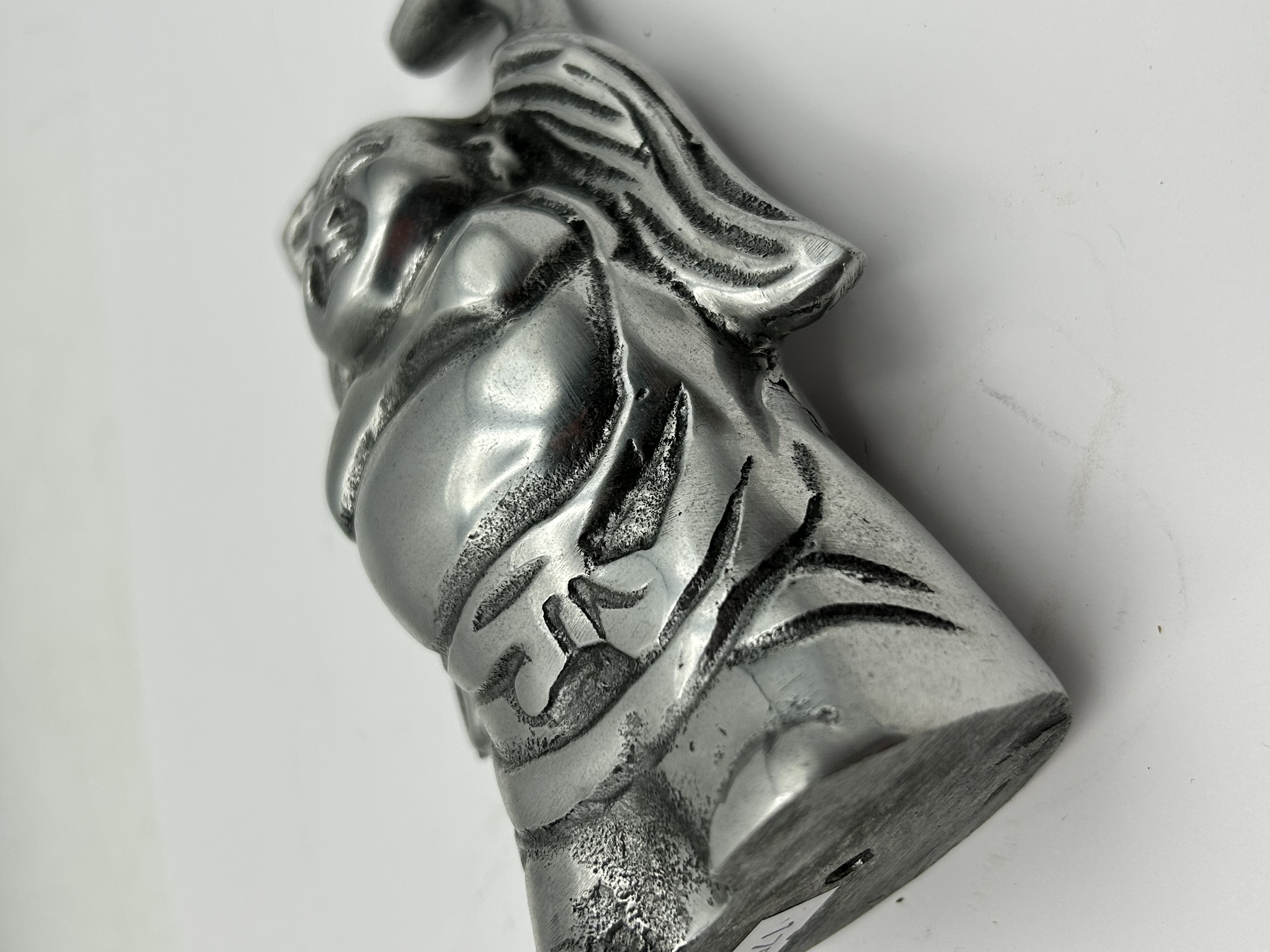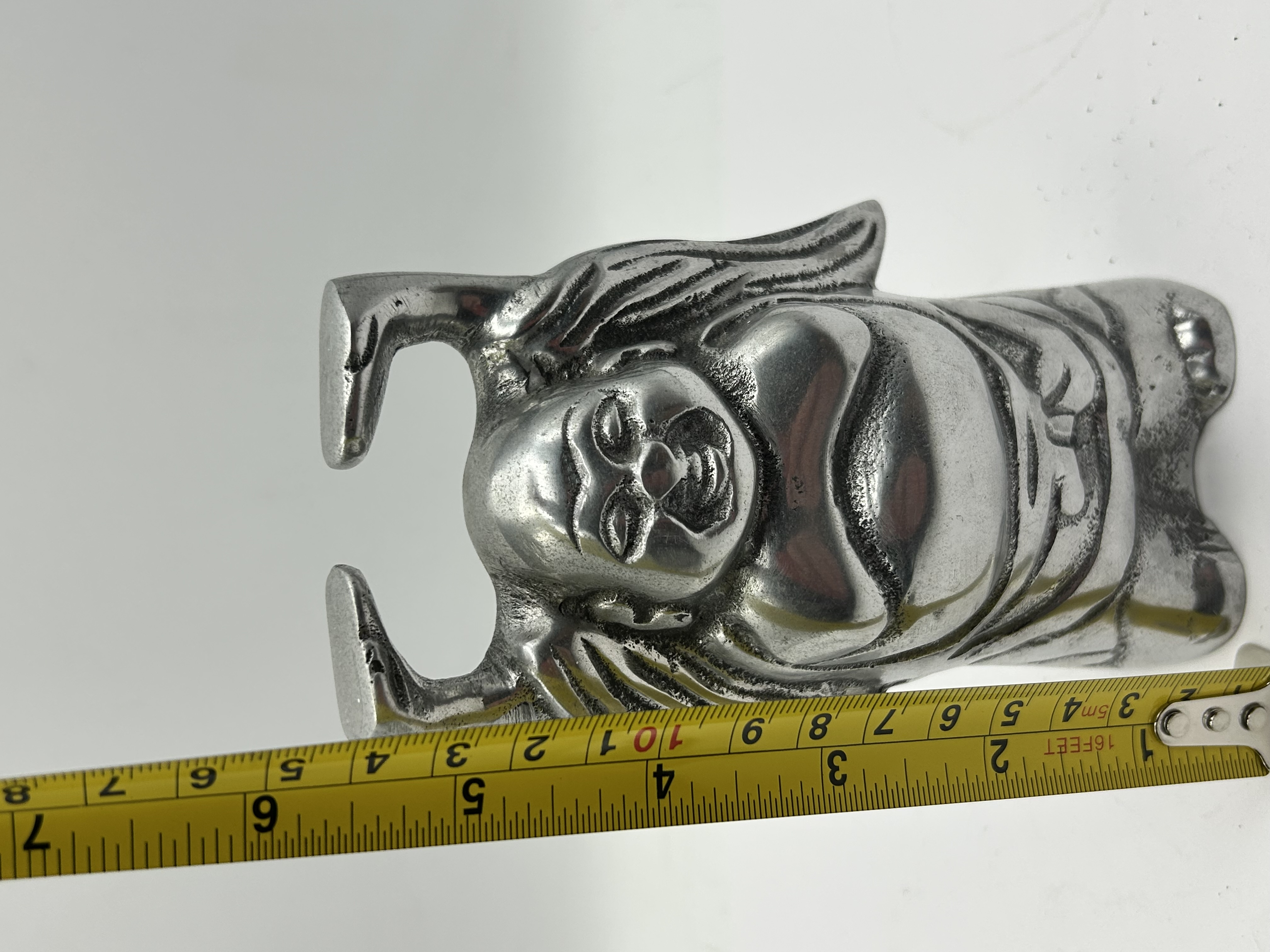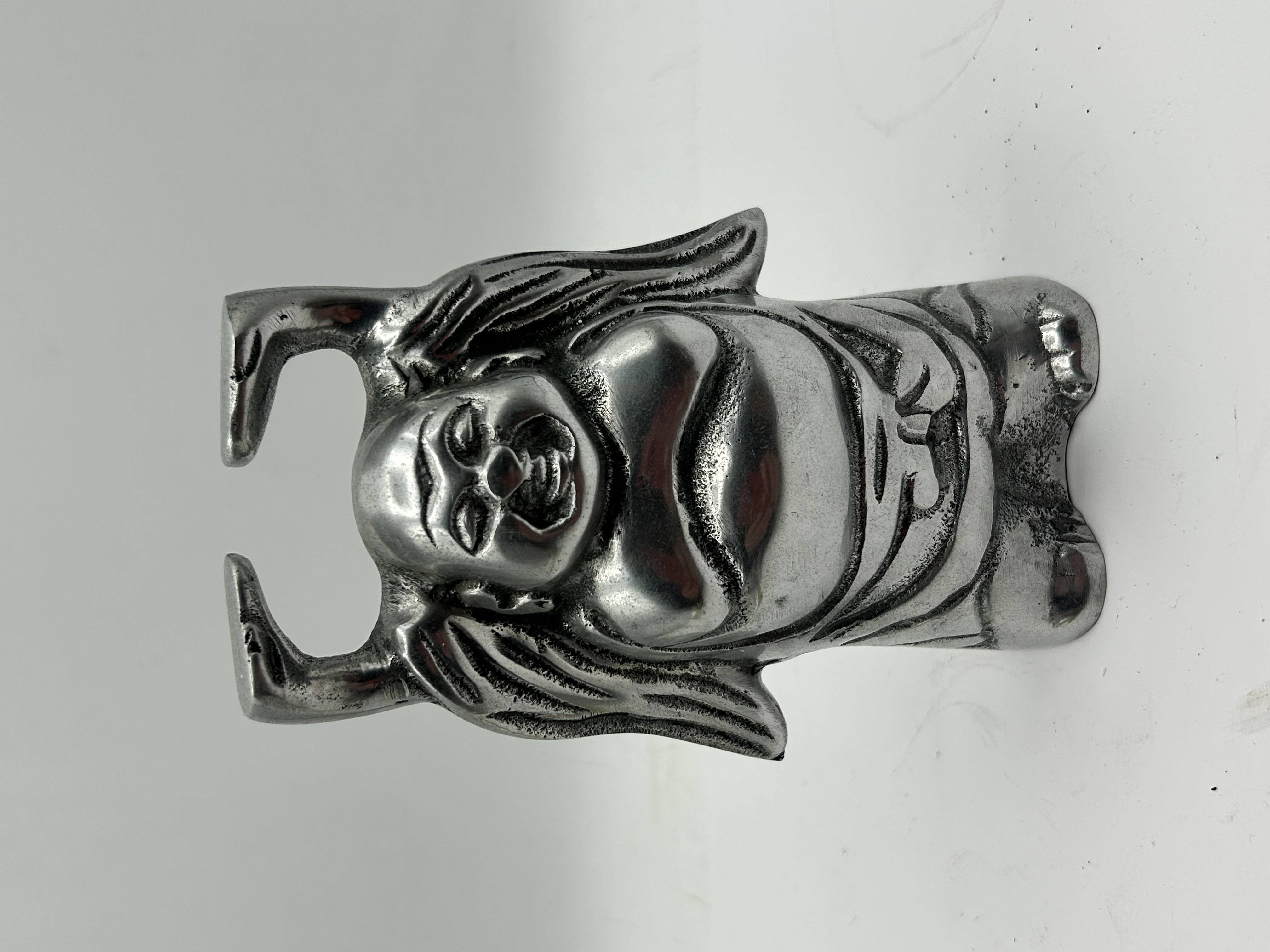 A cast metal figurine depicting a standing Laughing Buddha, also known as Hotei, in a traditional pose with arms raised overhead and a jubilant expression. The piece is finished in a silver-toned alloy with dark patination in the recessed areas to highlight the sculptural details. A single incised character, 天, meaning Heaven, is present on the lower reverse. The figurine is solid cast with a flat base.
