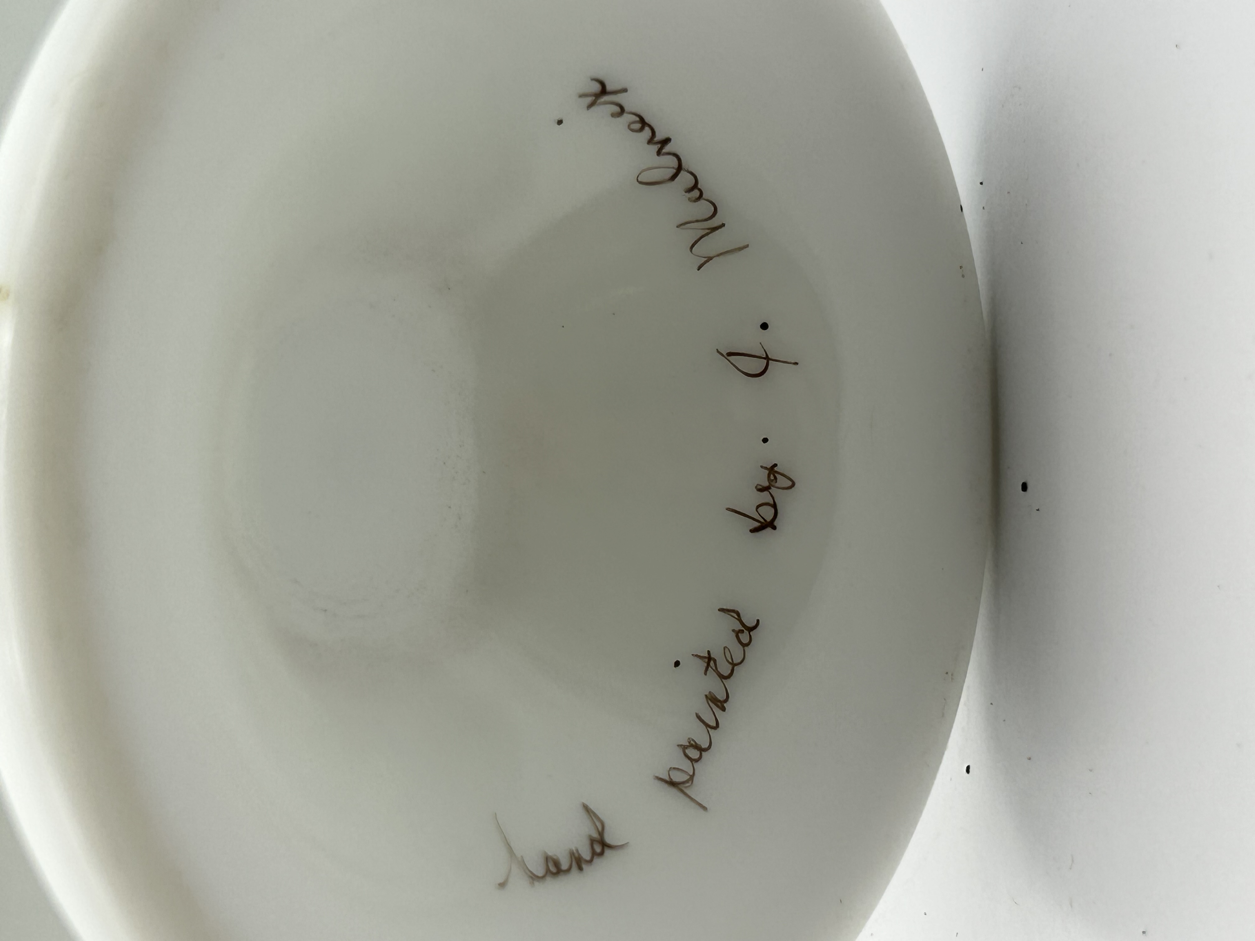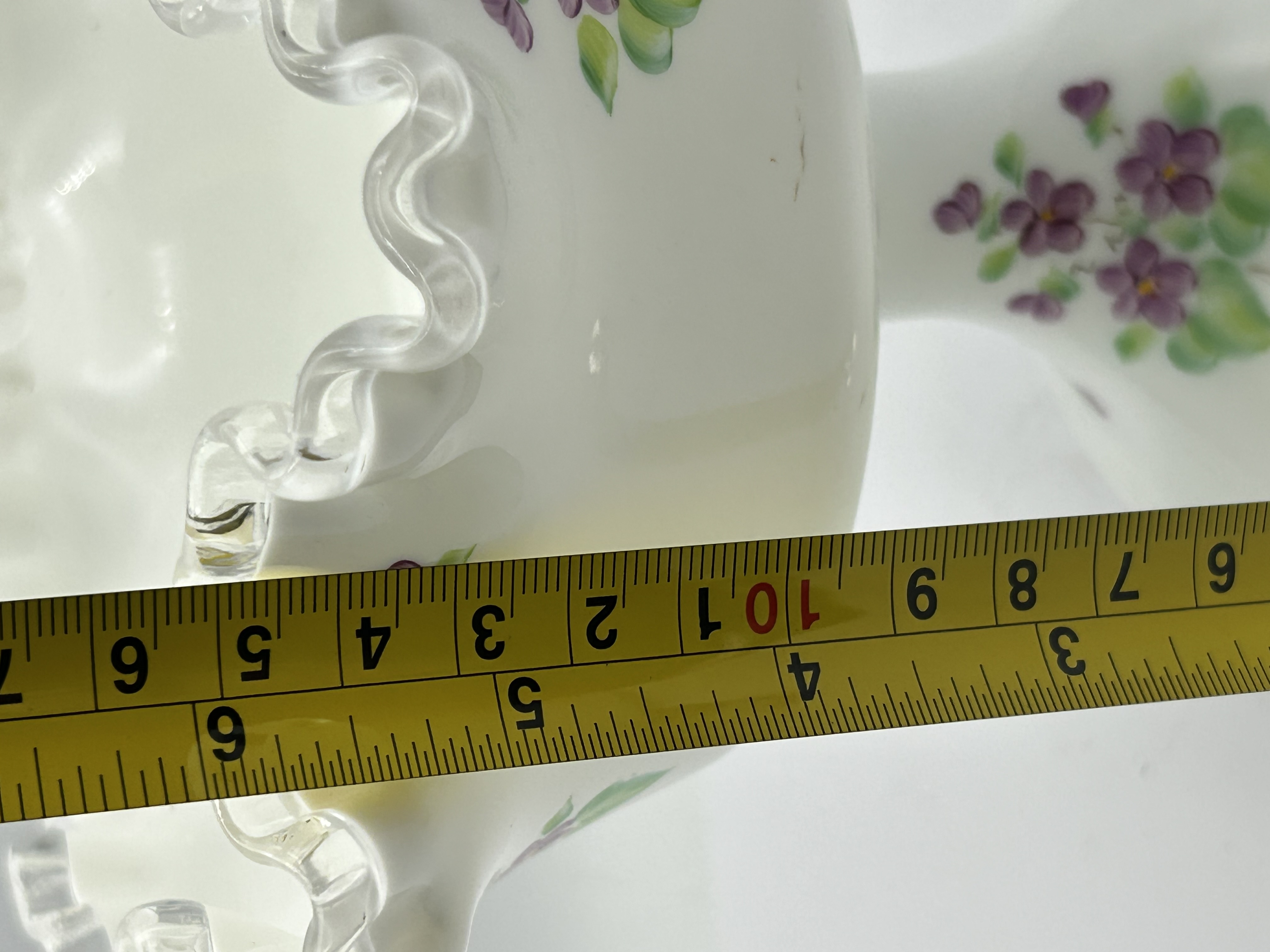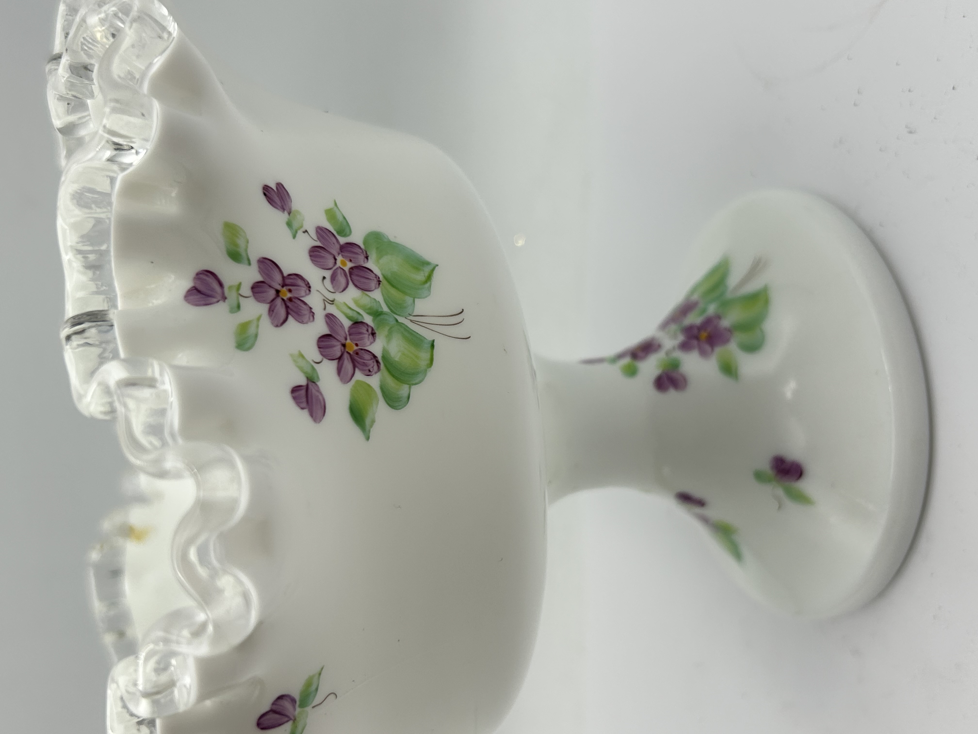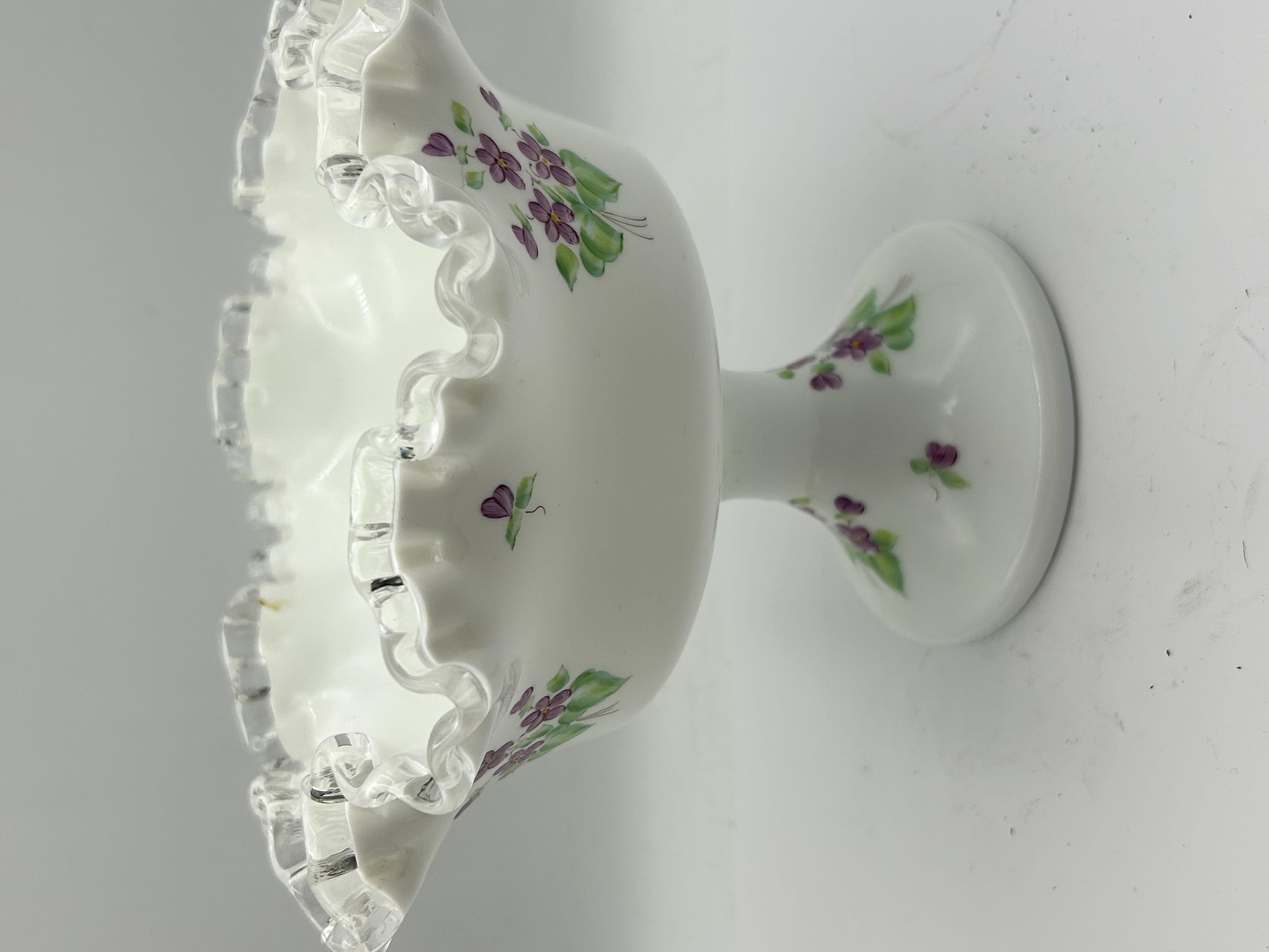 A Fenton Silver Crest pedestal bowl in the Violets in the Snow pattern. This opaque white milk glass dish features a ruffled rim with an applied clear glass crest. The exterior of the bowl and the foot are decorated with hand-painted purple floral motifs and green foliage. The underside of the foot is signed in script, hand painted by J. Molinoux.