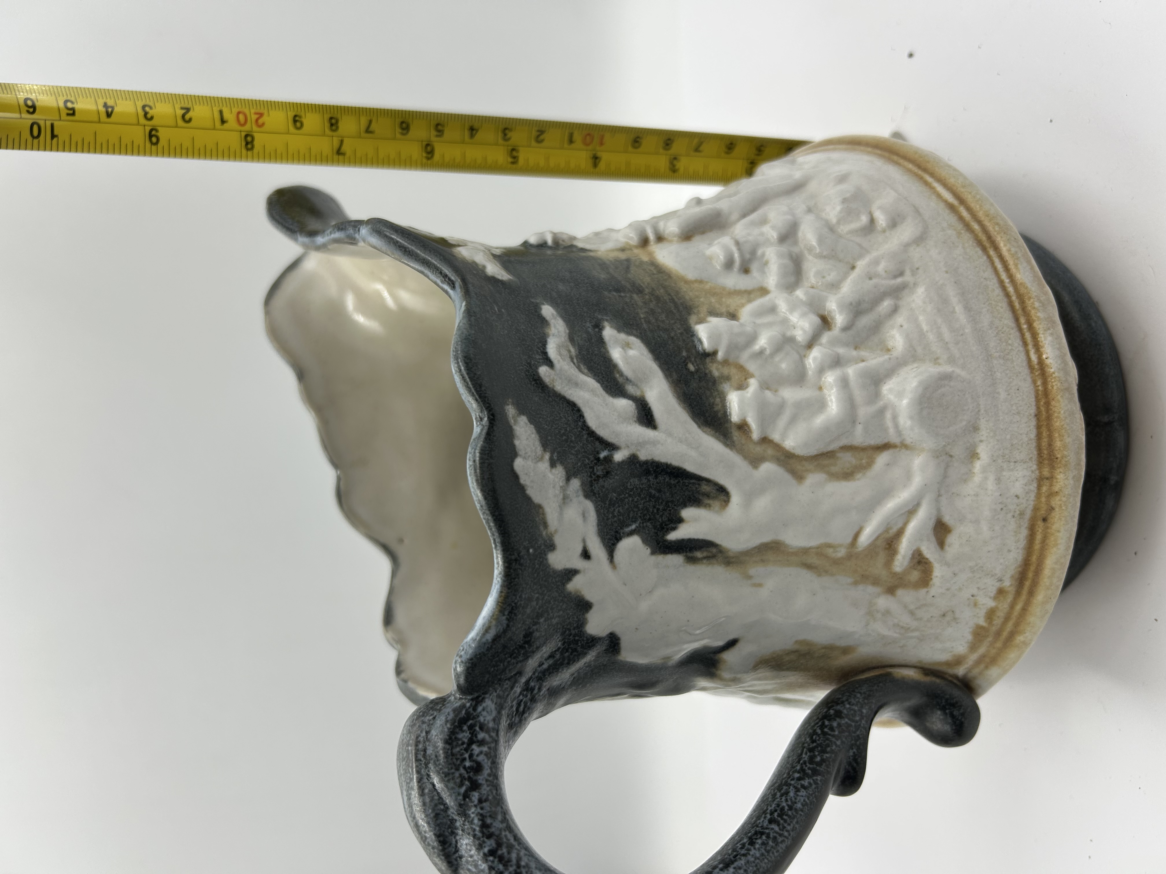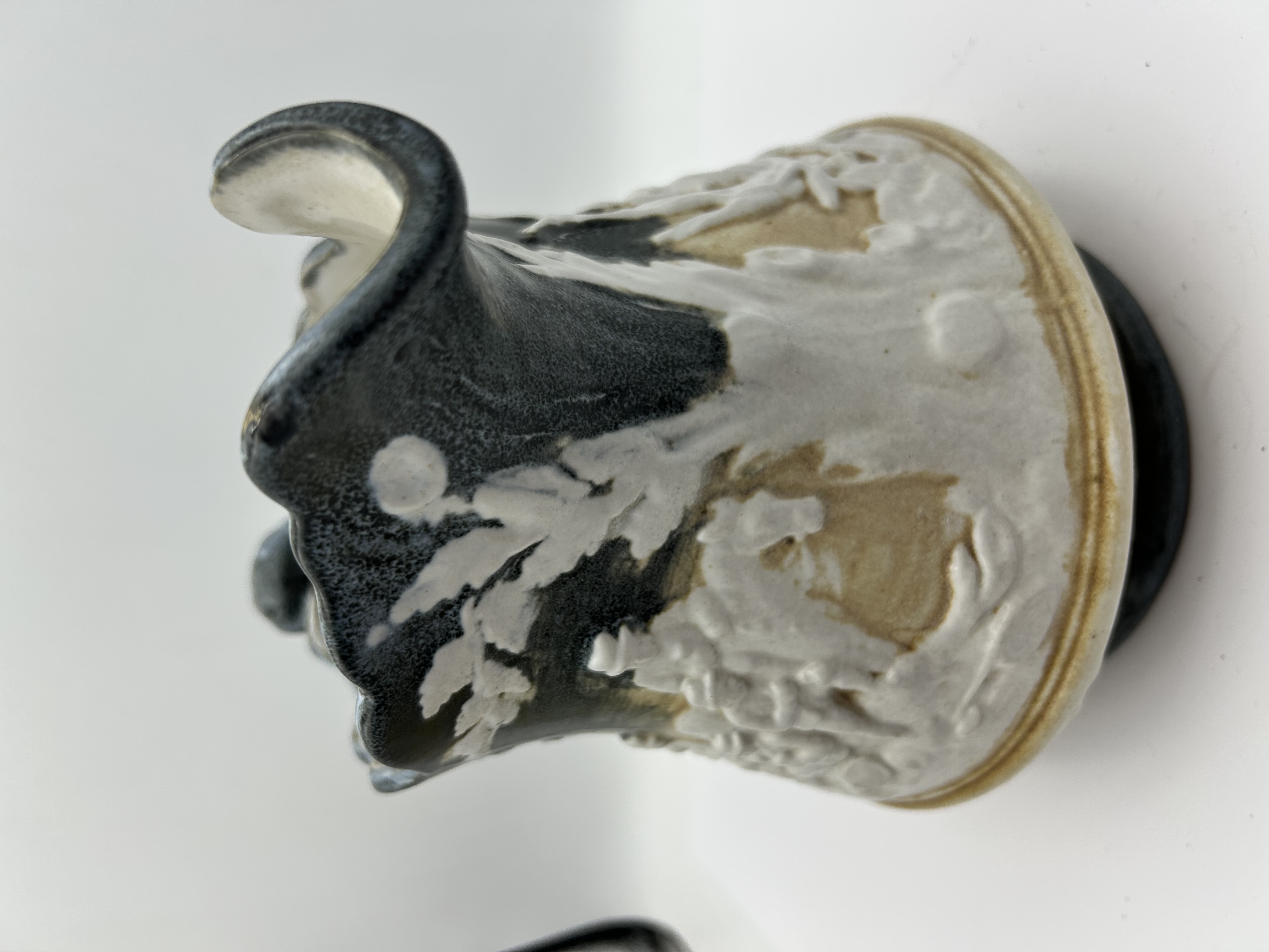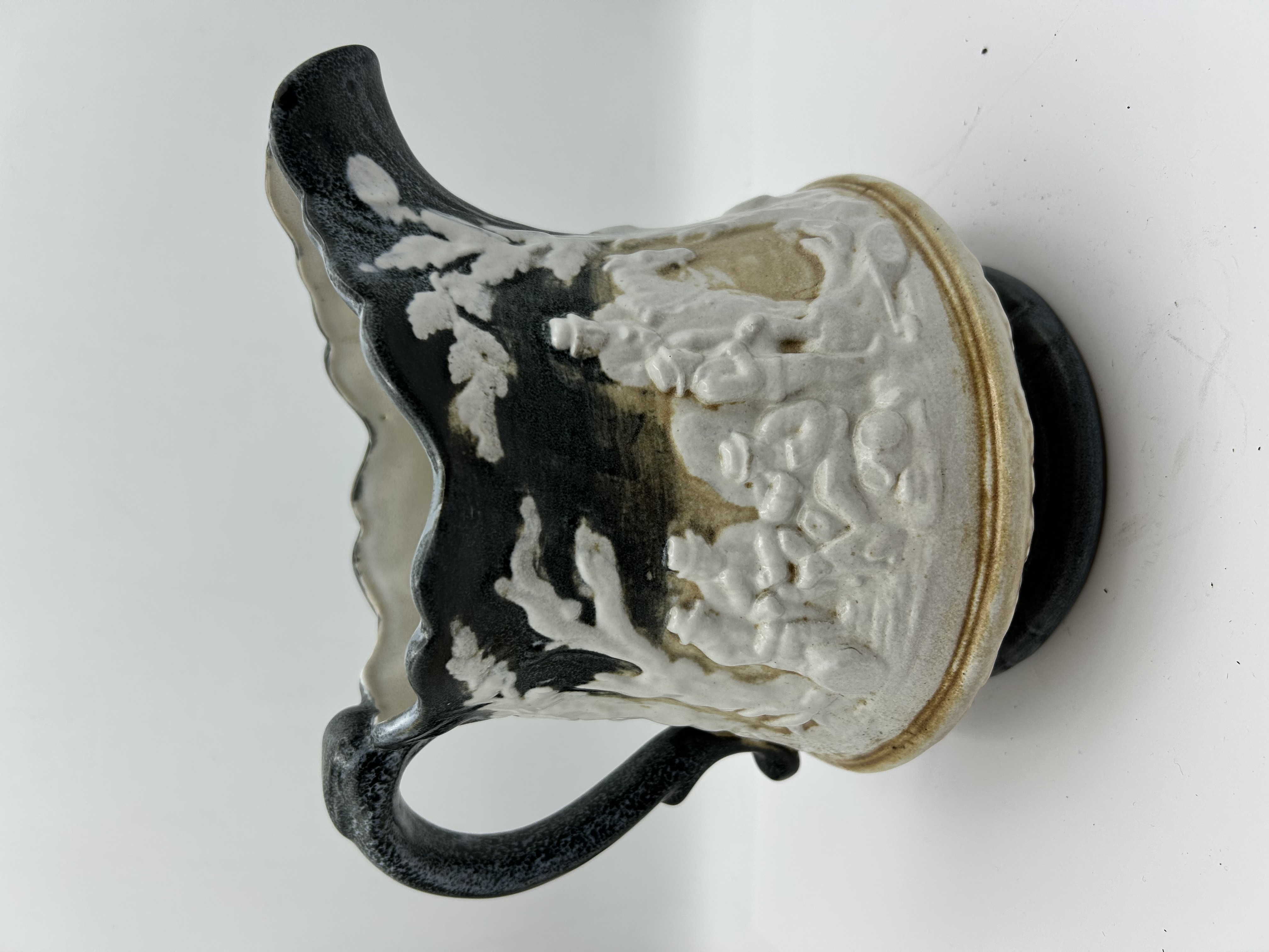 A relief-molded ceramic pitcher in the D’ye Ken John Peel pattern. The vessel features a dark charcoal-colored ground with cream-colored sprigged decoration. The body is adorned with high-relief scenes of figures in a landscape surrounded by oak leaf and branch motifs, finished with a decorative scrolled handle and a scalloped rim. No maker’s marks or signatures are visible.