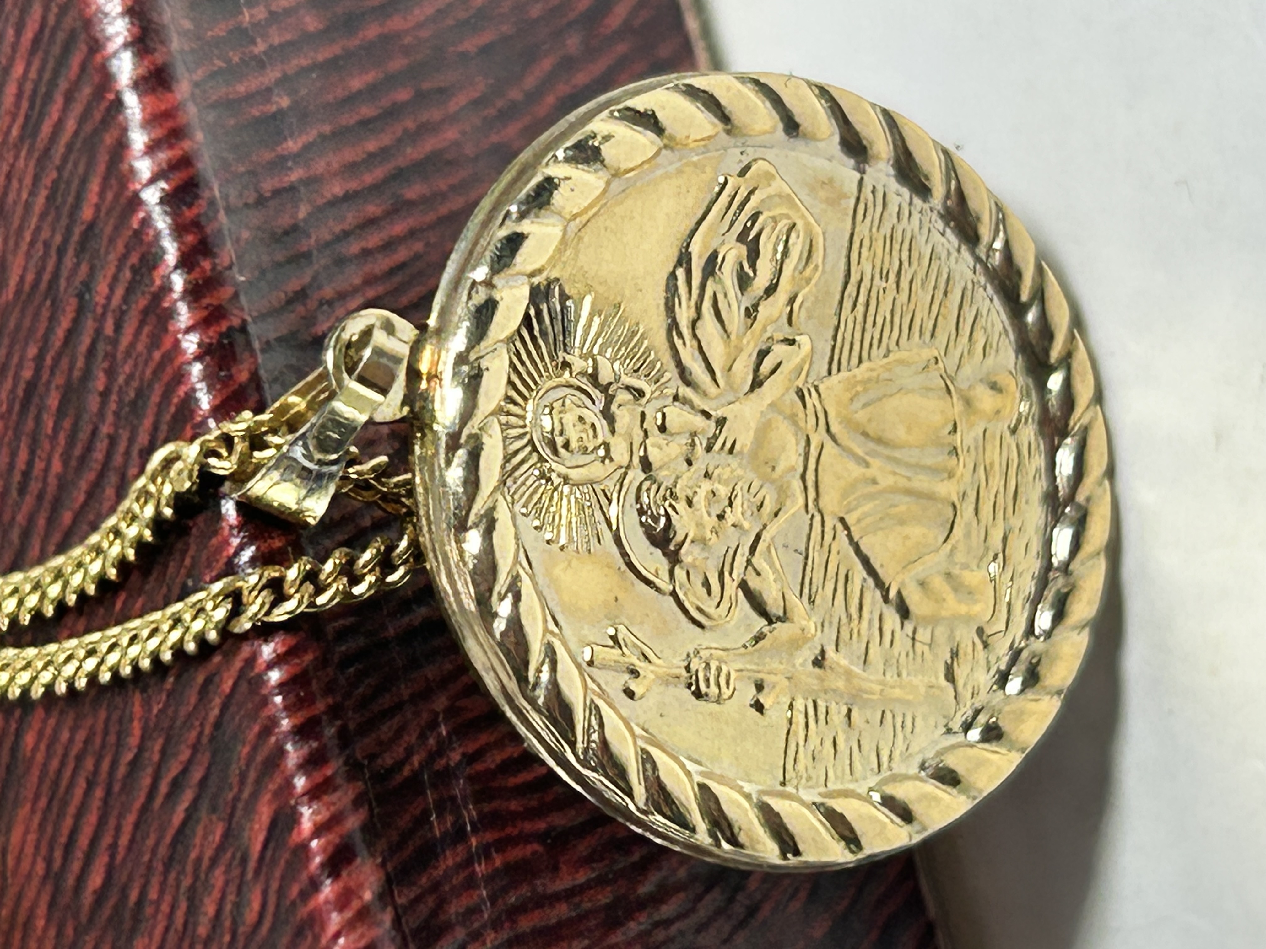 A 9ct yellow gold jewelry suite featuring a circular medallion pendant and a curb-link chain. The pendant depicts Saint Christopher carrying the Christ Child, set within a rope-twist border. The medallion is suspended from a hallmarked bail. The curb-link chain is secured by a spring-ring clasp.