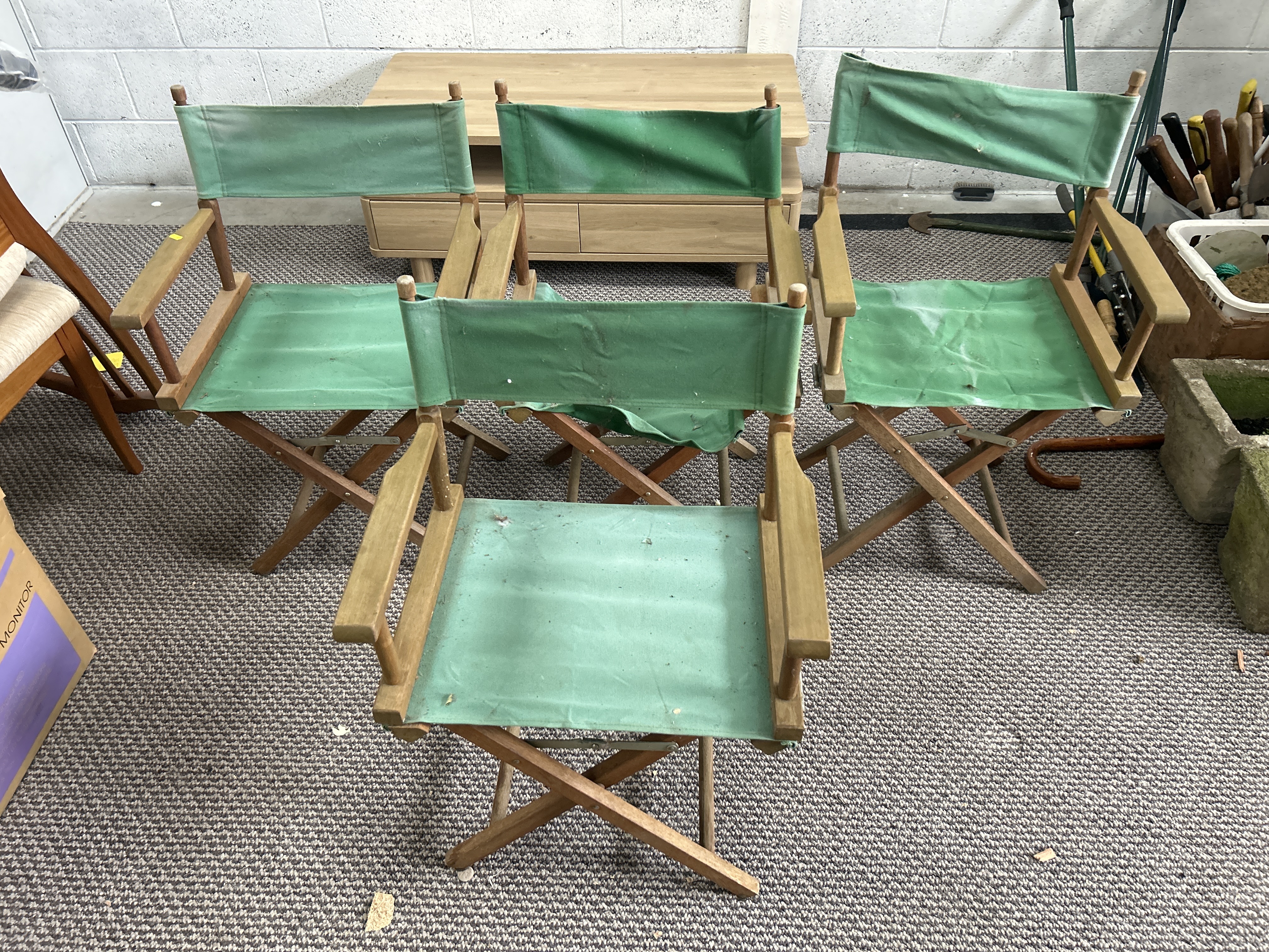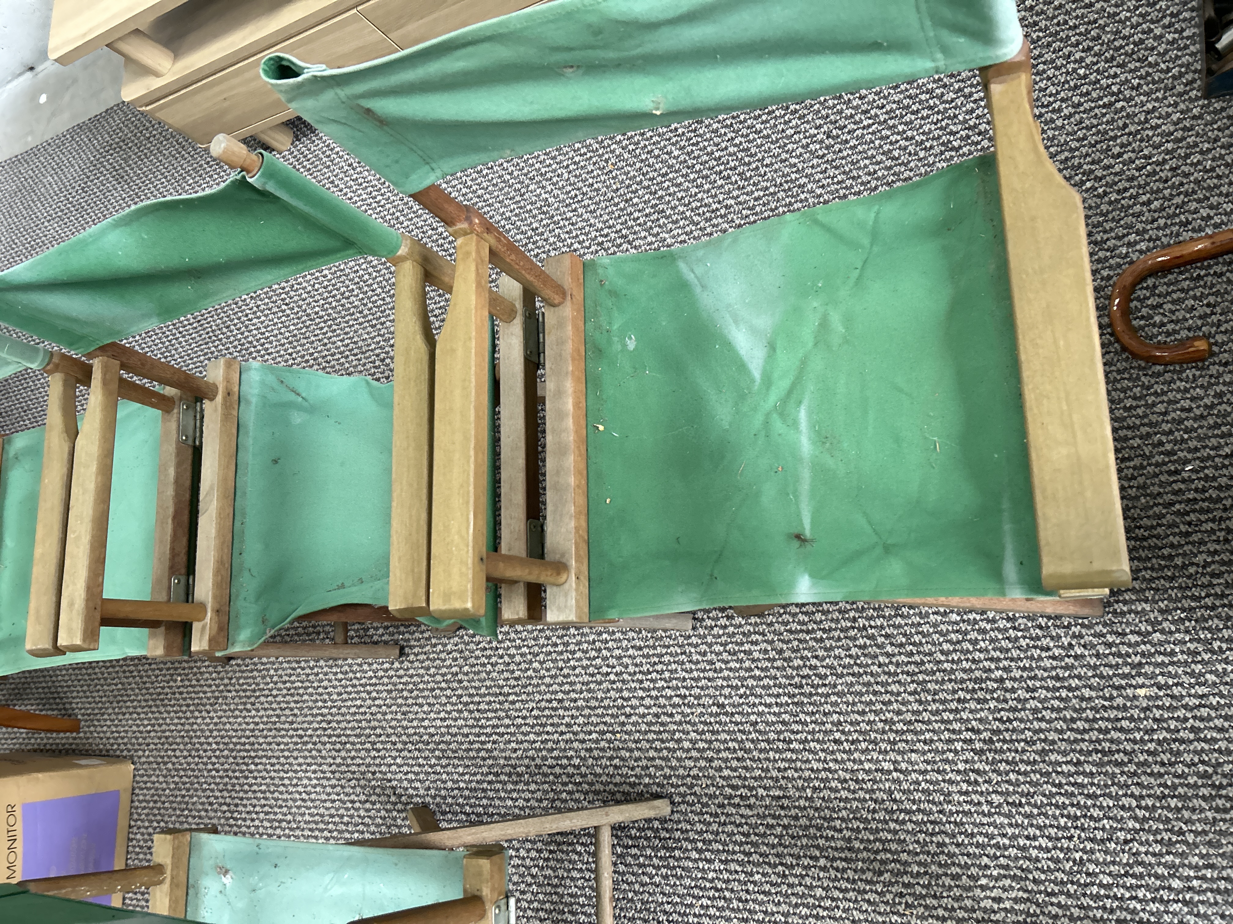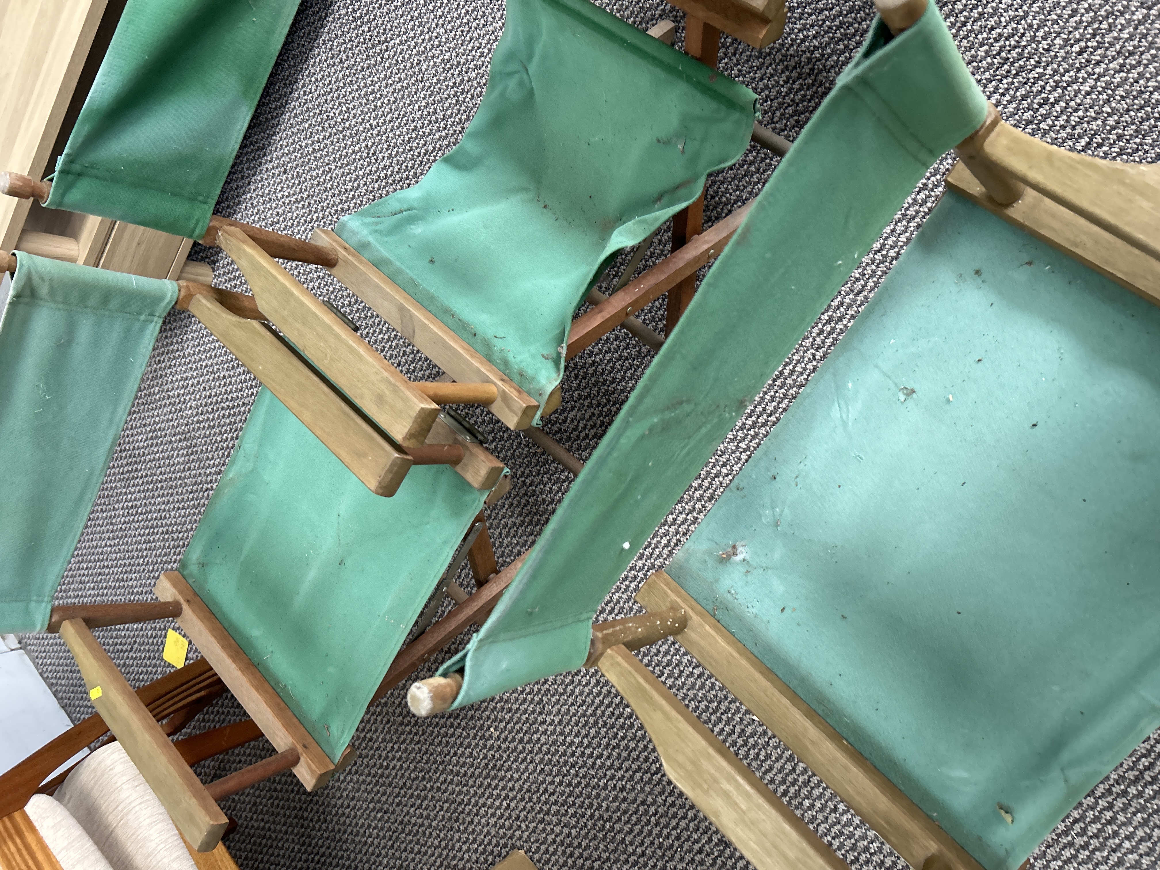 A set of folding director’s chairs featuring light-toned wooden frames and green canvas upholstery. The chairs are constructed in a classic X-frame folding style with integrated armrests and rounded wooden finials atop the backrest posts. No visible maker’s marks or labels are apparent on the frames or fabric.