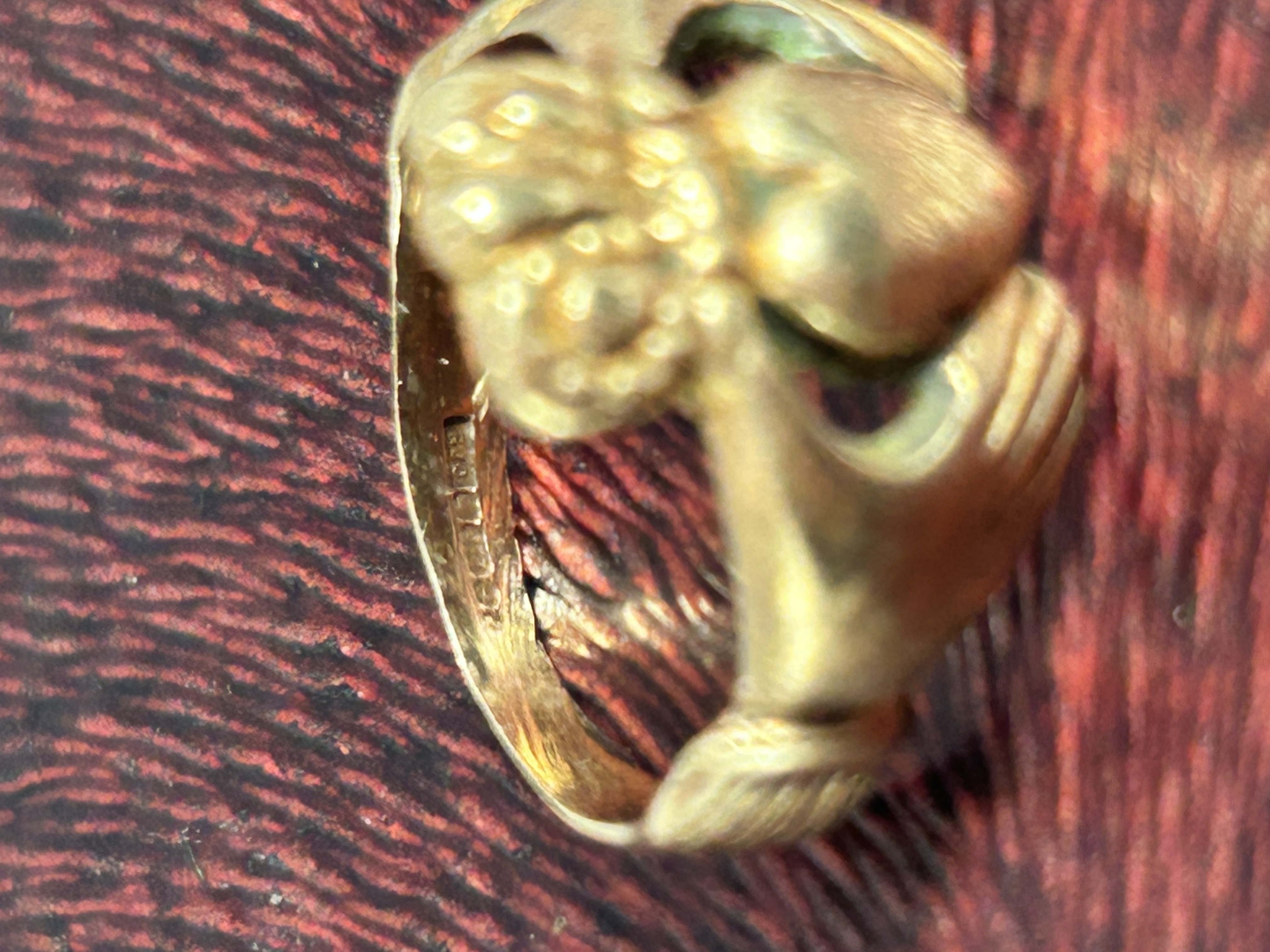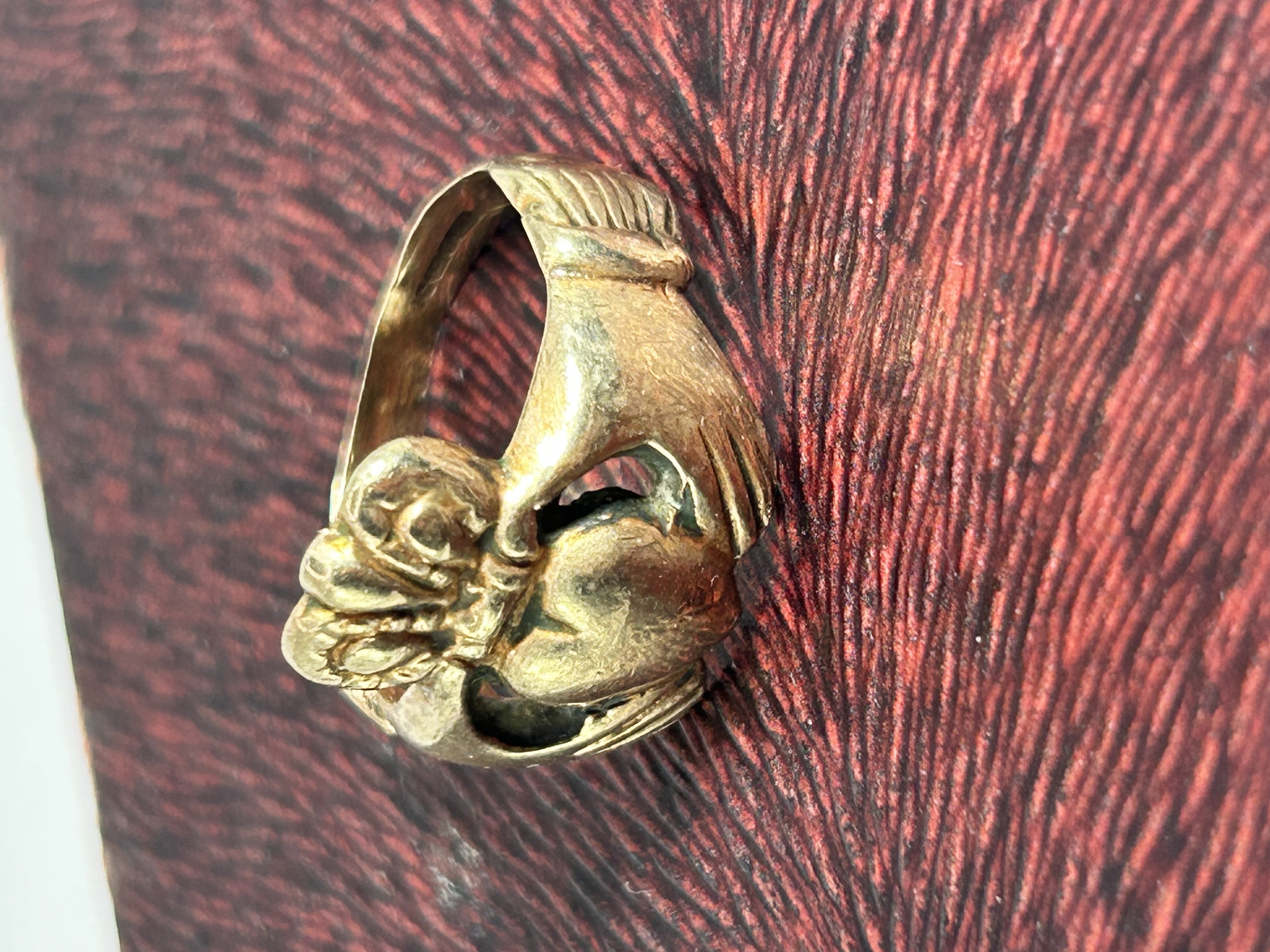This 9ct yellow gold Claddagh ring features the traditional Irish motif of two hands clasping a heart, surmounted by a crown. The shoulders of the ring are styled as wrists with textured cuff details. The interior of the band contains a hallmark.