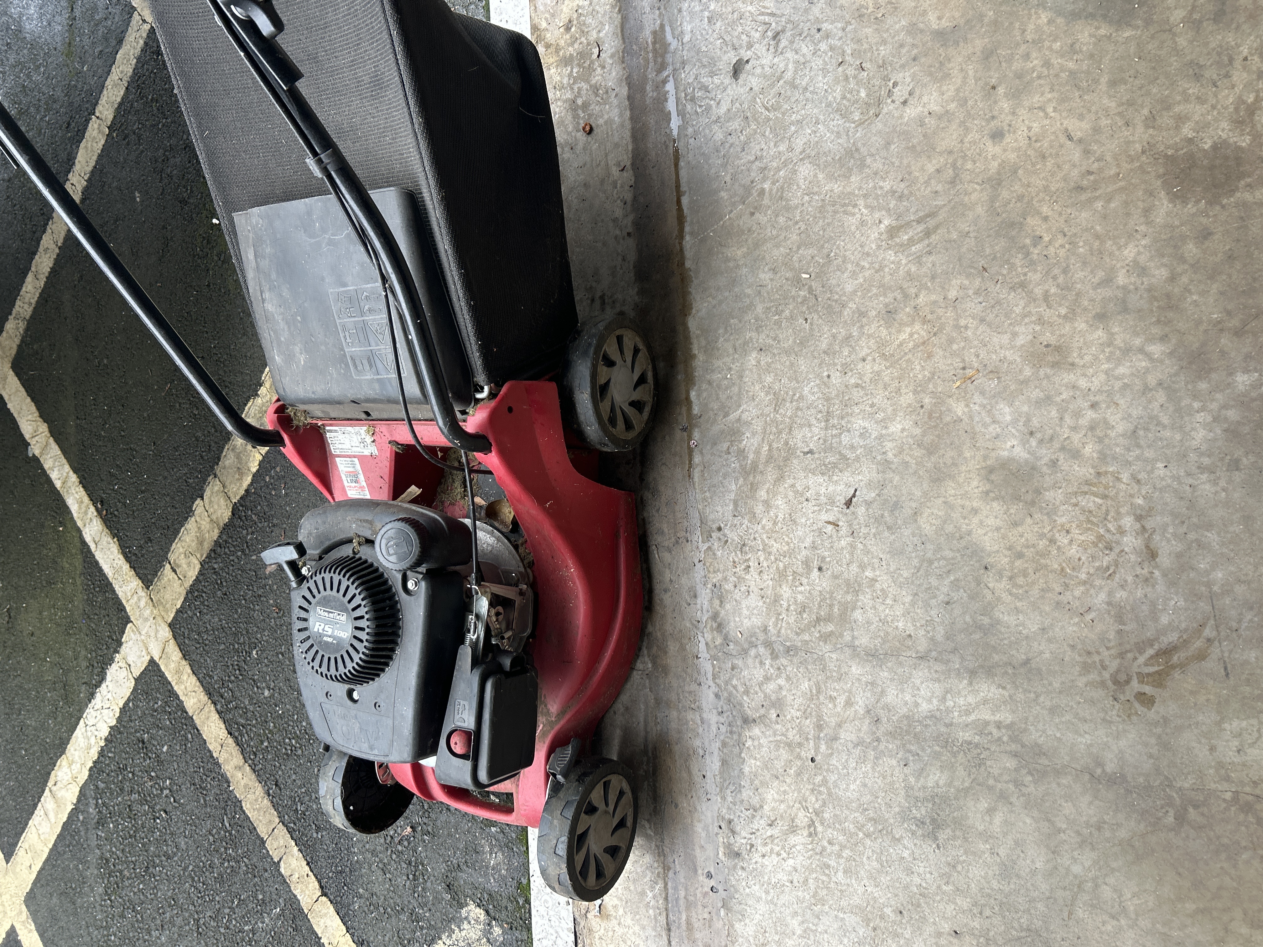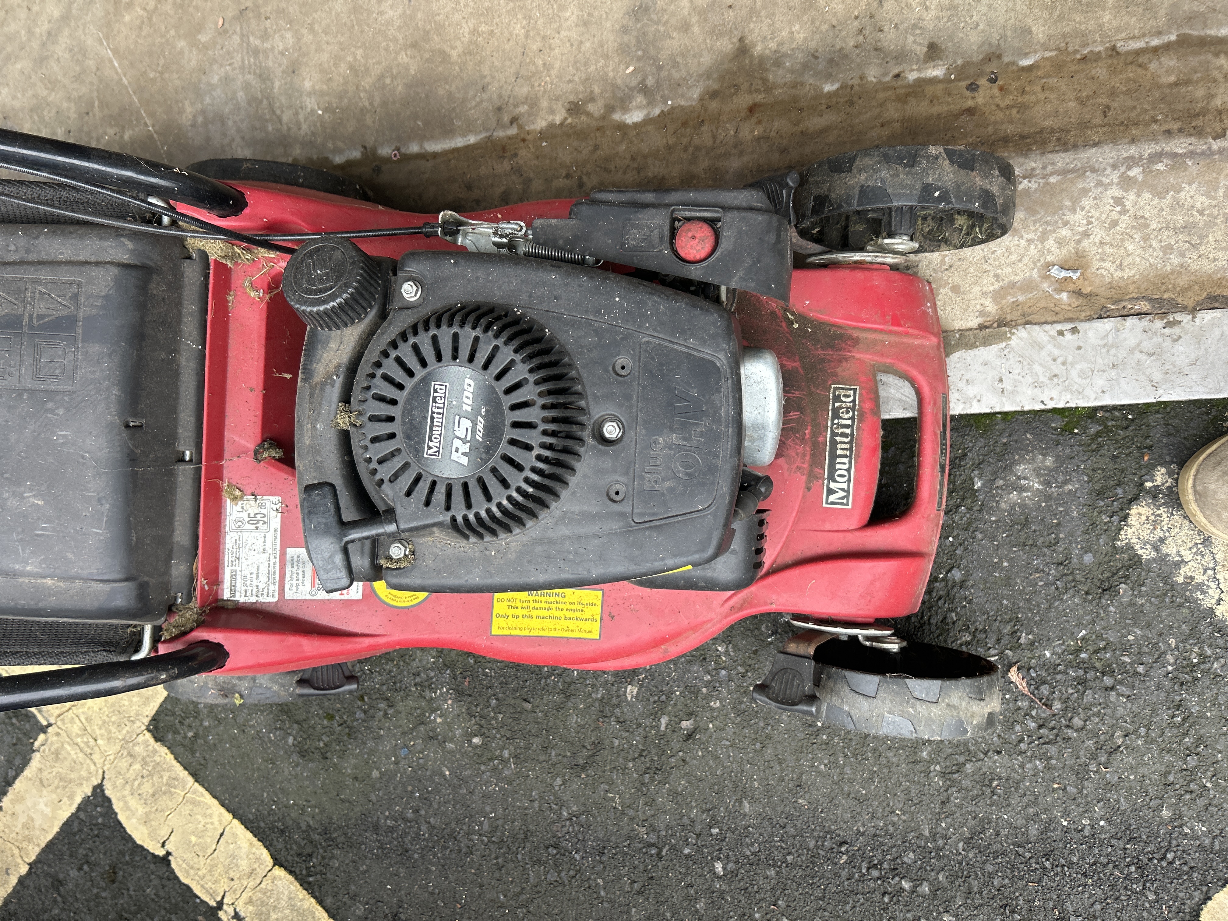 A Mountfield RS100 petrol-powered rotary lawnmower featuring a red housing and a 100cc Blue OHV engine. The unit is equipped with a black folding handle and a rear-mounted black fabric grass collection bag. Visible markings include the Mountfield brand name on the front and engine casing, along with model RS 100 and 100cc specifications. A yellow warning label and a technical information sticker indicating a 95 dB sound level are present on the body.