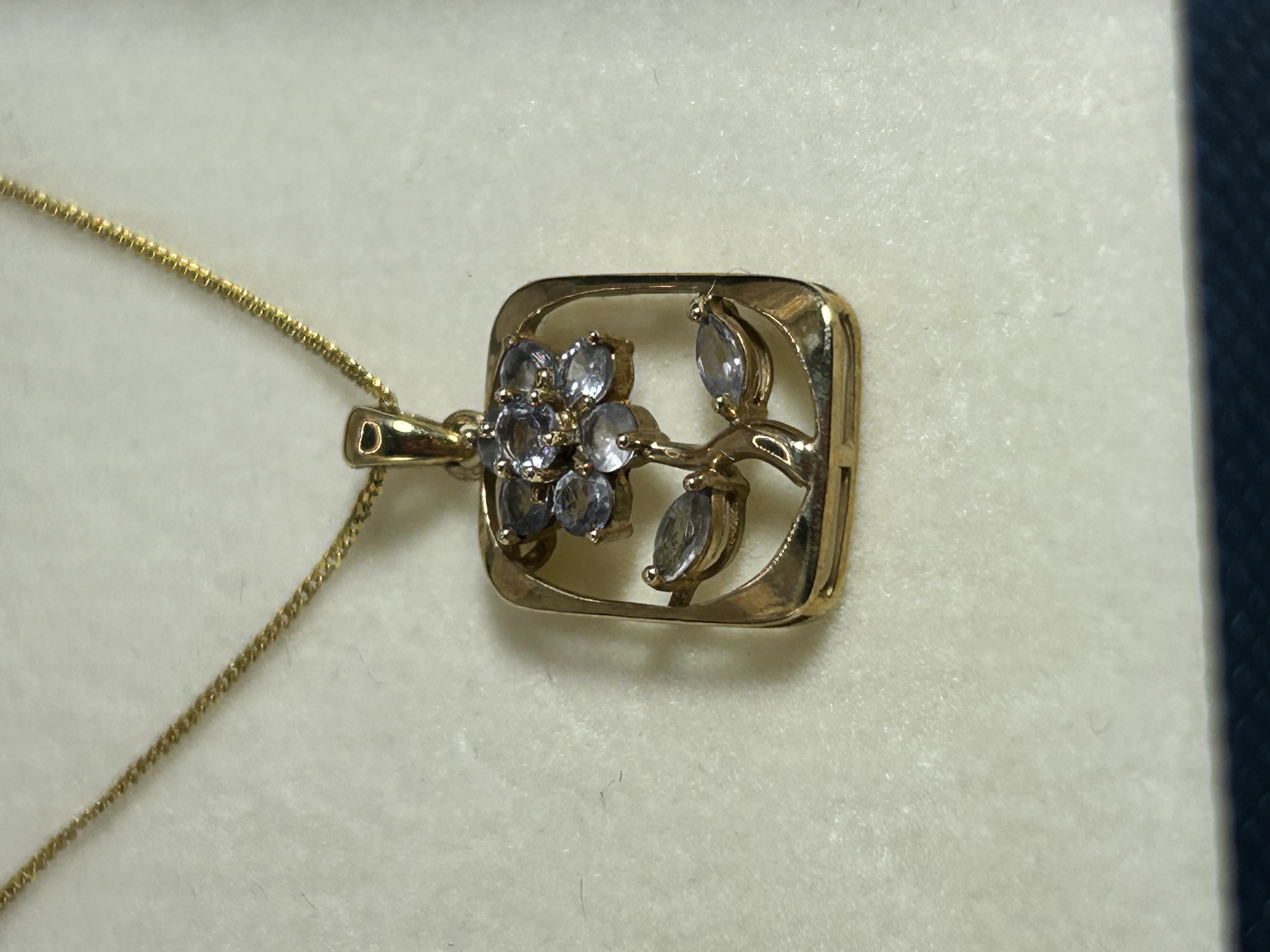 A gold-tone necklace featuring an open-work rectangular pendant with a stylized floral design. The pendant is set with several small, faceted, light-purple gemstones forming a central flower and two accented leaves. It is suspended from a fine-link gold-tone chain and is presented in a dark blue jewelry box with a cream-colored interior. A small, illegible hallmark or maker mark is present on the pendant bail.
