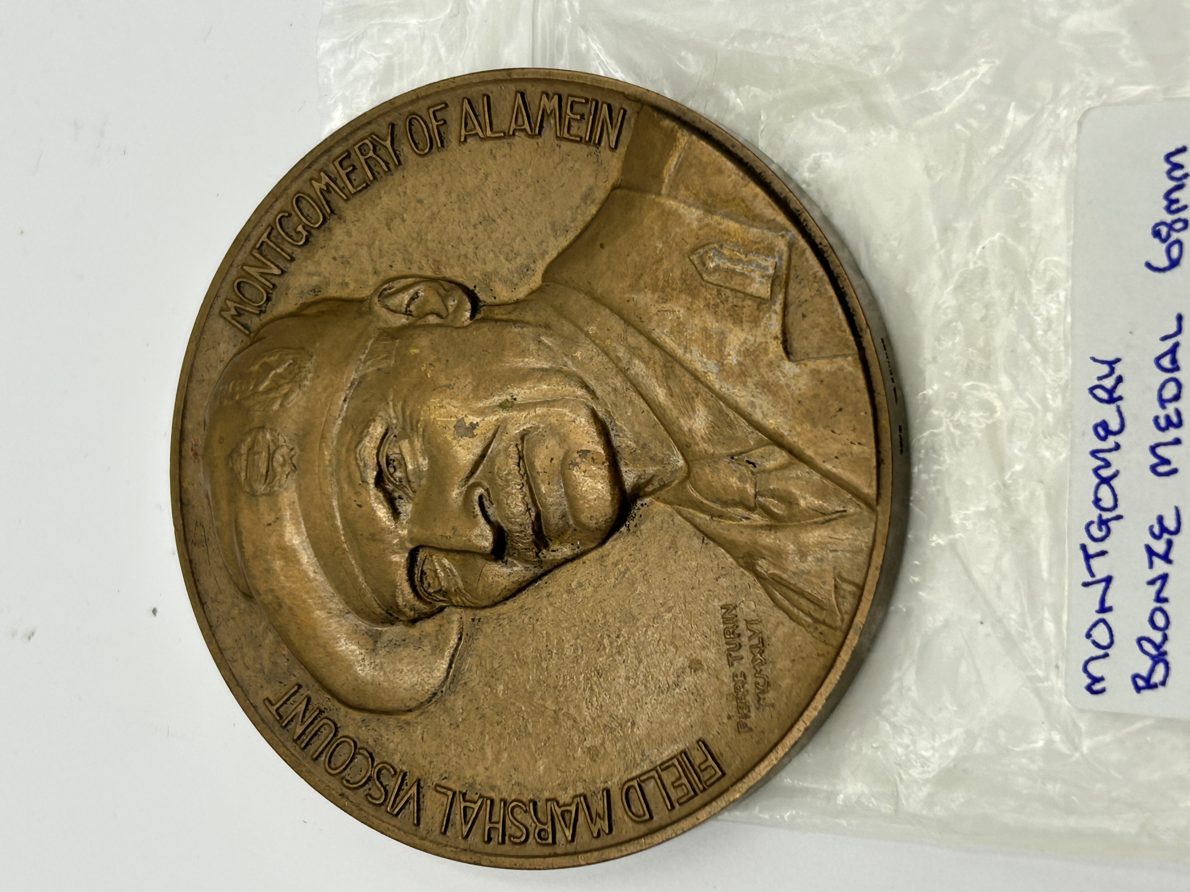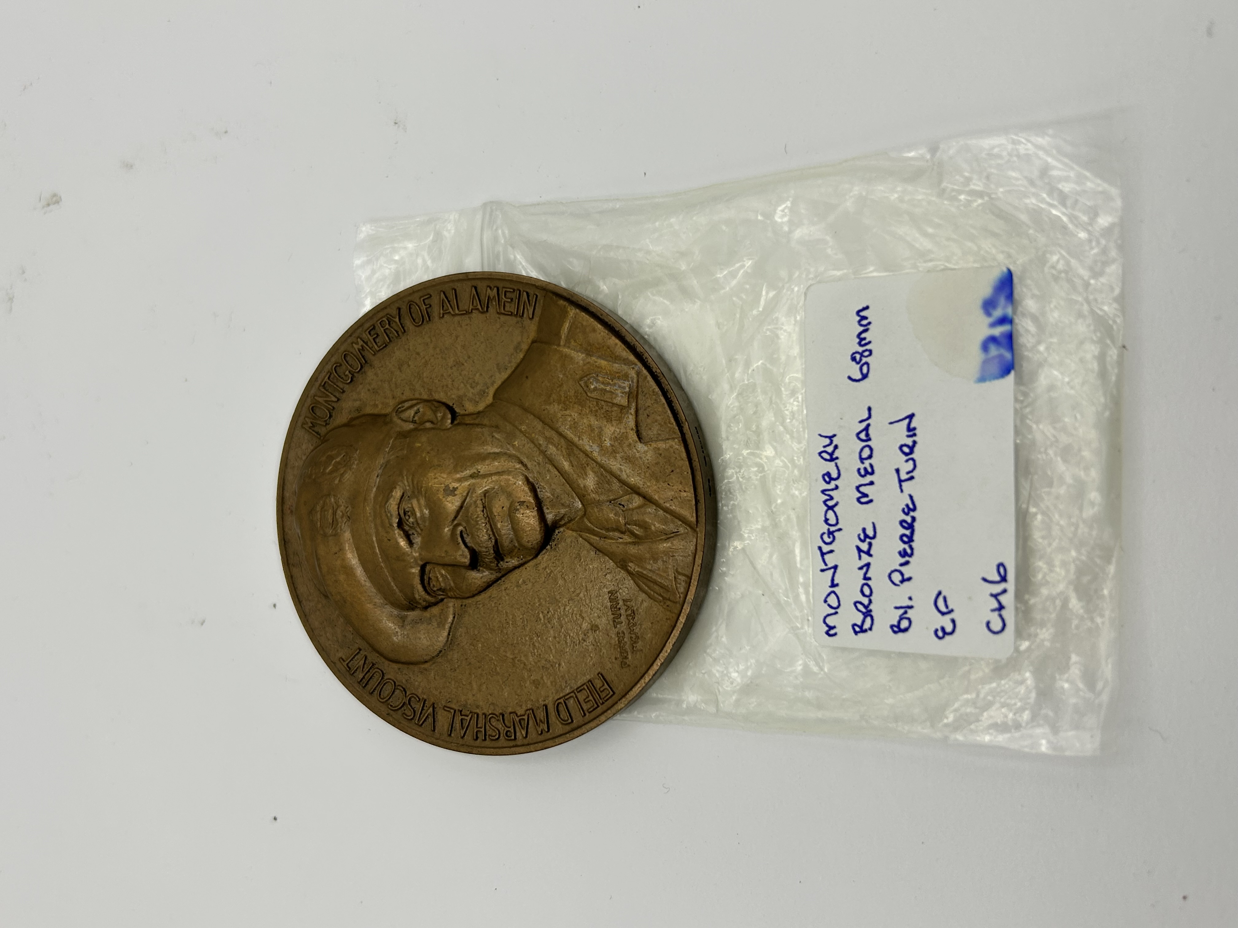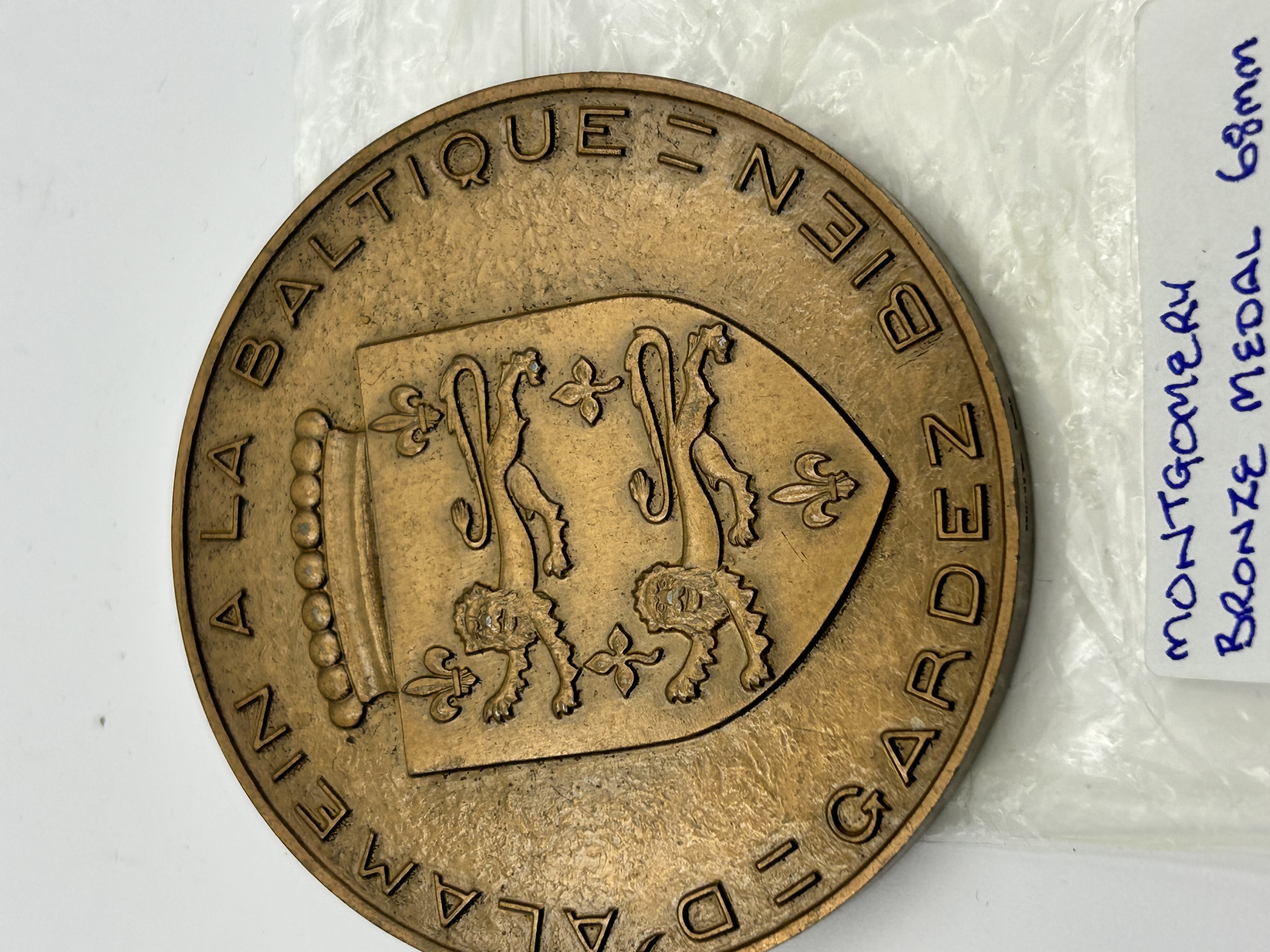 A large bronze commemorative medal featuring a high-relief profile portrait of Field Marshal Viscount Montgomery of Alamein on the obverse. The medal is signed by the artist Pierre Turin and dated MCMXLVI. The obverse is inscribed FIELD MARSHAL VISCOUNT MONTGOMERY OF ALAMEIN. The reverse depicts a heraldic shield featuring two lions and four fleurs-de-lis, surmounted by a coronet, and is encircled by the French inscription ALAMEIN A LA BALTIQUE = GARDEZ BIEN. The piece is accompanied by a small plastic storage bag and a handwritten identifying tag.