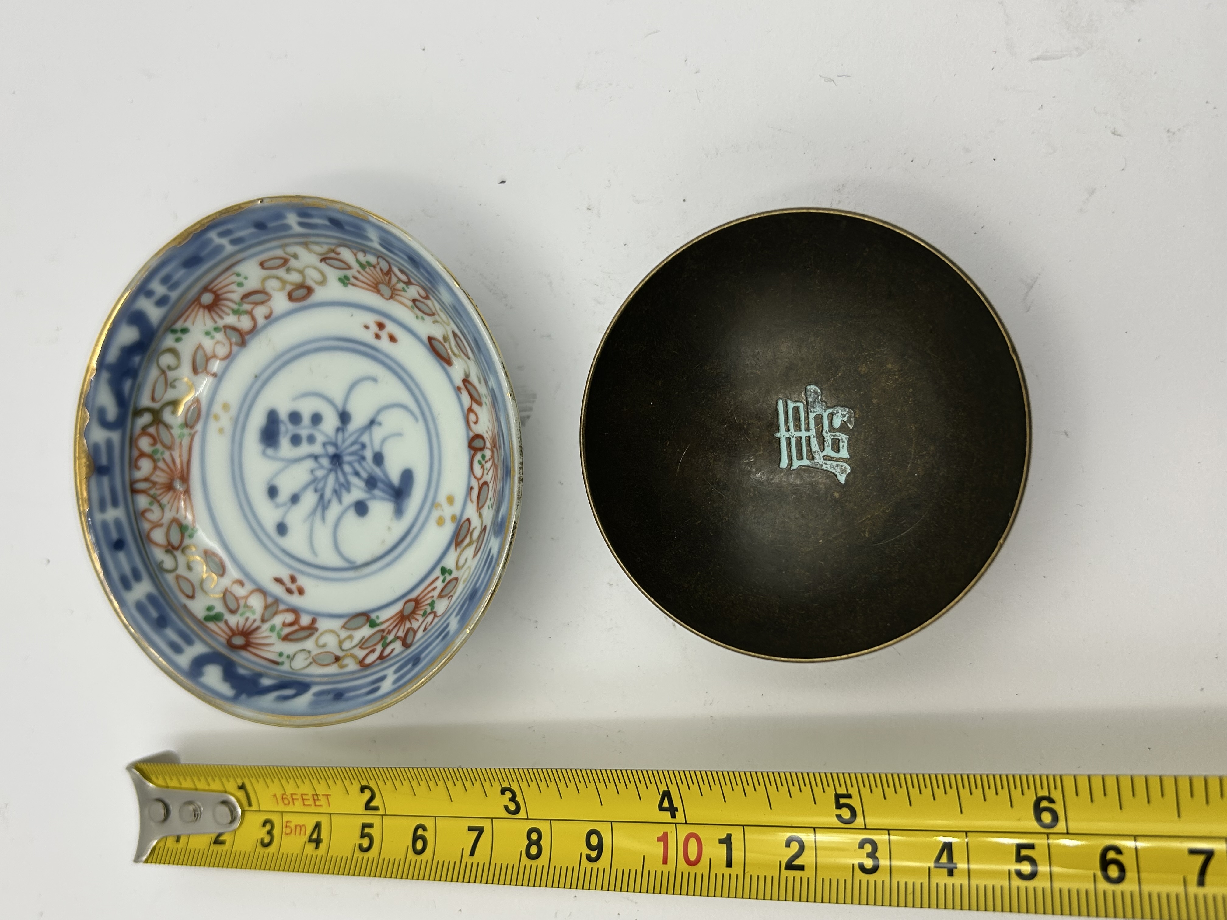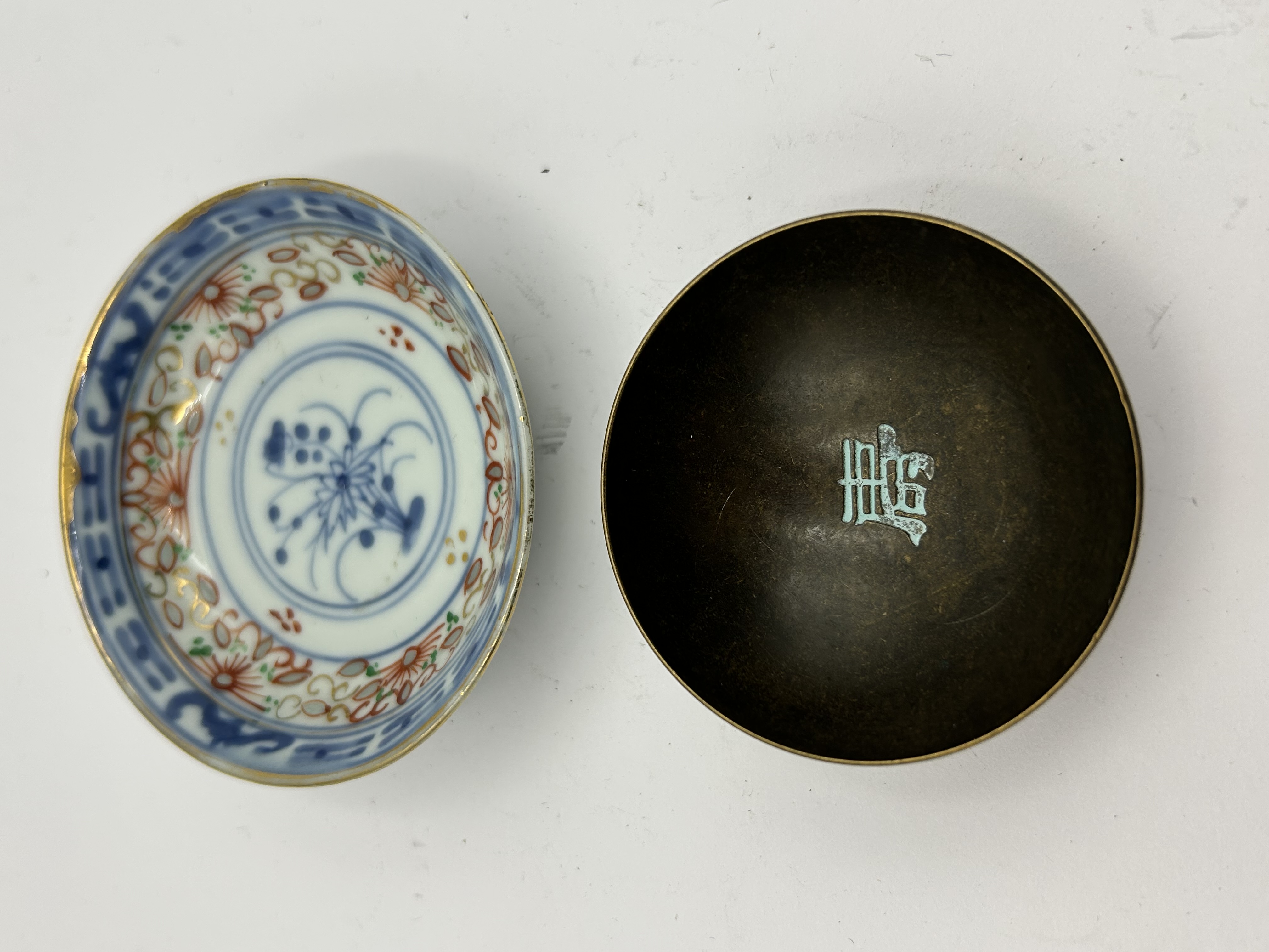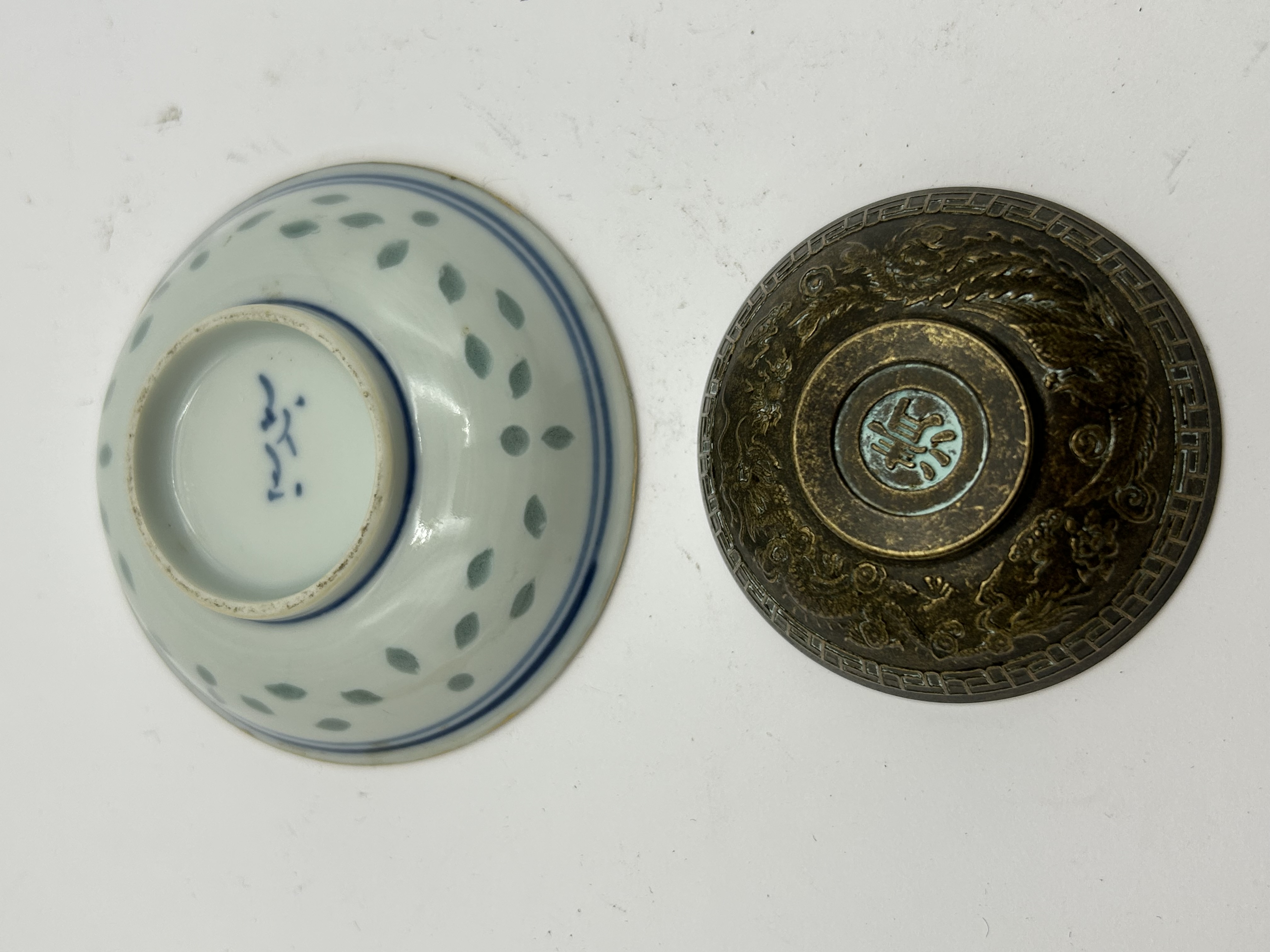 Two Chinese bowls including a porcelain rice-grain pattern example and a cast metal example. The porcelain bowl features a translucent rice-grain pattern on the exterior wall with an interior decorated in underglaze blue, iron-red, and gilt floral motifs. An underglaze blue mark is located on the recessed base. The metal bowl is cast with an exterior dragon and meander pattern, featuring a raised Chinese character for longevity (shou) on the interior and base. The metal exhibits a dark patina with turquoise-colored oxidation in the recessed markings.