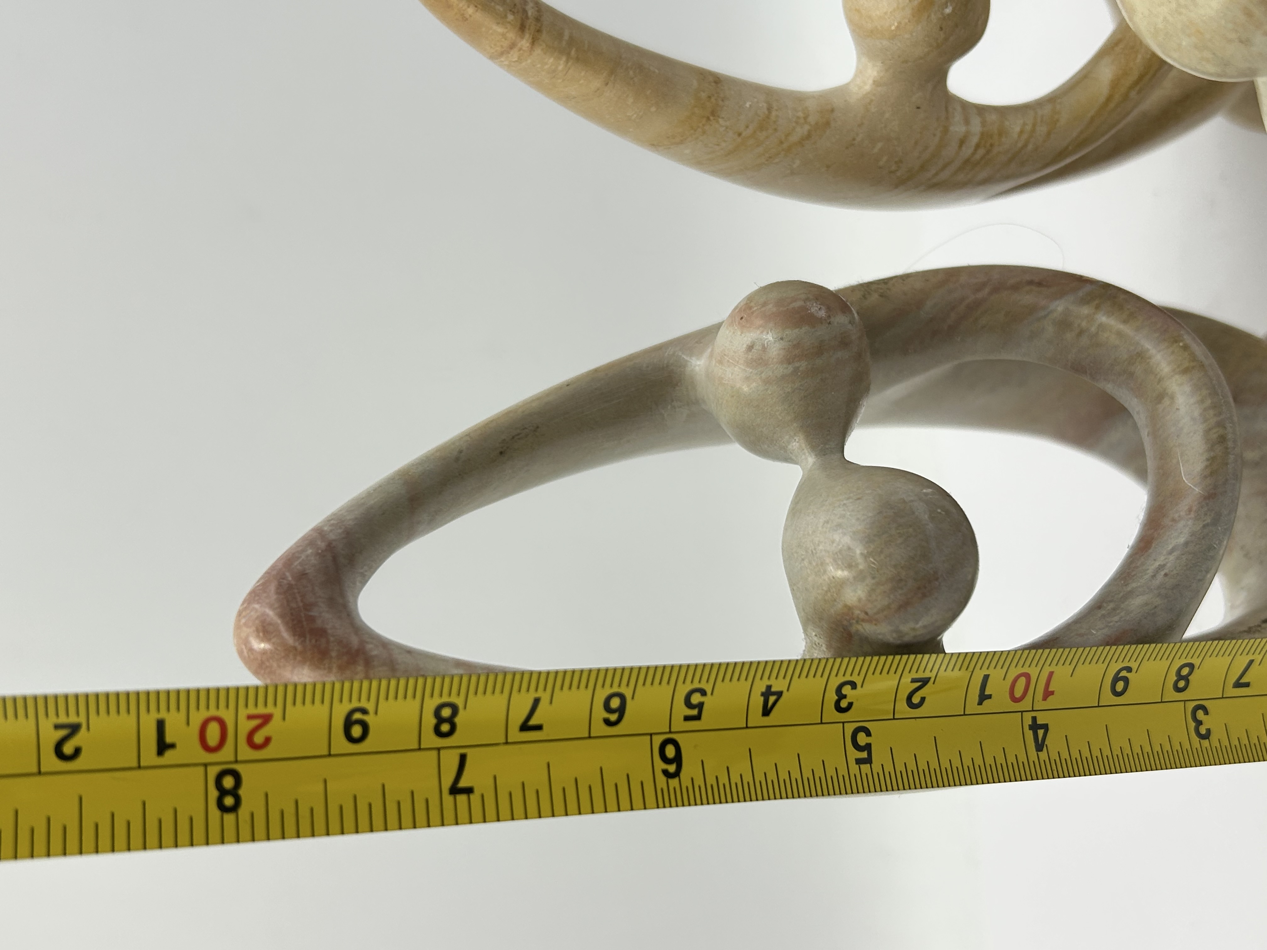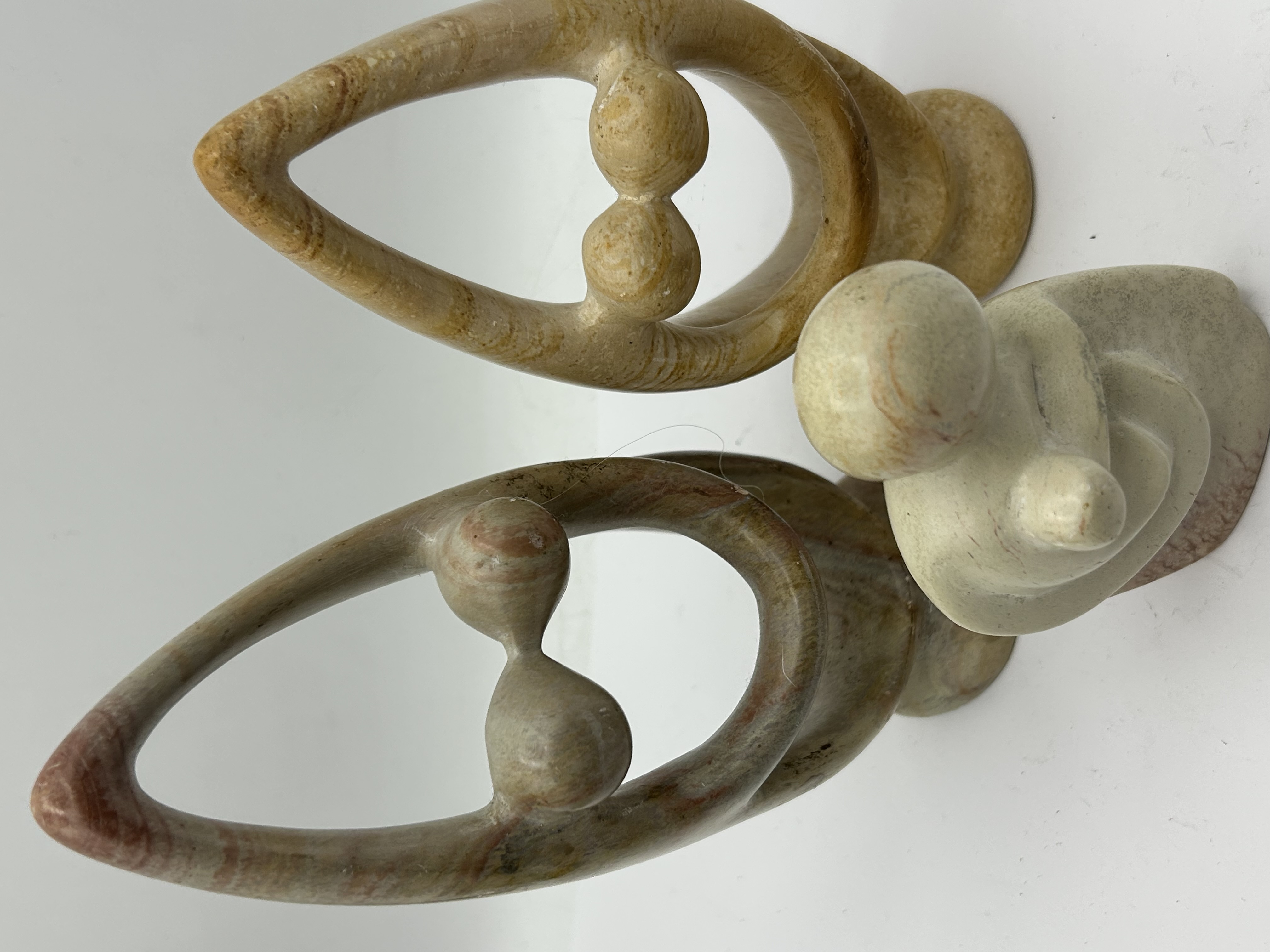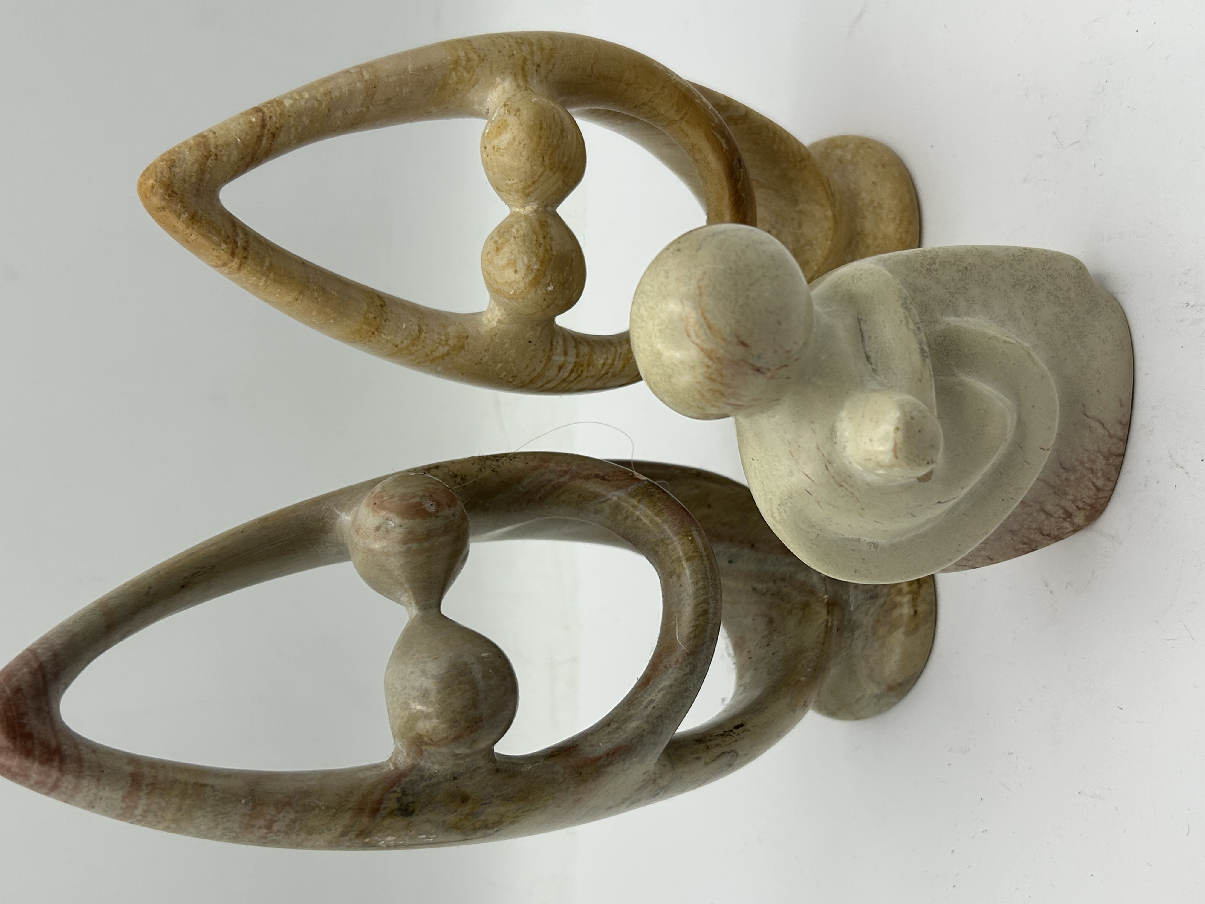 A trio of hand-carved soapstone sculptures originating from the Kisii region of Kenya. The collection includes two larger open-loop forms depicting stylized dual figures, commonly identified as family or lover motifs, and one smaller solid-bodied abstract figure. The pieces are carved from natural soapstone exhibiting a range of earth tones including creamy yellow, pale green, and grey-tan, with some pieces showing distinctive reddish-brown veining. Each sculpture features a smooth, polished finish and is designed with an integrated base. No visible artist marks or signatures are present on the items.