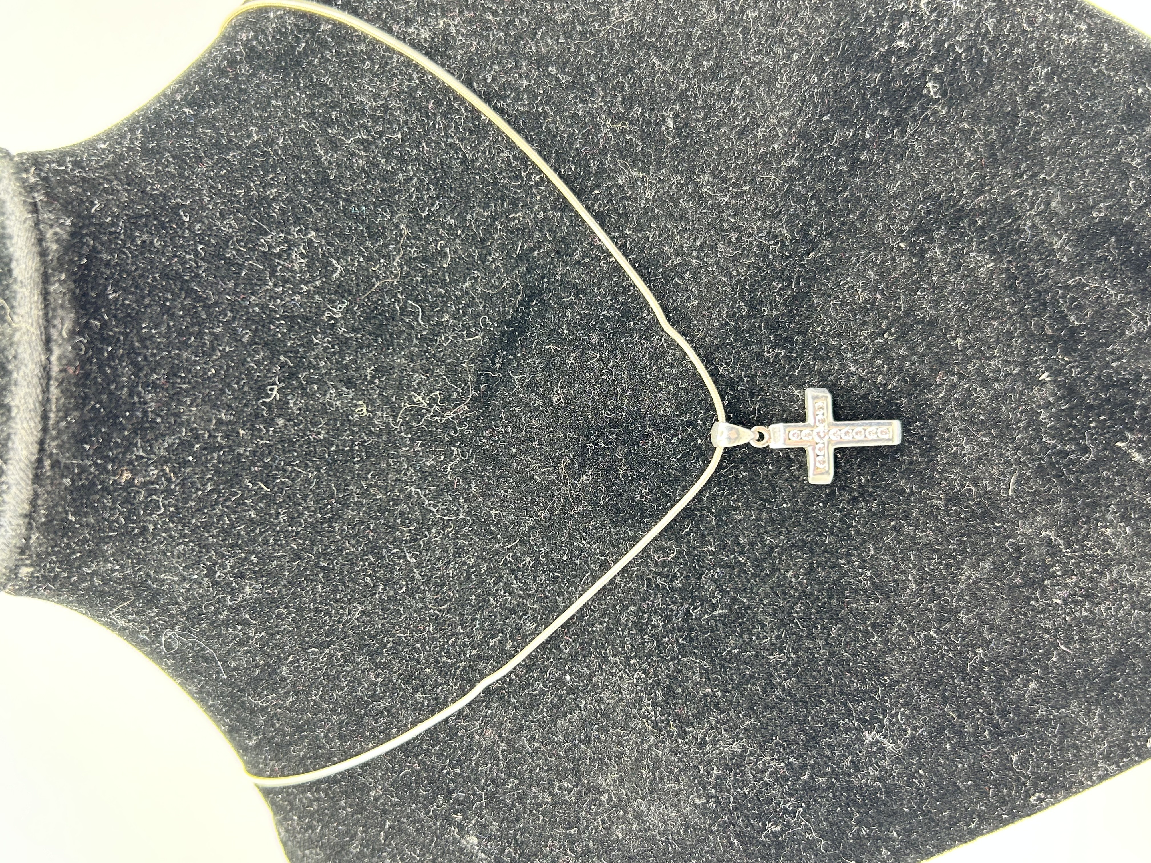 A silver-tone metal necklace featuring a cross pendant set with a row of round brilliant-cut stones. The pendant is suspended from a fine snake chain. The piece is of a modern style with a polished finish and is presented on a black velvet display bust. No hallmarks are visible to confirm metal or stone composition.