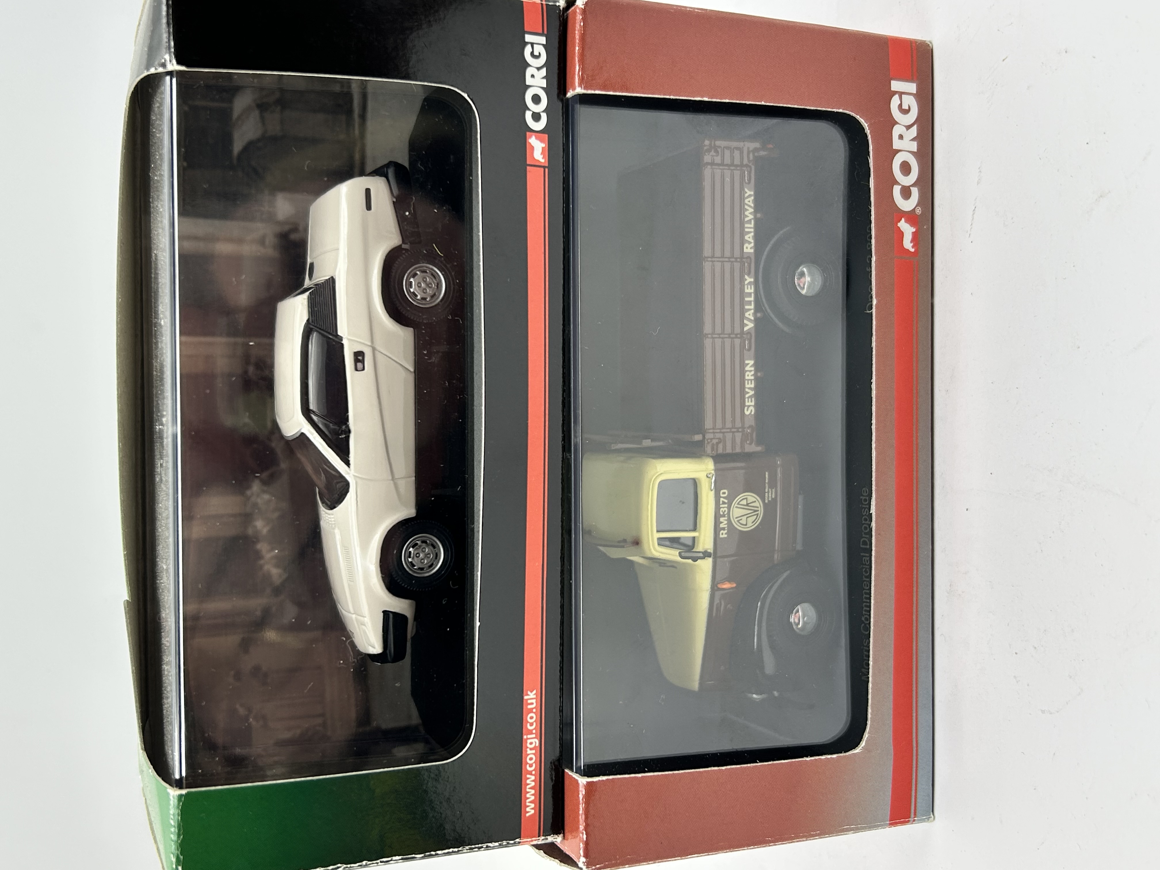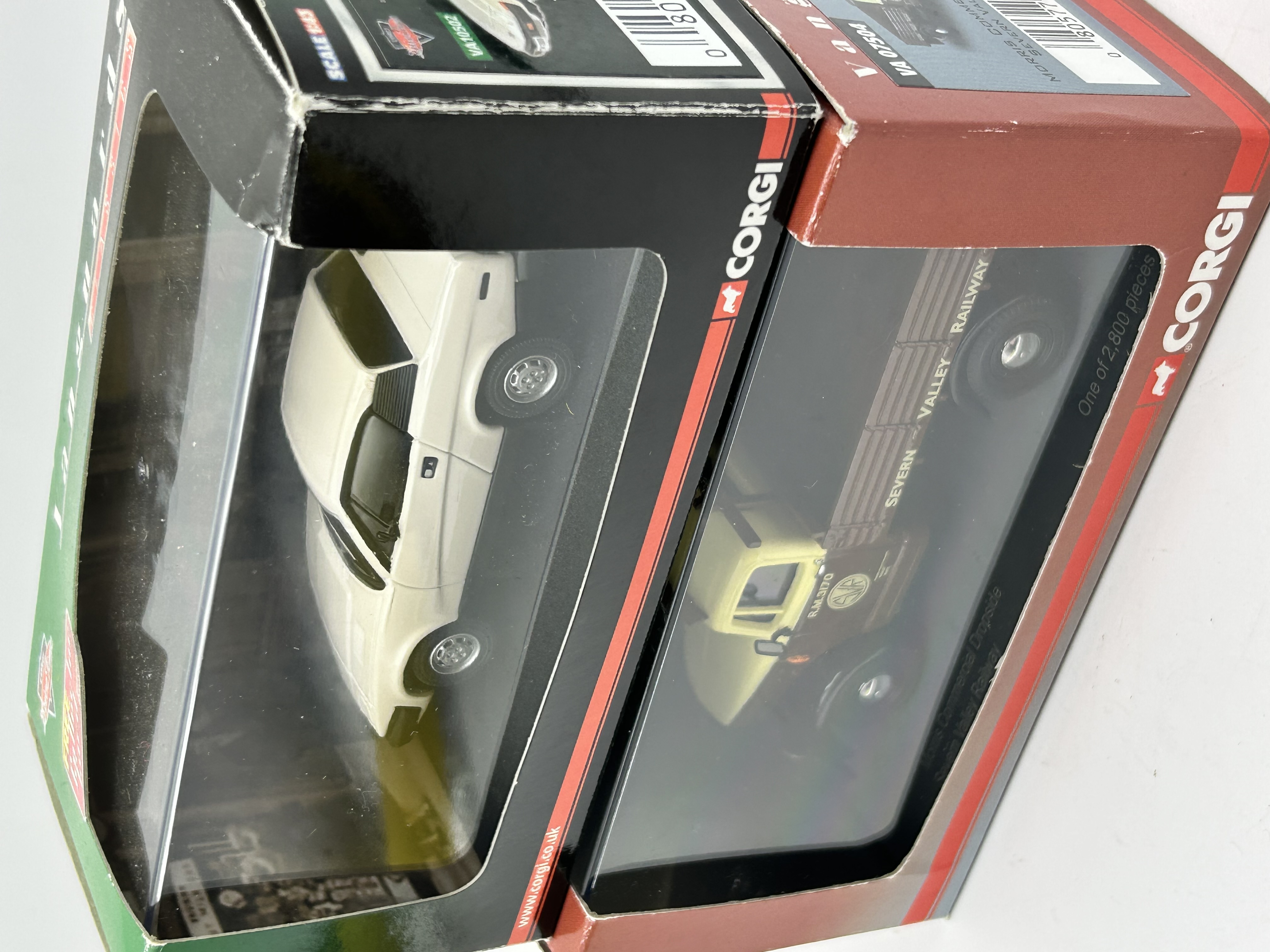 A pair of Corgi Vanguards die-cast model vehicles in original window display boxes. The lot includes a 1:43 scale Lotus Esprit Turbo, model VA10502, in a white finish. Also present is a Morris Commercial Dropside truck, model VA07504, in Severn Valley Railway livery. The truck features a brown and cream paint scheme with Severn Valley Railway and R.M. 3170 printed on the side alongside the SVR logo. The truck packaging identifies the model as a limited edition of 2,800 pieces.