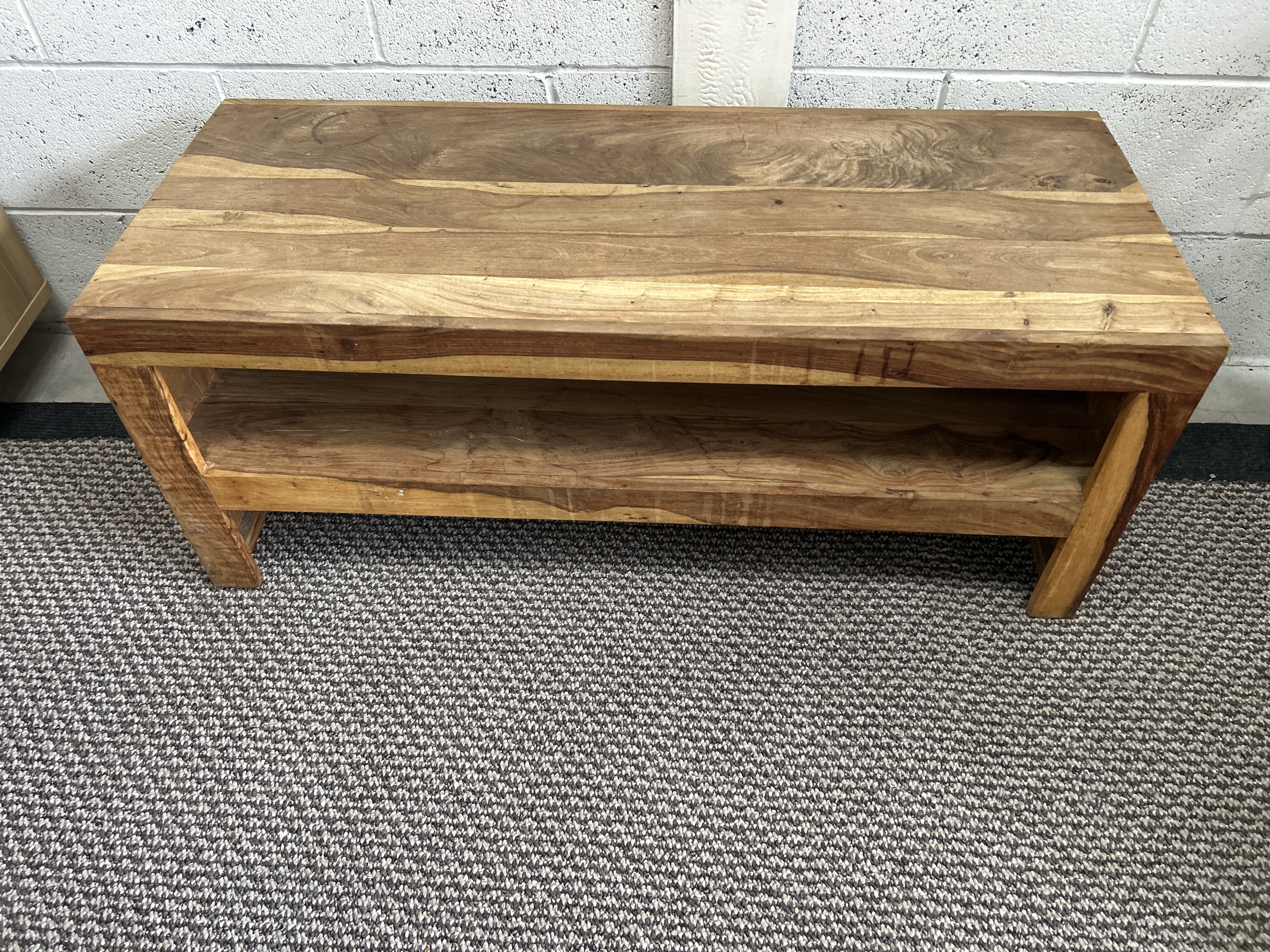 A Porter Designs Sonora Harvest collection coffee table or media console constructed from solid Sheesham hardwood. The piece features a prominent variegated natural grain with contrasting light and dark tones throughout. Designed in a chunky minimalist style, the table comprises a thick rectangular top over an open full-length storage shelf, supported by solid block legs. There are no visible manufacturer labels or markings.