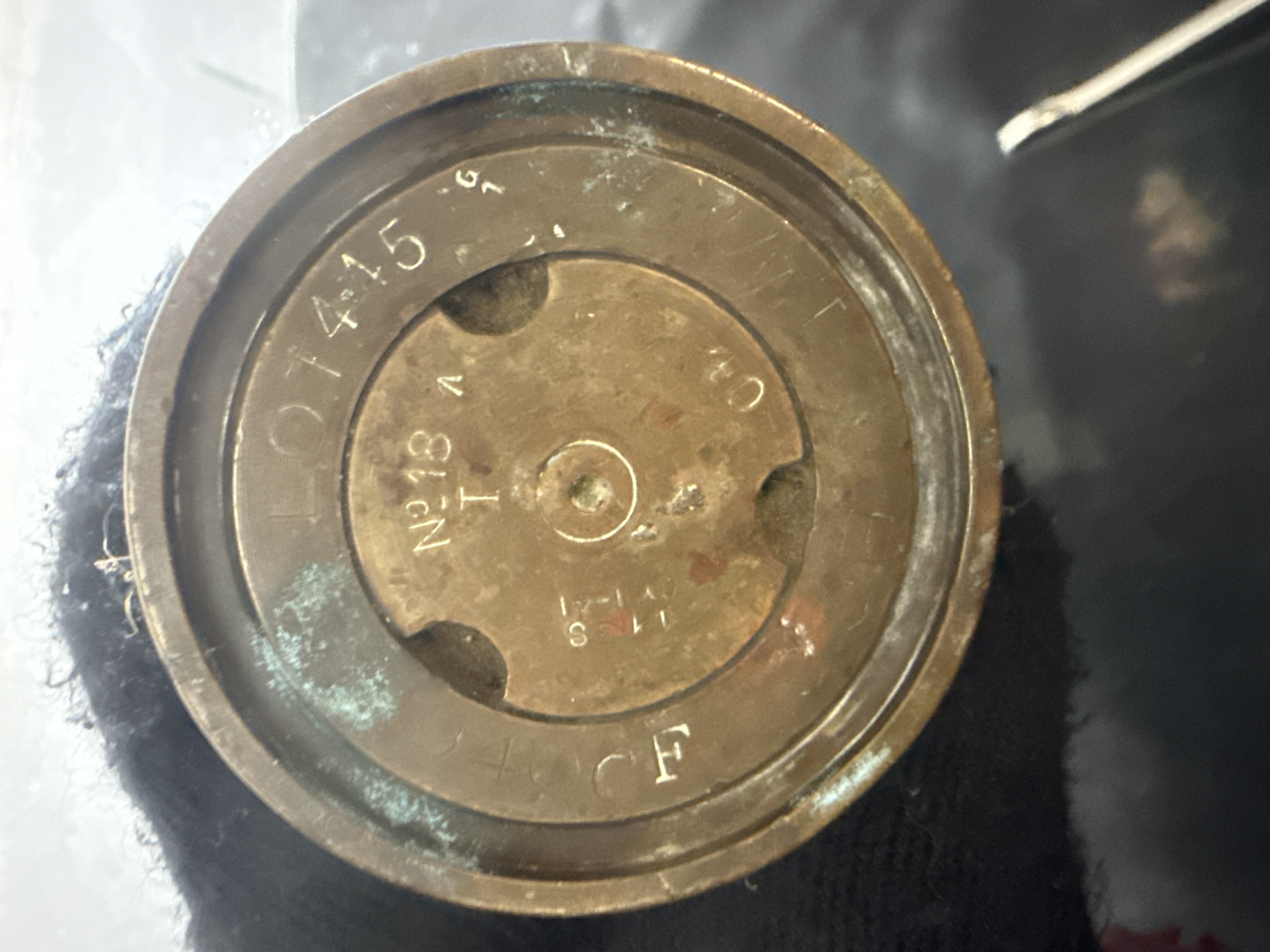 British World War II era 2-pounder 40mm brass artillery shell casing. This 12 inch cylindrical brass body features a flared base with a detailed headstamp. Markings include LOT 415 G, No 18, the British broad arrow symbol, 40, and 40 CF. The central primer is marked II S and Y-1-41. This item is inert and intended for display or collection.