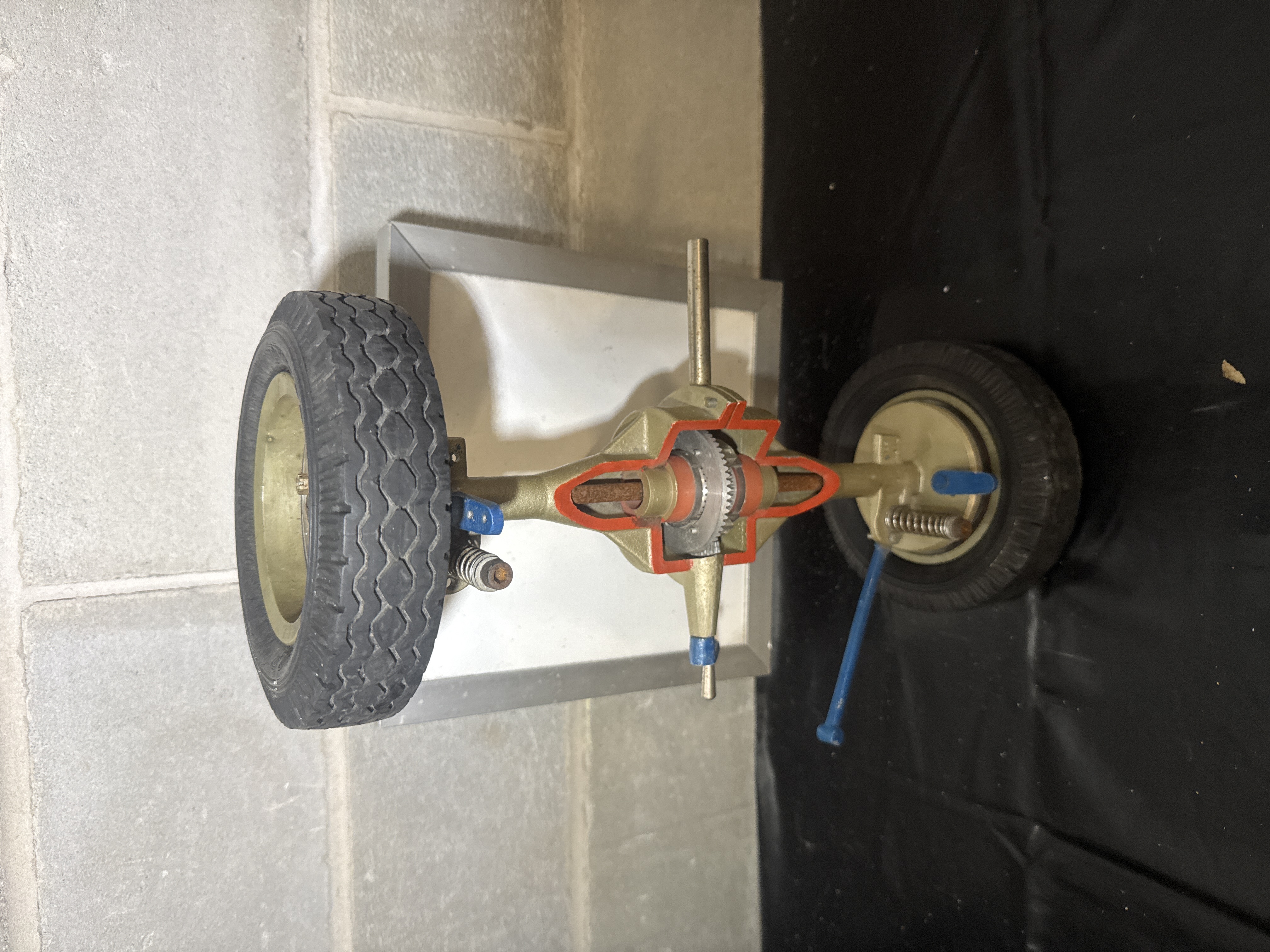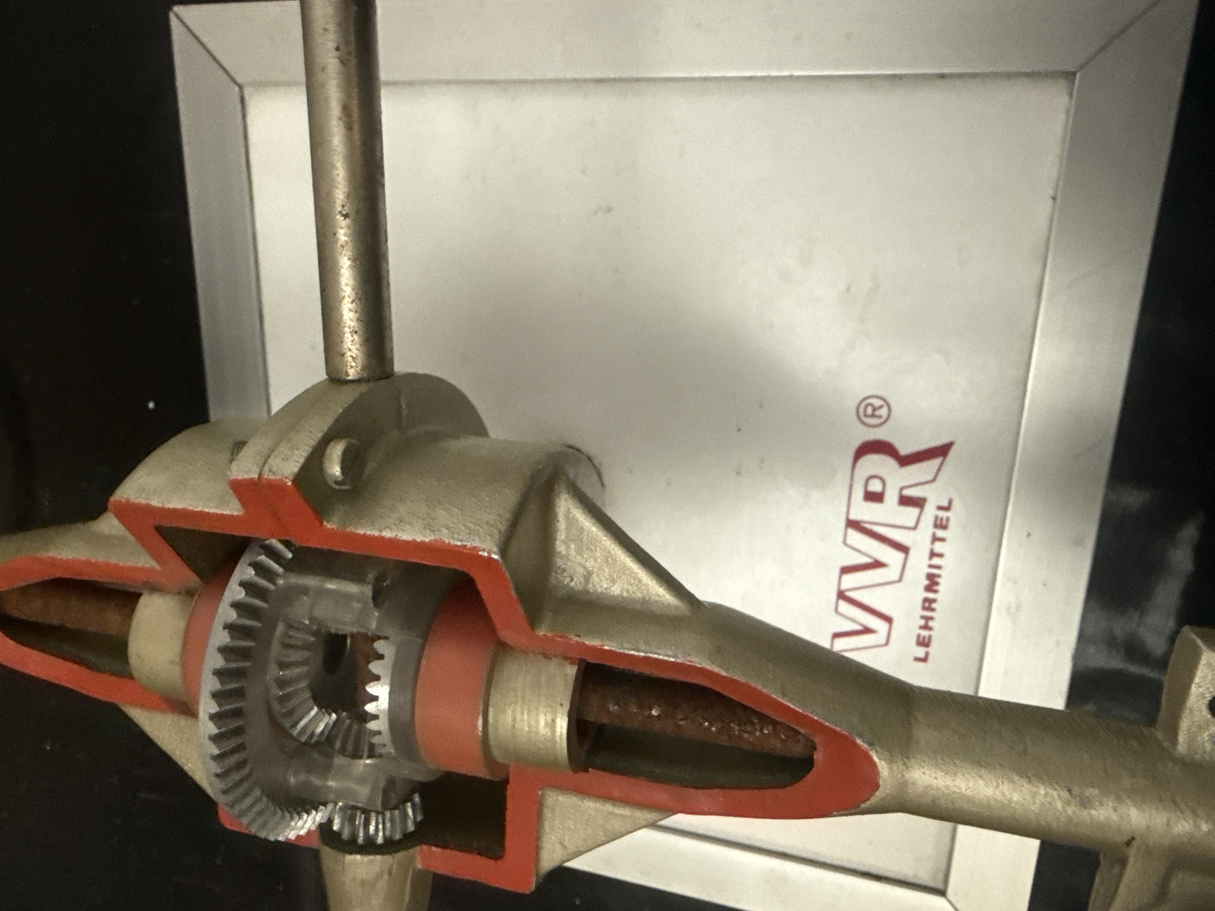 A vintage educational cutaway model of a vehicle rear axle and differential manufactured by VVR Lehrmittel. This instructional model is constructed with a cast metal housing featuring red-painted cutaway sections designed to reveal internal mechanical components, including the ring gear, pinion, and spider gears. The assembly is equipped with two wheels featuring treaded rubber tires and integrated mechanical levers and springs. The unit is mounted to a display board bearing the VVR LEHRMITTEL logo, identifying it as a German technical teaching aid. The 15 inch wide assembly demonstrates the mechanical translation of power through a differential system.