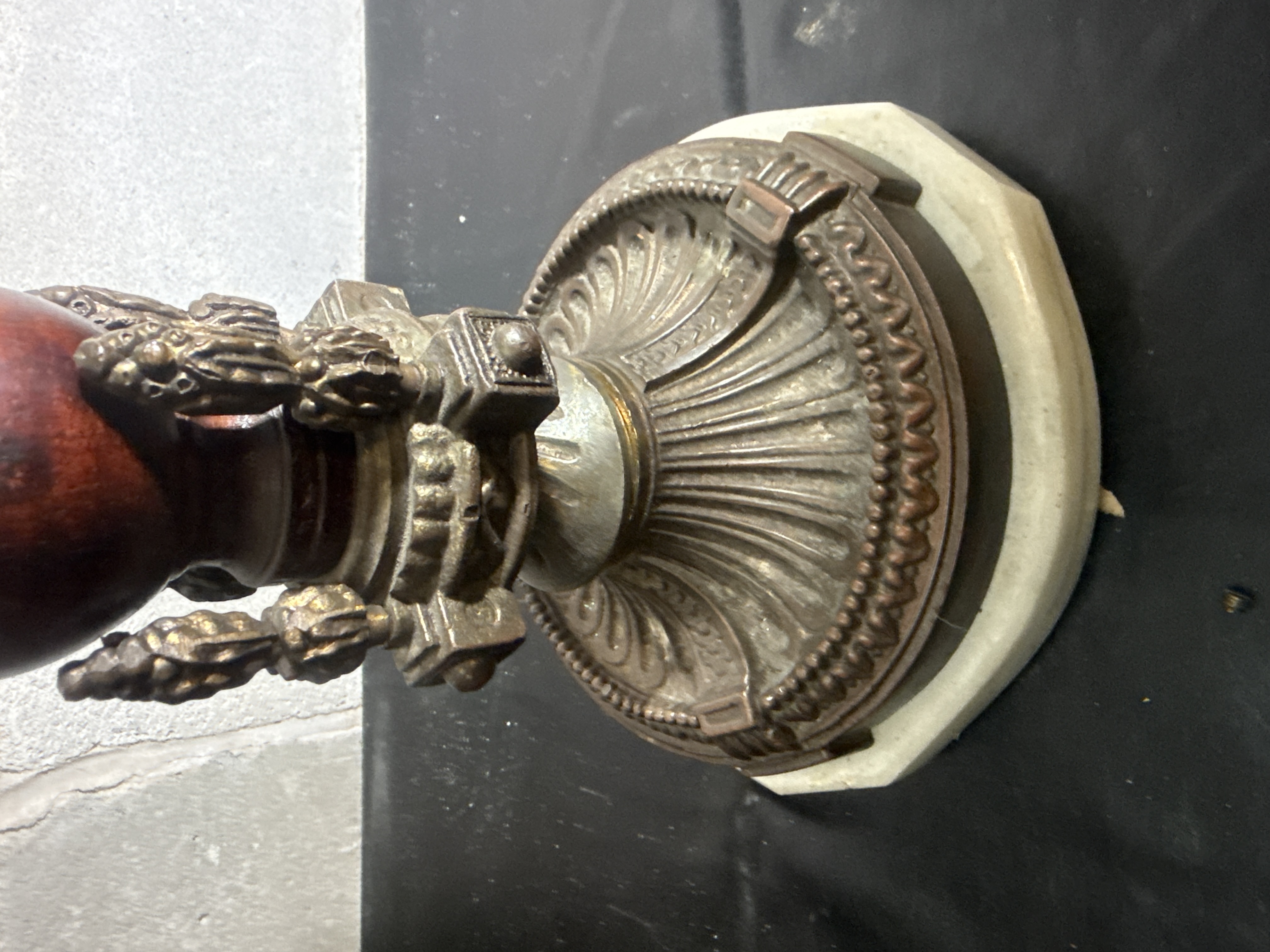 A single candlestick of Neo-Classical design featuring a central turned wood shaft with a dark mahogany-colored high-gloss finish. The object is 17 inches in height and is constructed with ornate cast metal mounts, likely brass or bronze, exhibiting gadrooned patterns, beaded edges, and stylized foliate motifs. The candle nozzle is cast in the form of a textured pinecone or bud. The assembly rests upon a stepped octagonal white marble base. No maker marks or inscriptions are visible.