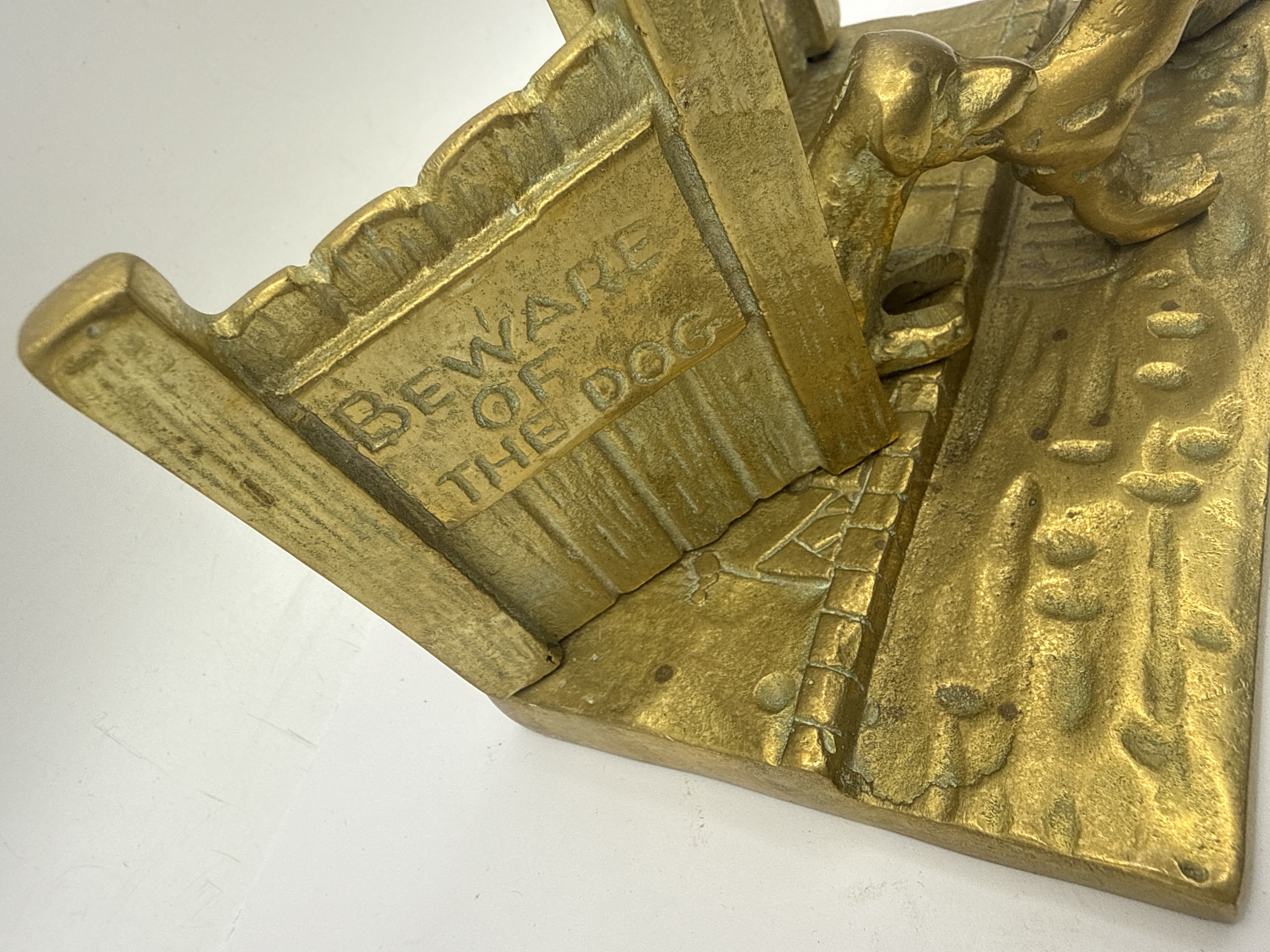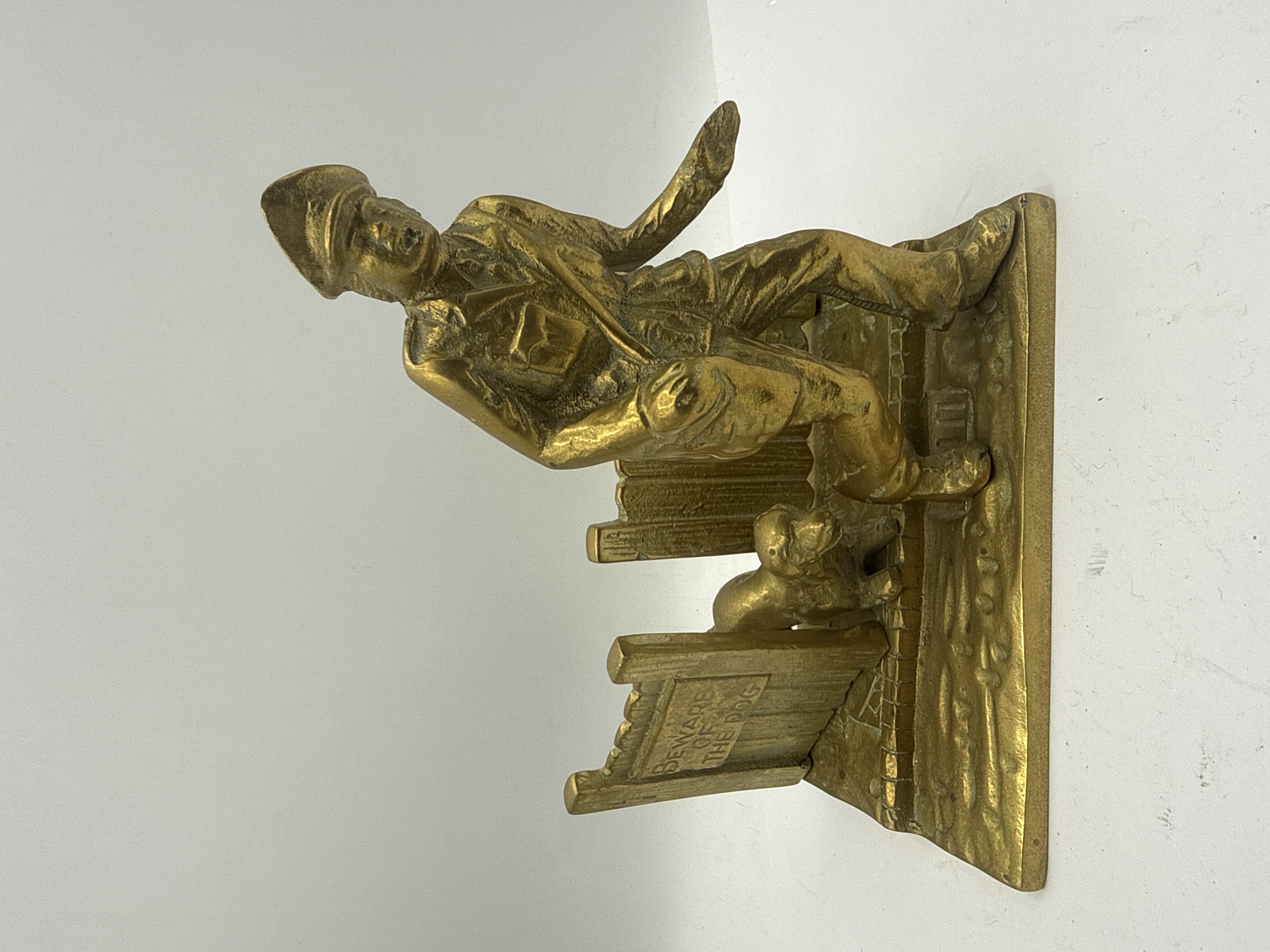 A vintage cast brass figural doorstop depicting a uniformed postman in mid-stride beside a wooden fence, accompanied by a small dog. The scene includes a gate in the foreground embossed with the text BEWARE OF THE DOG. The piece features a textured, cast surface with a uniform gold-tone patina and a flat base designed for utilitarian use. The doorstop measures 6 x 7 inches and shows a vintage patina consistent with age.