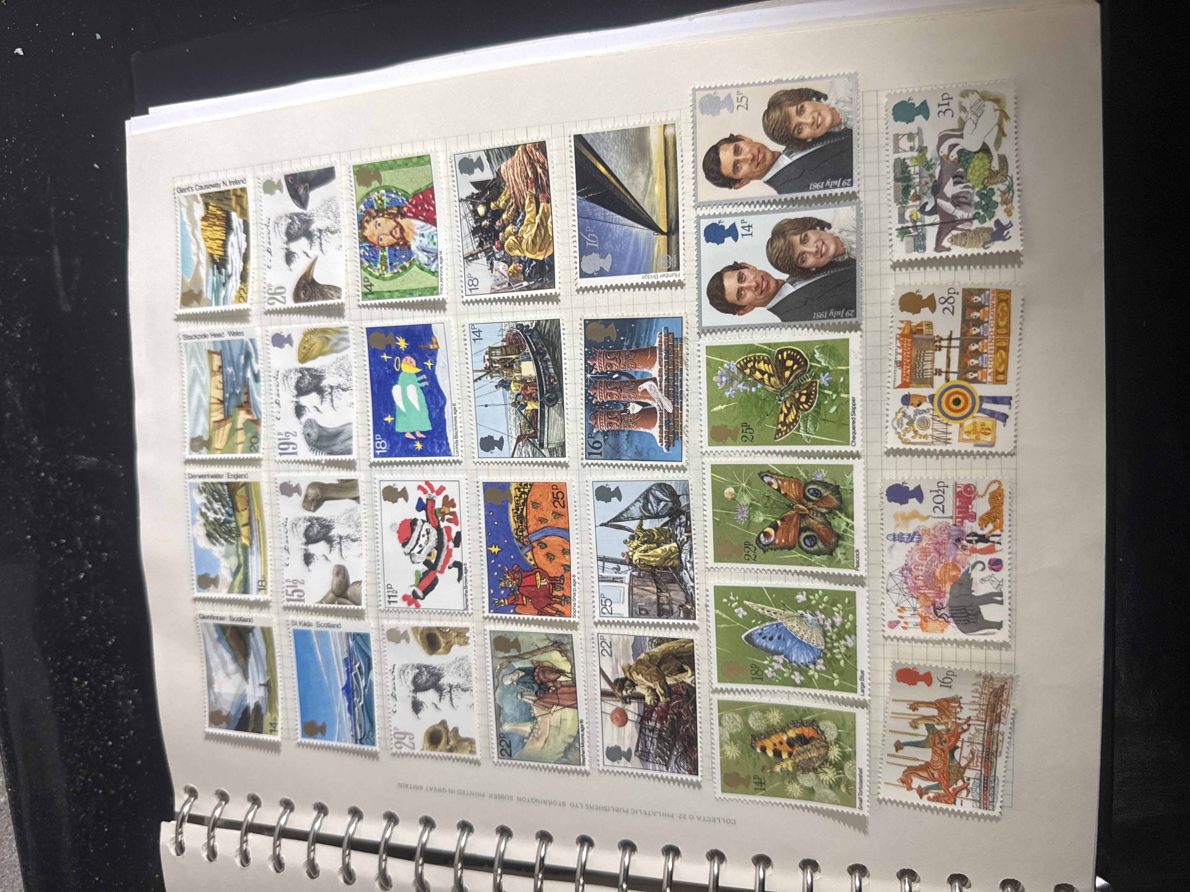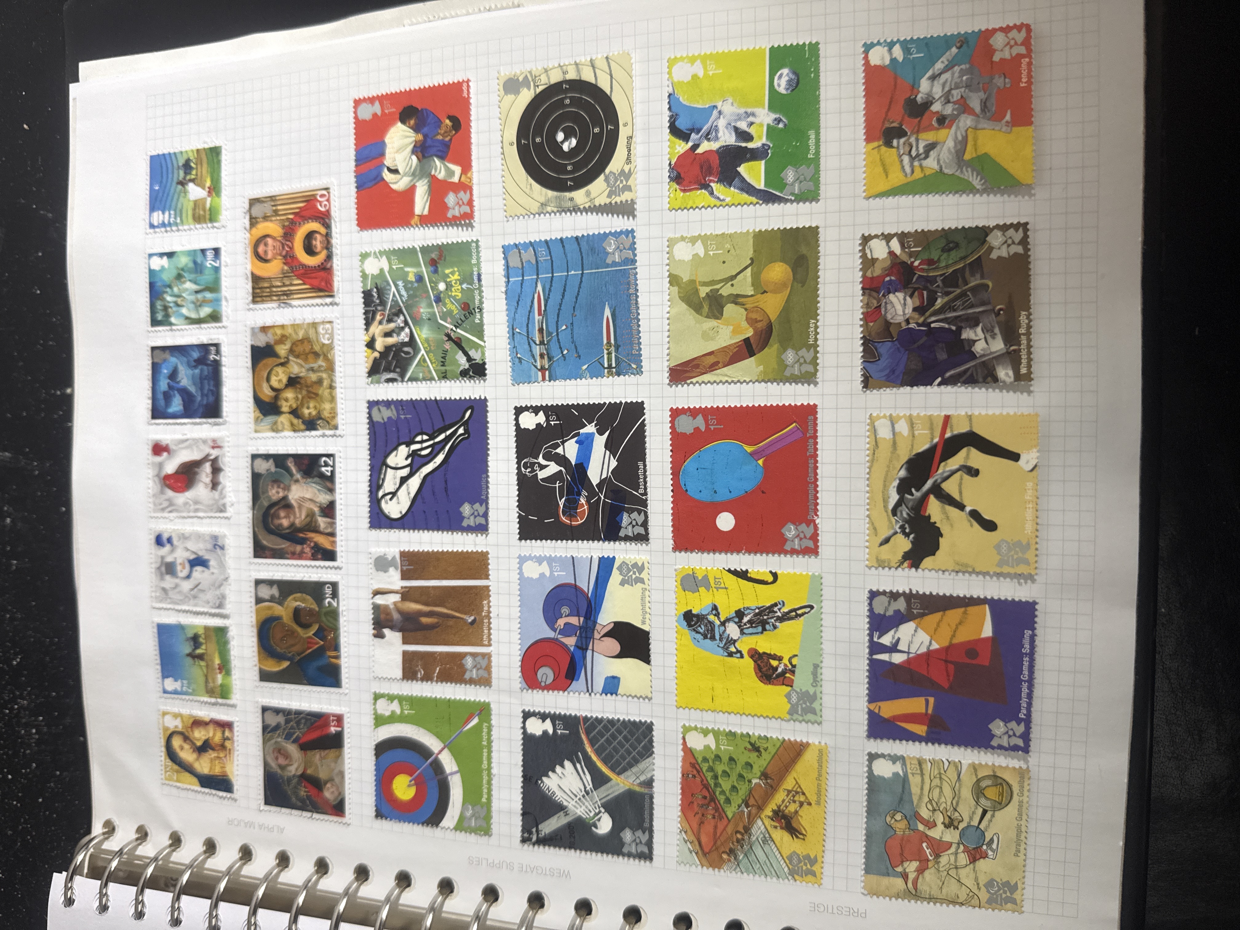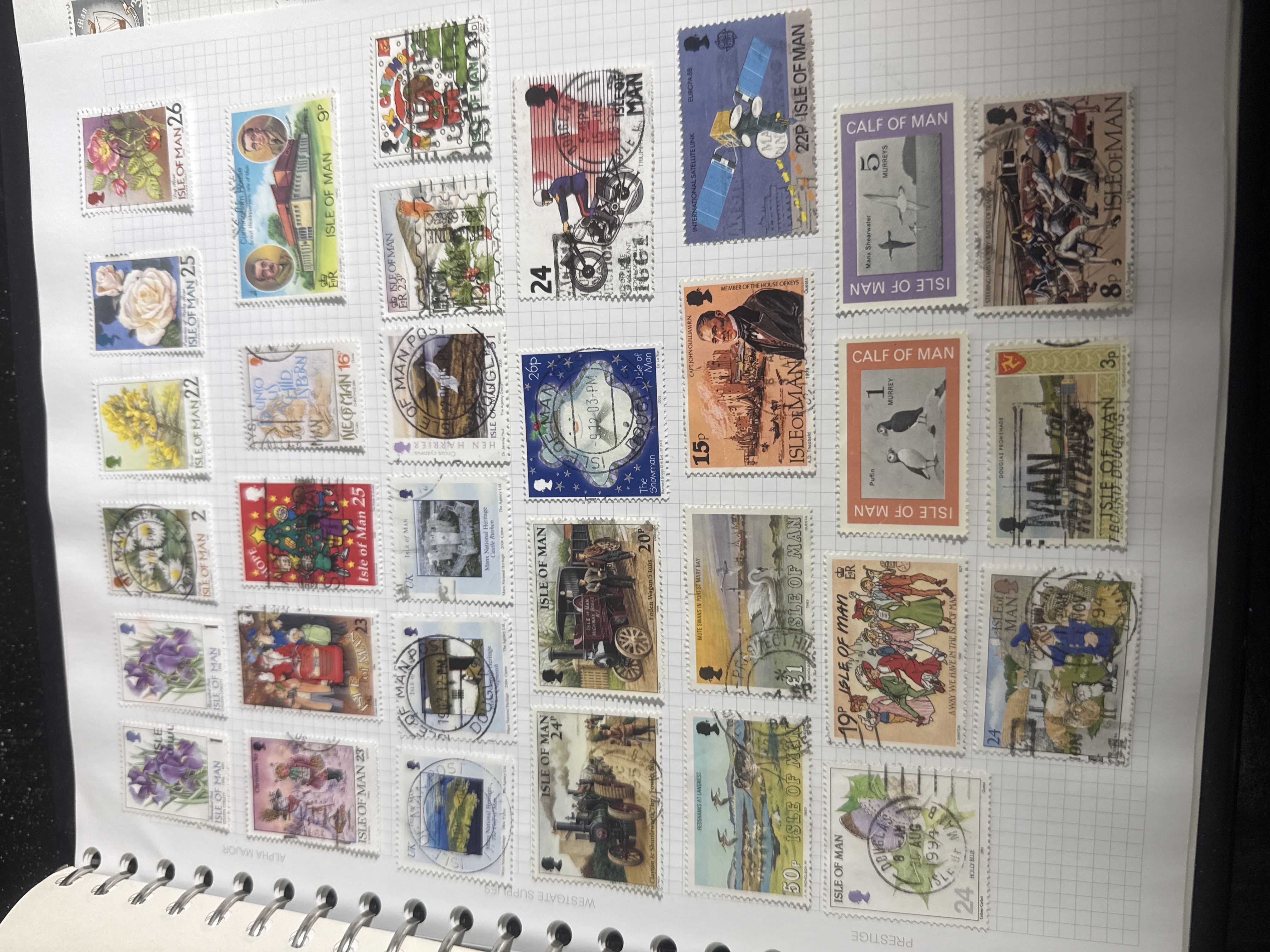 This lot consists of one album containing a collection of Great Britain and regional postage stamps, including issues from the Isle of Man and Calf of Man. The collection features a variety of commemorative and definitive themes dating from the late 20th century through the early 21st century. Notable inclusions are the 1981 Complete Commemorative Year Set, featuring the Royal Wedding of Prince Charles and Lady Diana Spencer, as well as the 1988 Spanish Armada centenary and London 2012 Olympic and Paralympic Games series. The stamps are presented in various denominations and include both mint never hinged examples and specimens with postal cancellations. The items are organized within protective mounts on gridded paper pages inside a spiral-bound philatelic album.