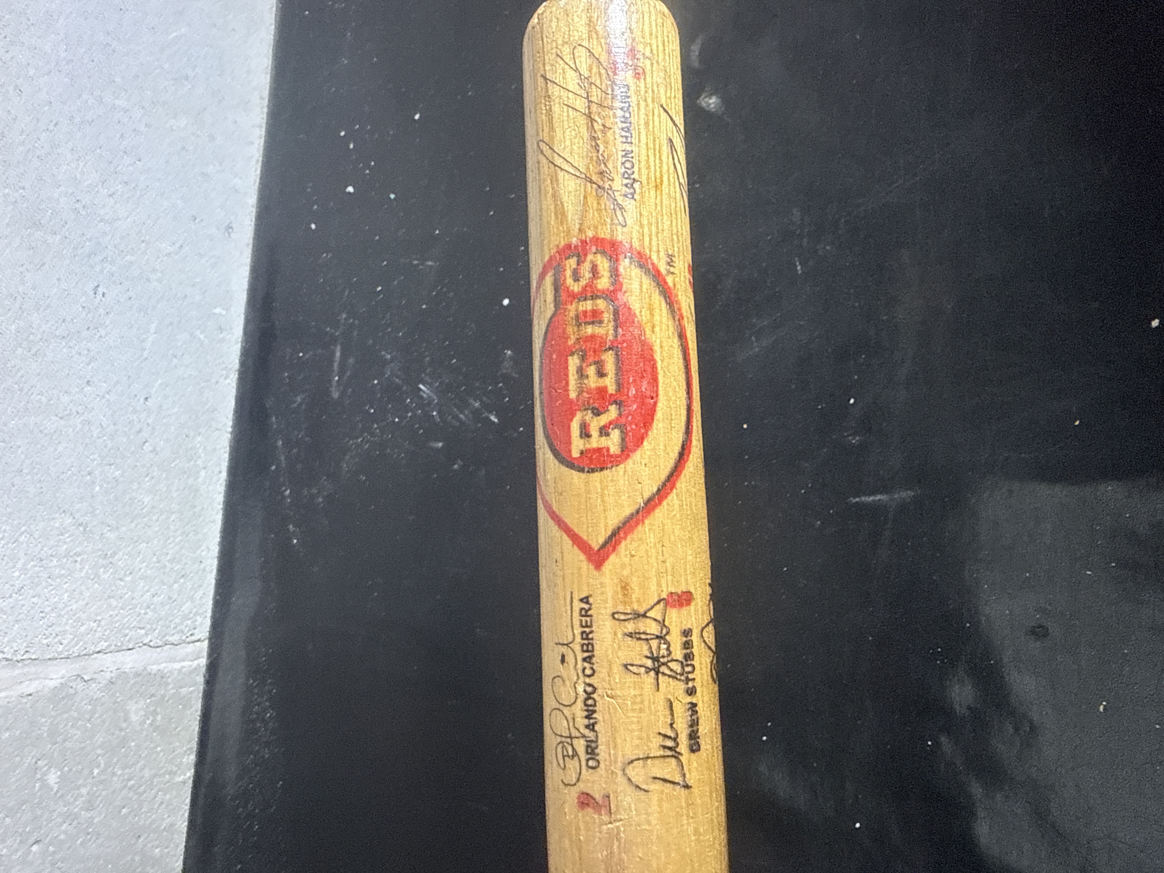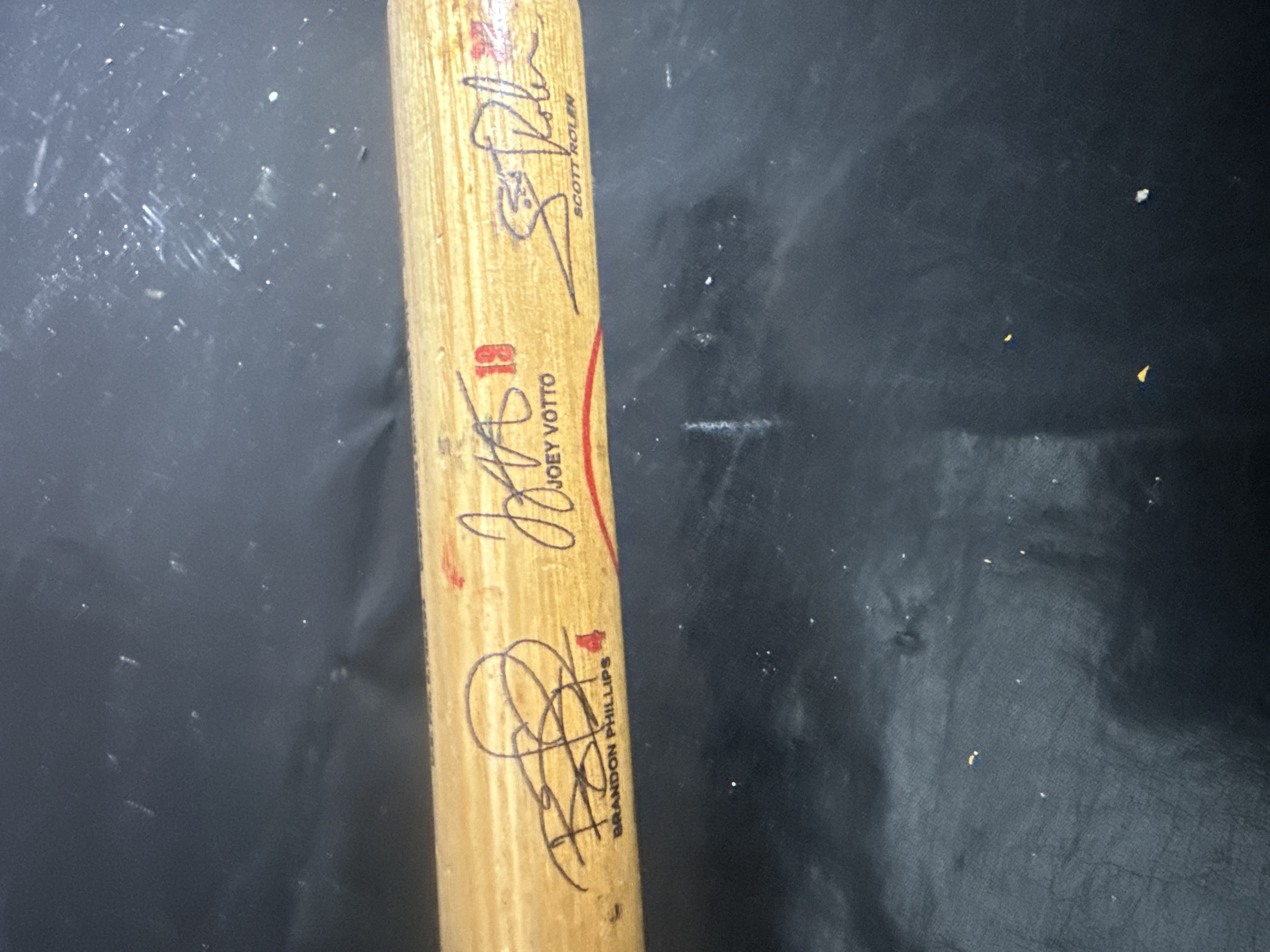 A wooden souvenir mini baseball bat featuring the Cincinnati Reds team logo and facsimile signatures of various players. The barrel displays a red and yellow Reds logo alongside a circular brand mark reading CS EST. 1761. Printed names and signatures include Joey Votto, Brandon Phillips, Scott Rolen, Orlando Cabrera, Drew Stubbs, and Aaron Harang. The item is constructed from natural wood with a clear finish. Based on the roster represented, the bat dates to circa 2010.