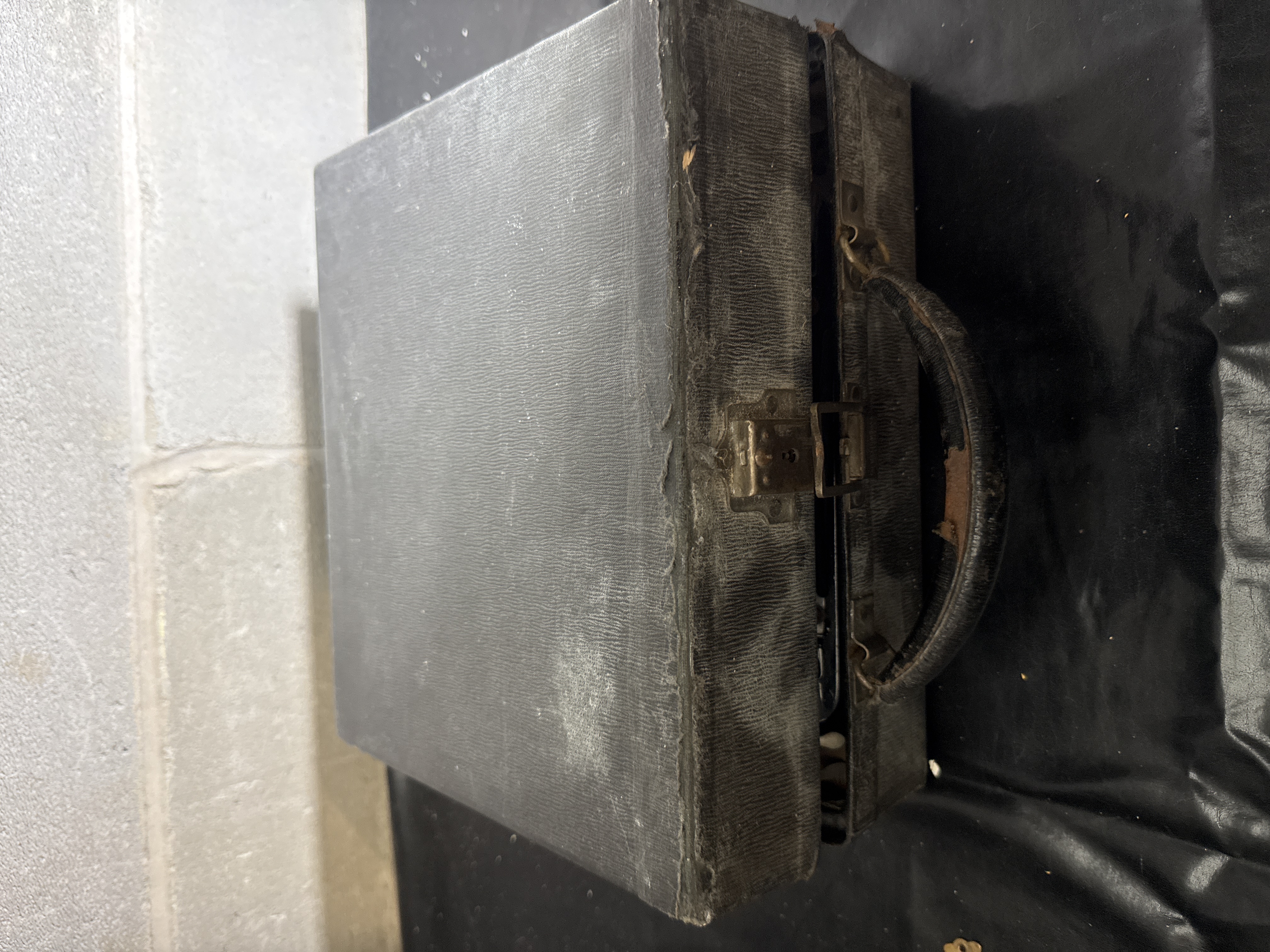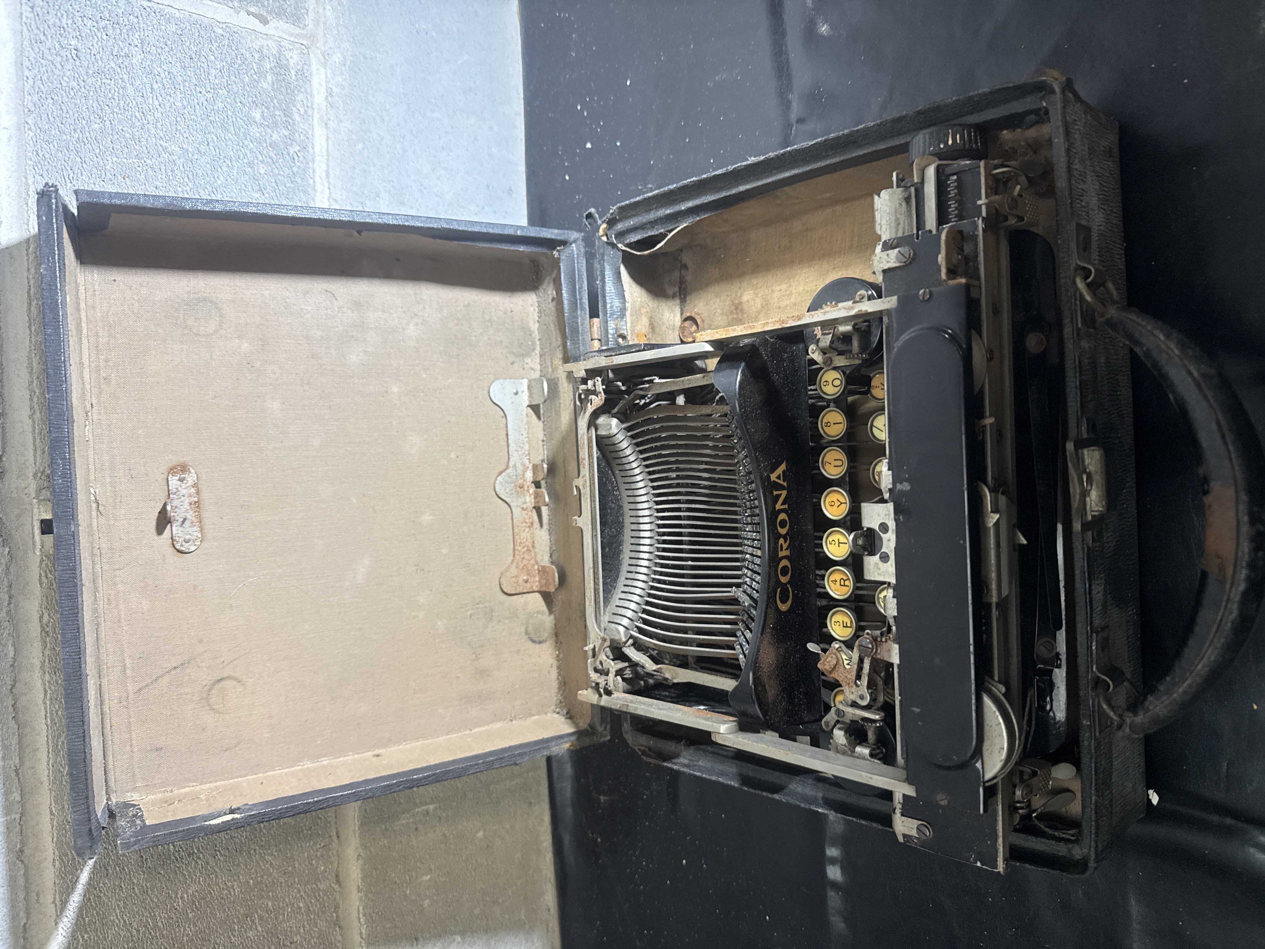 This Corona No. 3 Special folding portable typewriter features a black enameled metal frame with gold-tone brand lettering. The machine is designed with a characteristic folding carriage and round character keys with yellowed faces. It is housed within its original black textured hardshell carrying case. The unit incorporates a three-bank keyboard layout typical of early 20th-century portable models. The dimensions of the case are approximately 11 x 10 inches.