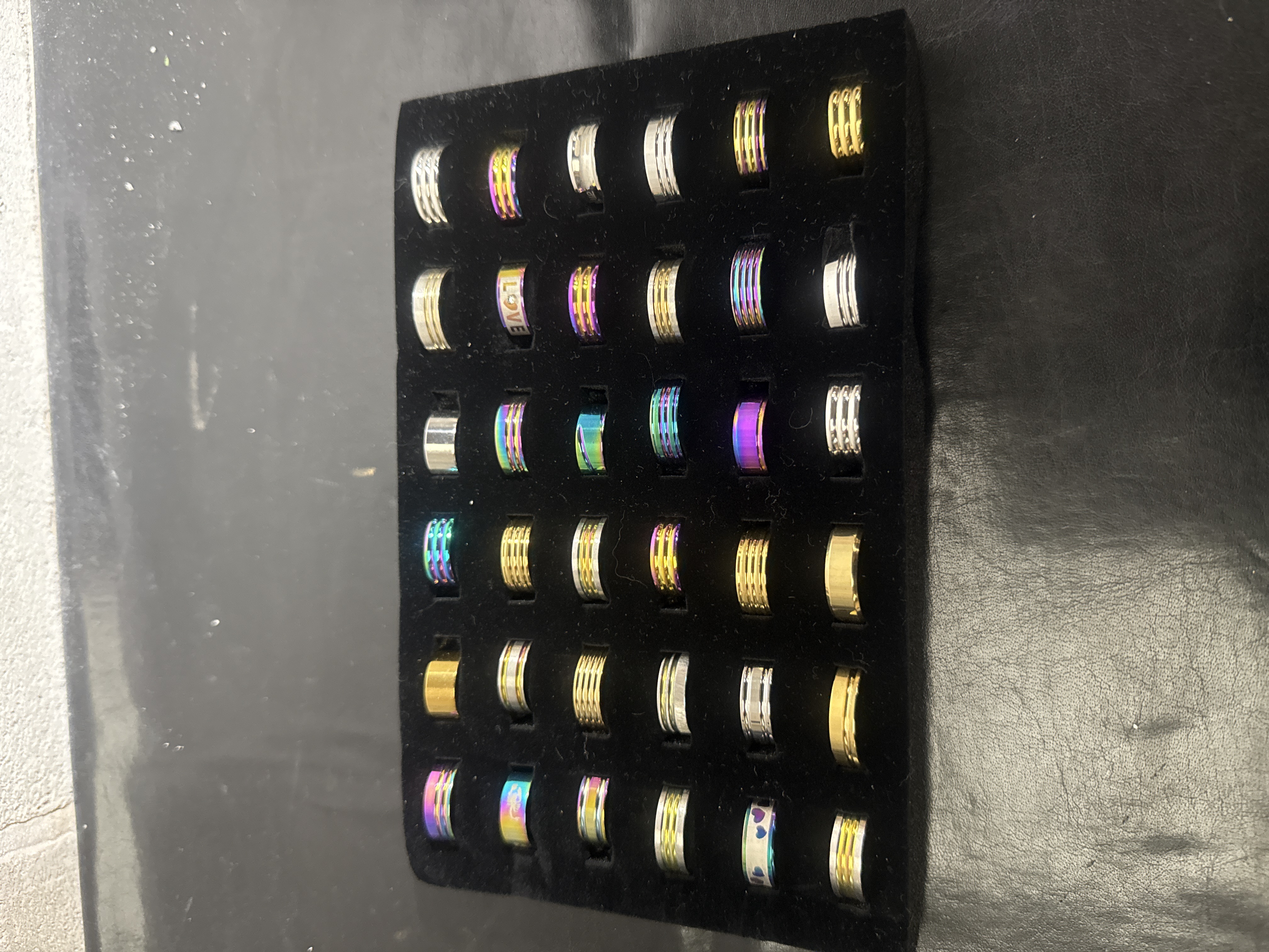 A collection of contemporary stainless steel fashion rings featuring a variety of band styles and finishes. The group includes rings with silver-tone, gold-tone, and iridescent rainbow-colored coatings. Decorative motifs observed across the collection include horizontal grooved stripes, polished surfaces, and specific designs such as one ring inscribed with the word LOVE and another featuring a series of heart shapes. The items are presented in a black velvet-lined display tray.