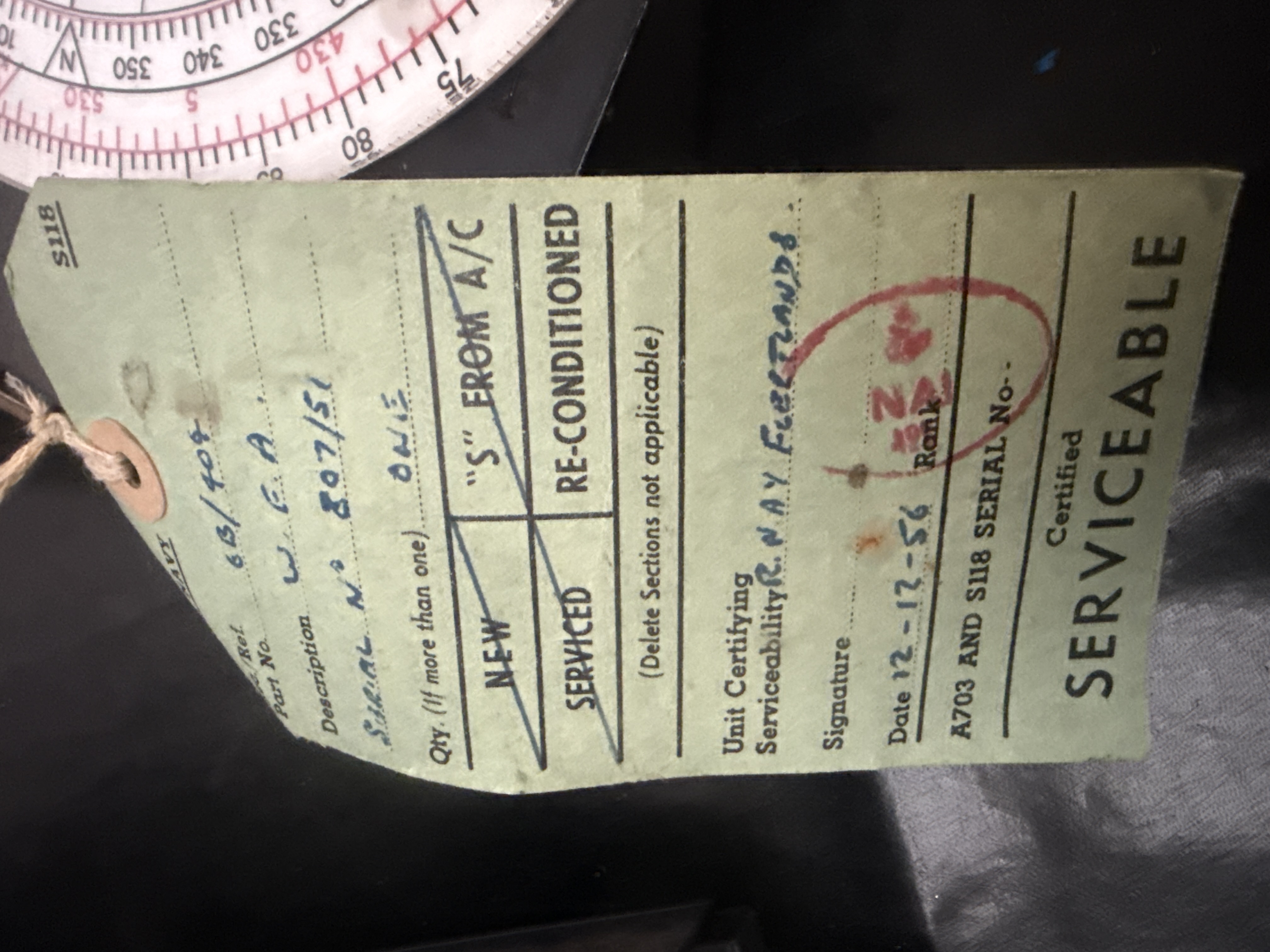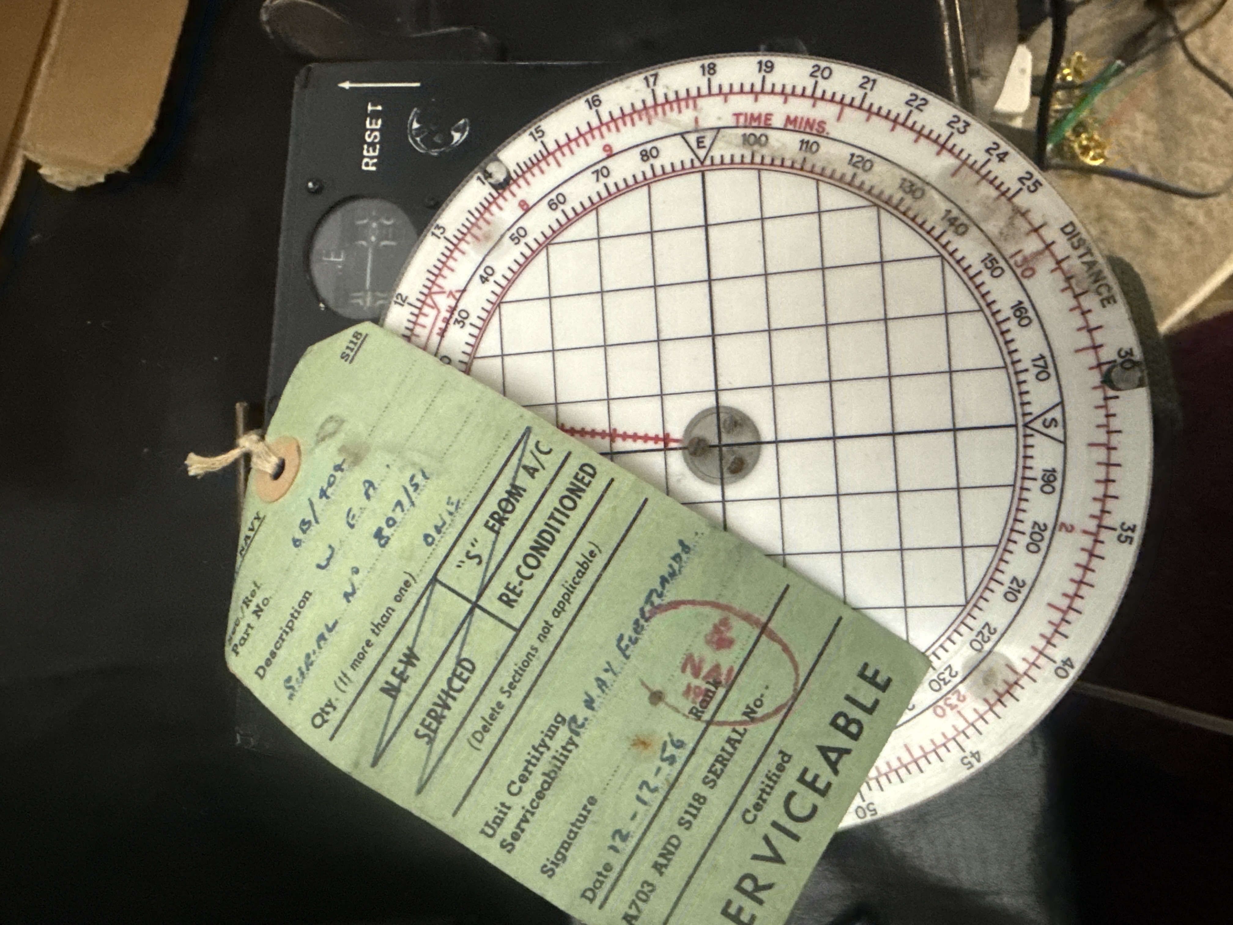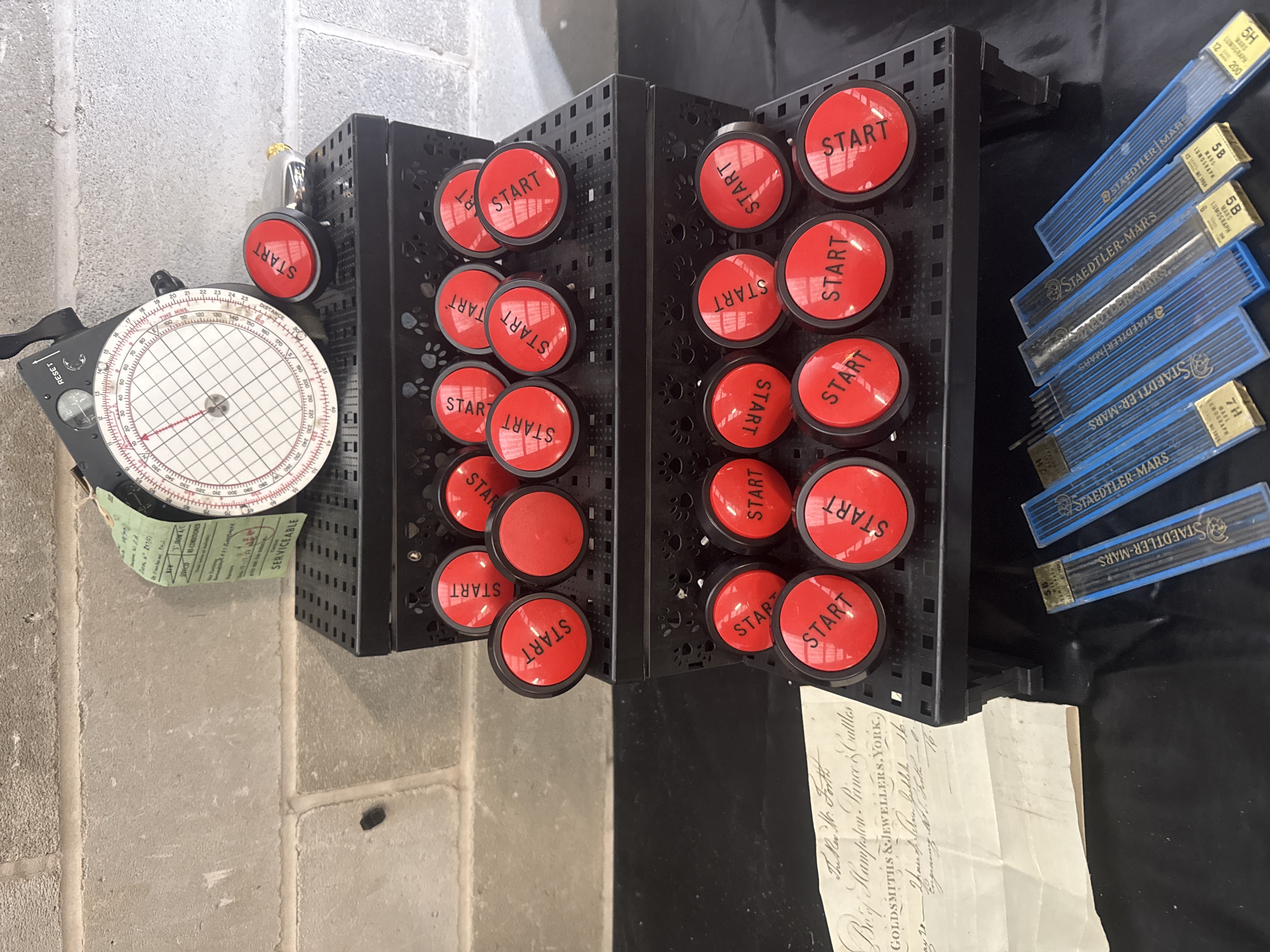 An assortment of mid-20th-century and modern items. The group features a mechanical aviation dead reckoning navigation computer, model W.E.A. 6B/404, equipped with a circular slide rule for time and distance calculations. This instrument is accompanied by an original British Royal Navy Certified Serviceable inspection tag from R.N.A.Y. Fleetlands, dated December 12, 1956. Also included is a collection of red recordable talking buttons mounted on two black perforated modular panels. The lot further contains several sets of Staedtler-Mars Lumograph drafting pencil leads in various grades, including 5H, 5B, and 7H, housed in their original blue plastic and metal cases. Completing the collection is a handwritten vintage document on letterhead from a jeweler and goldsmith based in York.