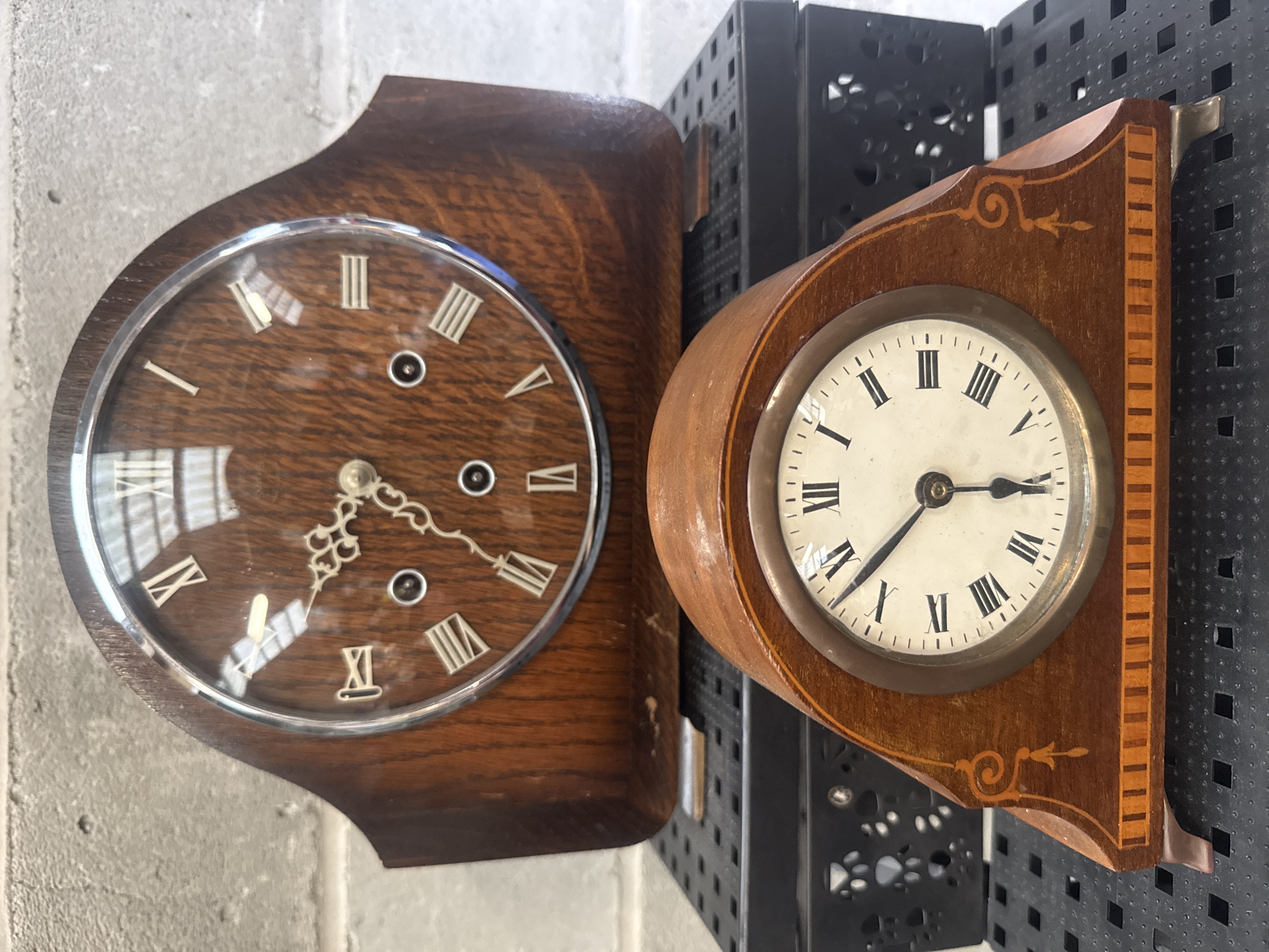 A pair of vintage mantel clocks comprising one Enfield striking clock and one Seth Thomas inlaid clock. The Enfield clock features a dark, figured oak case with a circular dial, Roman numeral markers, ornate scrollwork hands, and three winding apertures protected by a glass cover. The Seth Thomas clock is housed in a lighter wood case detailed with decorative scrollwork and geometric inlaid patterns, featuring a white dial with Roman numerals and simple black hands, resting on metal feet.