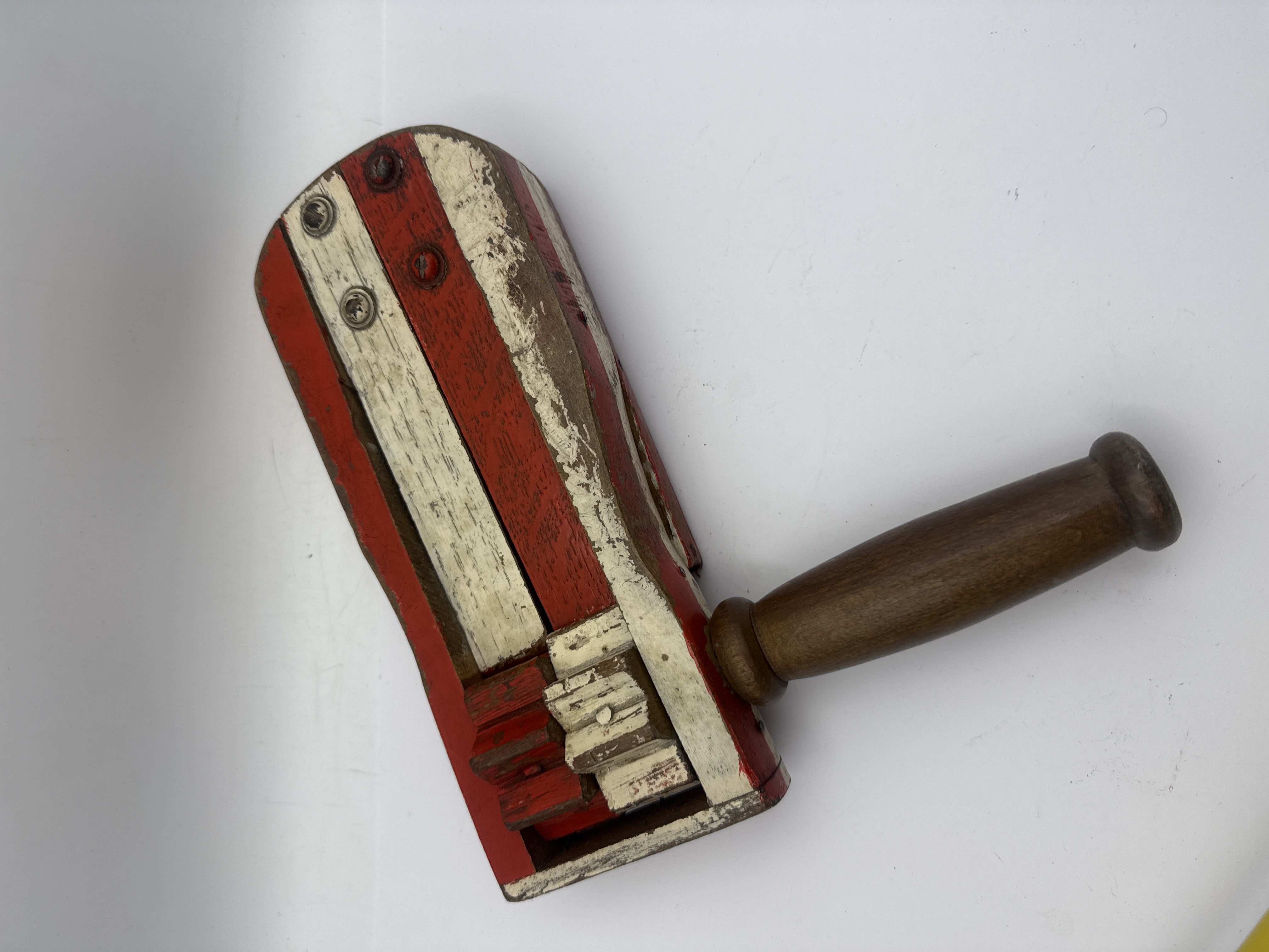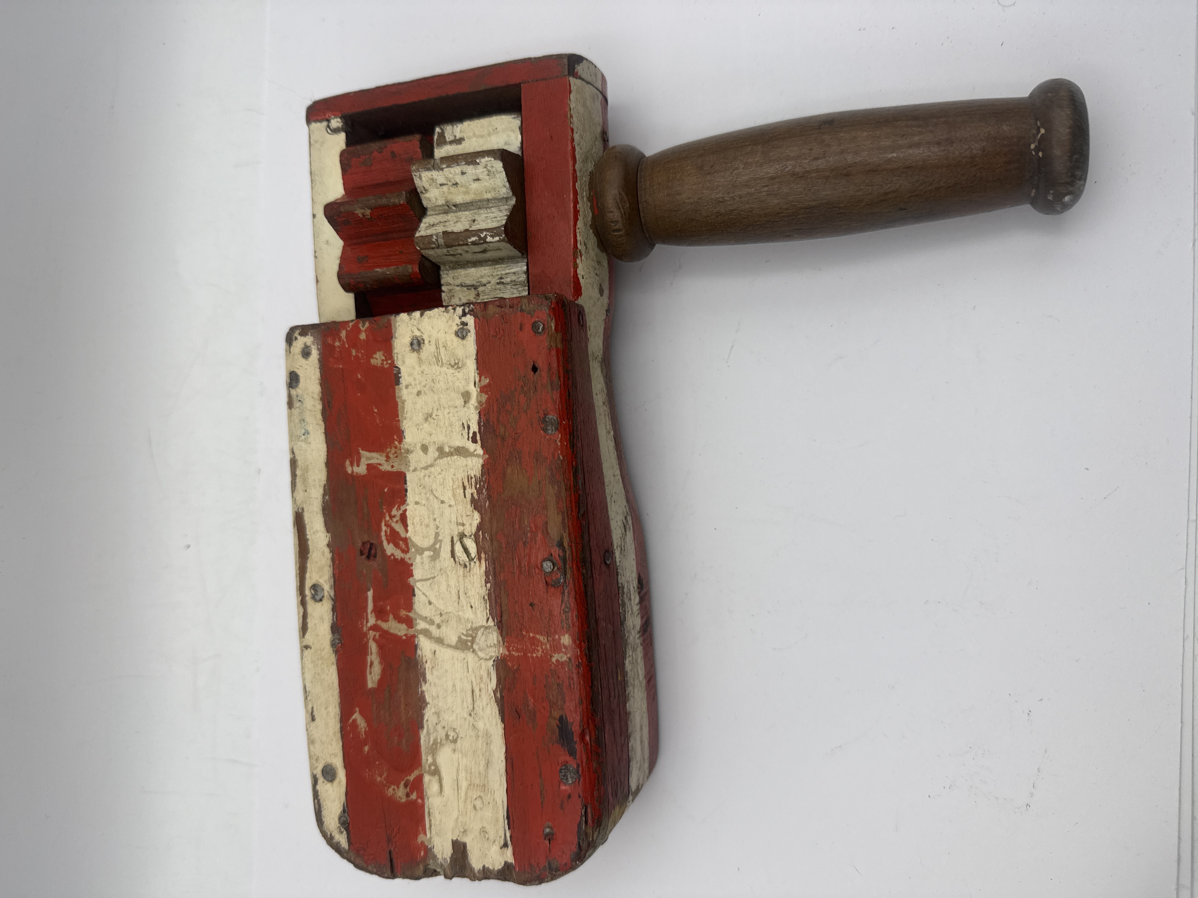 This vintage wooden ratchet noise maker is a folk-style piece featuring a red and white striped painted finish. Constructed from wood with metal screw and nail fasteners, the object consists of a main frame containing two toothed gears that strike flexible wooden slats to create sound when rotated by its turned wooden handle. Indistinct dark markings are visible on one side of the frame, though they are no longer legible.