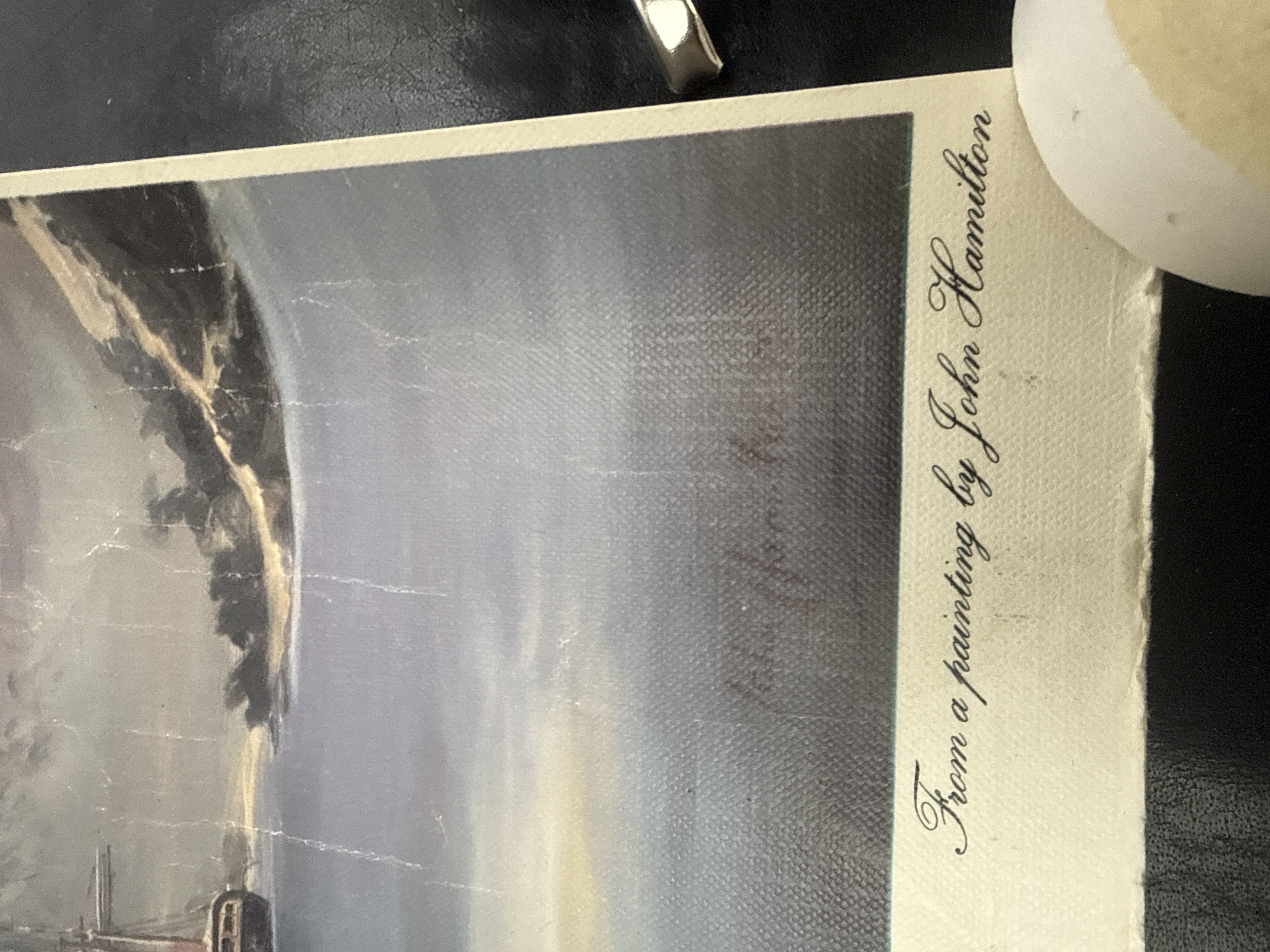 A large-format maritime print titled English Harbour, Antigua, after an original painting by artist John Hamilton. The nautical scene depicts several three-masted sailing vessels at anchor in a bay, with a printed inscription on the lower left referencing Capt H. Nelson R.N. 1785. The artwork is executed on textured paper and includes a faint, hand-applied signature by the artist in the lower right corner above the printed credit. This lot includes the original cardboard mailing tube, which retains a partial merchant label from Walton & Co., 103 Shaftesbury Avenue, London, W.