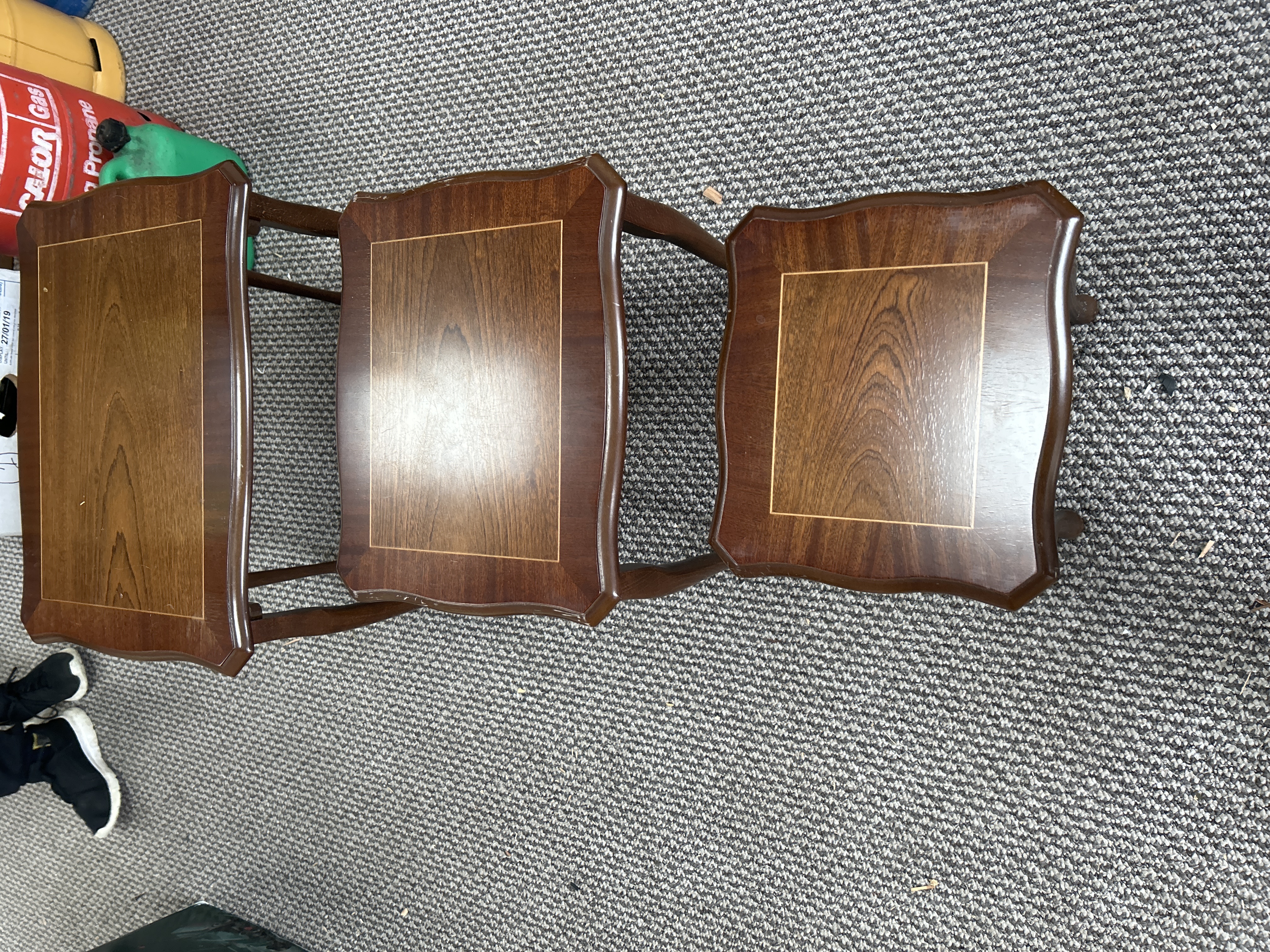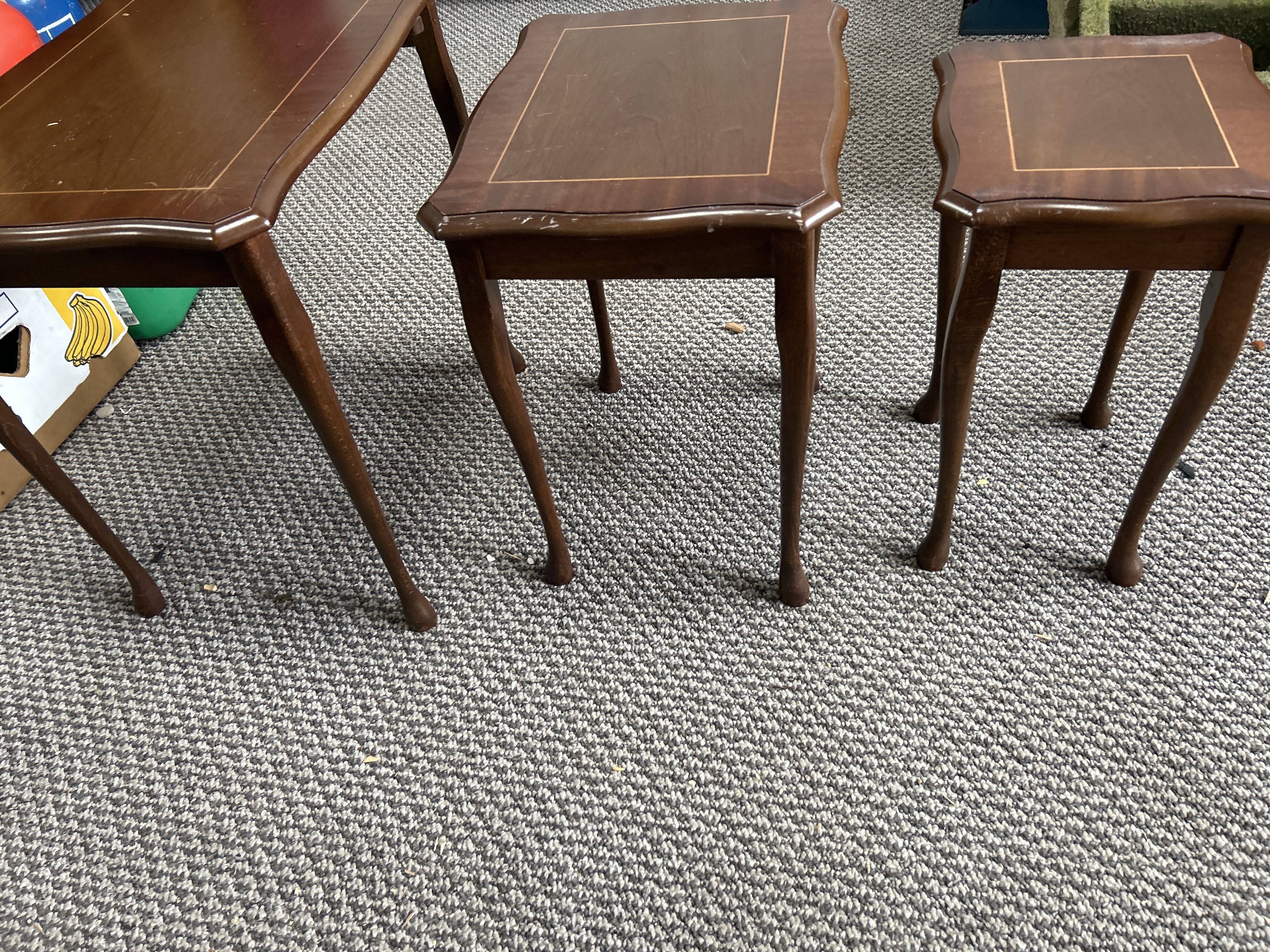 A trio of nesting side tables in the Queen Anne style, constructed from a dark-toned hardwood with a polished finish. Each table features a rectangular top with serpentine edges and a contrasting wood inlay border. The tables are supported by slender cabriole legs terminating in pad feet. The set is designed to nest together for storage.