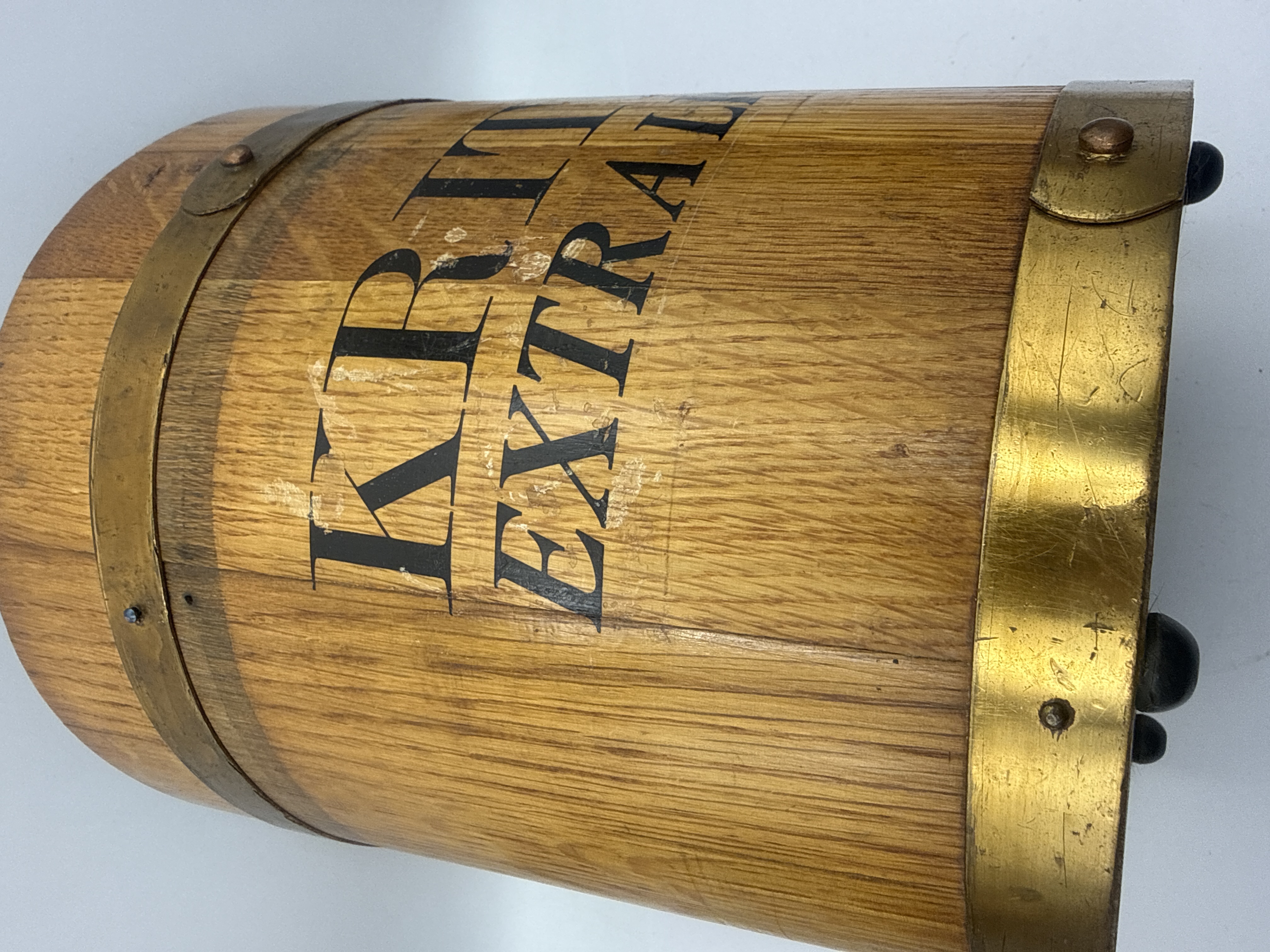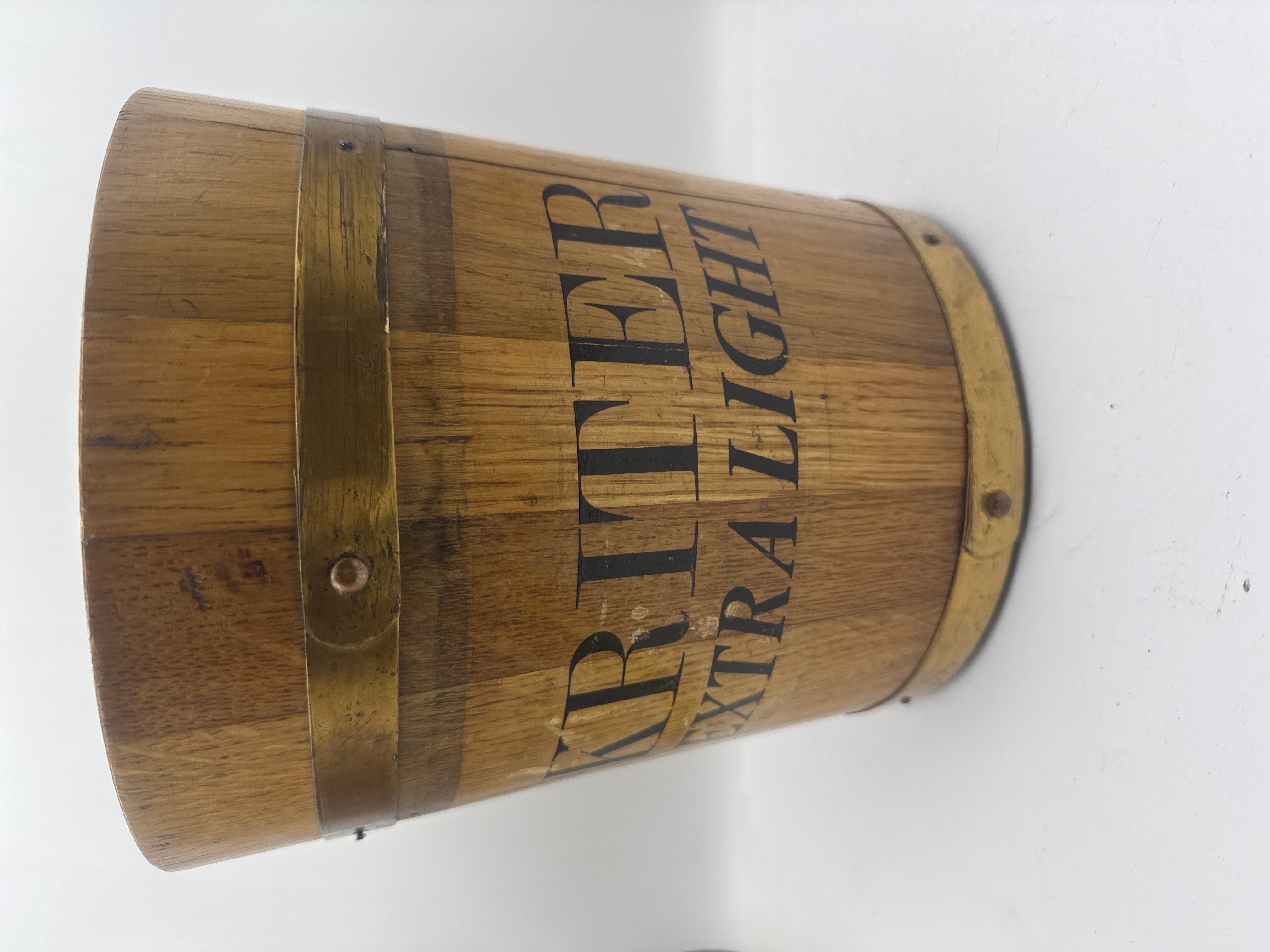 A trio of vintage wooden barrel-style wine or ice buckets produced as promotional items for the Kriter brand. Each cylindrical vessel is constructed from vertical wooden staves with a natural grain finish, secured by two wide brass-toned metal bands featuring prominent rivets. The exterior of each bucket is printed with black serif lettering reading KRITER EXTRA LIGHT. The units are supported by small, dark spherical feet at the base.