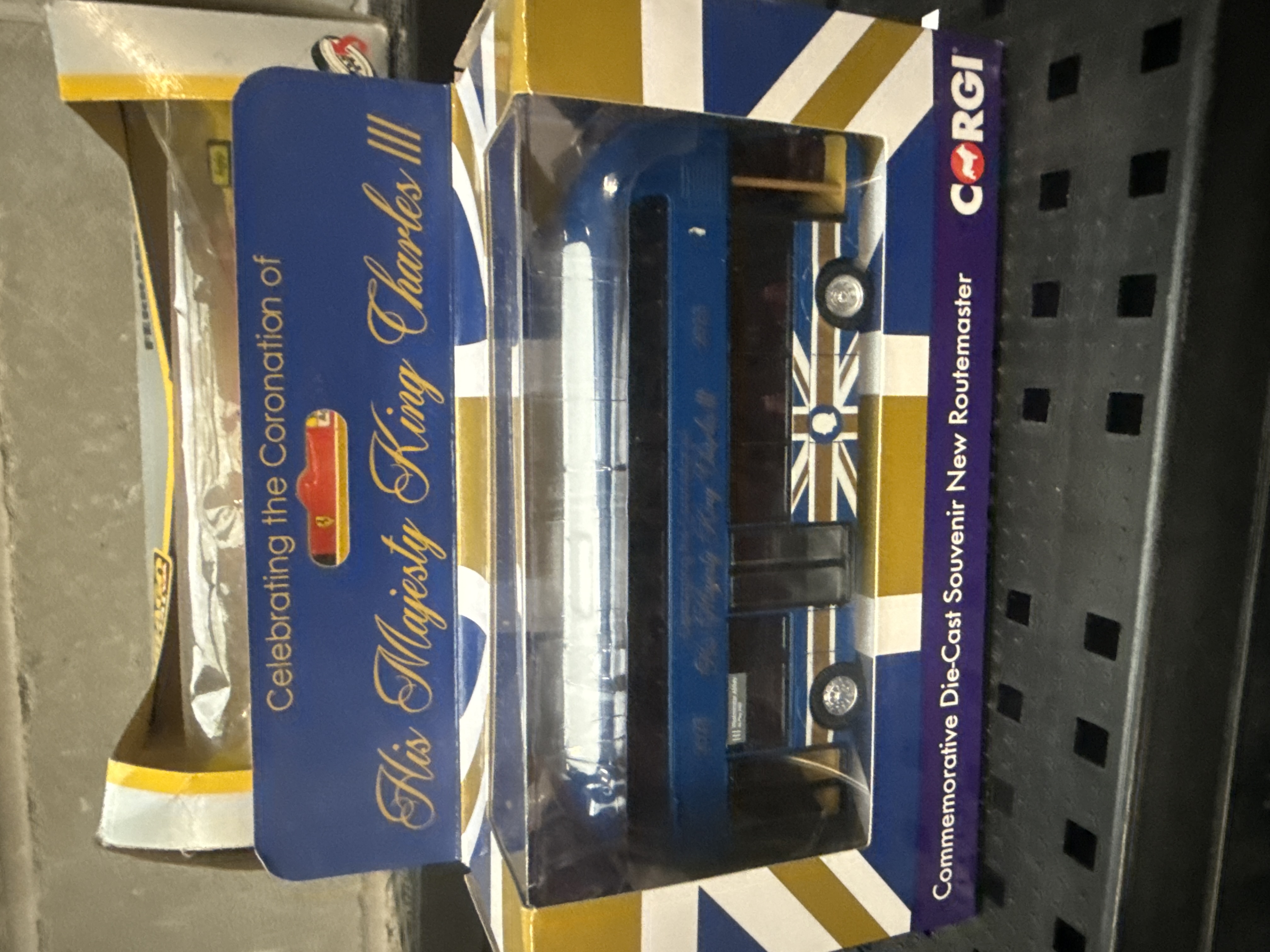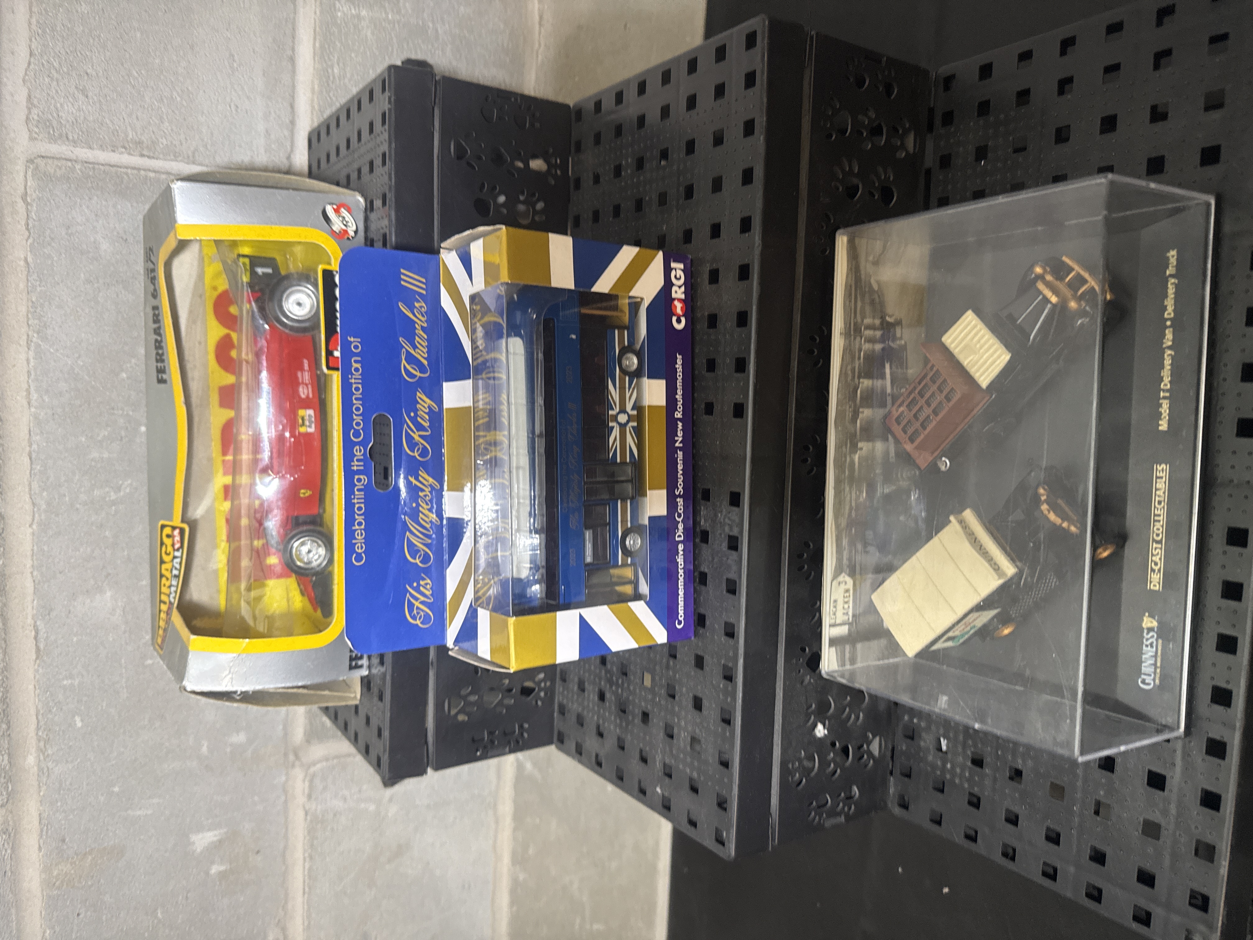 A group of three die-cast model vehicle sets from various manufacturers. The lot includes a Bburago 1/24 scale Ferrari 641/2 Formula 1 racing car finished in red with sponsor decals, housed in its original cardboard and plastic window box. Also present is a Corgi Commemorative Die-Cast Souvenir New Routemaster bus, produced for the coronation of King Charles III, featuring a blue livery with gold and white Union Jack motifs in its original box. The third item is a Guinness-branded clear plastic display case containing two vintage-style vehicles, a Model T Delivery Van and a Delivery Truck, both with Guinness branding.