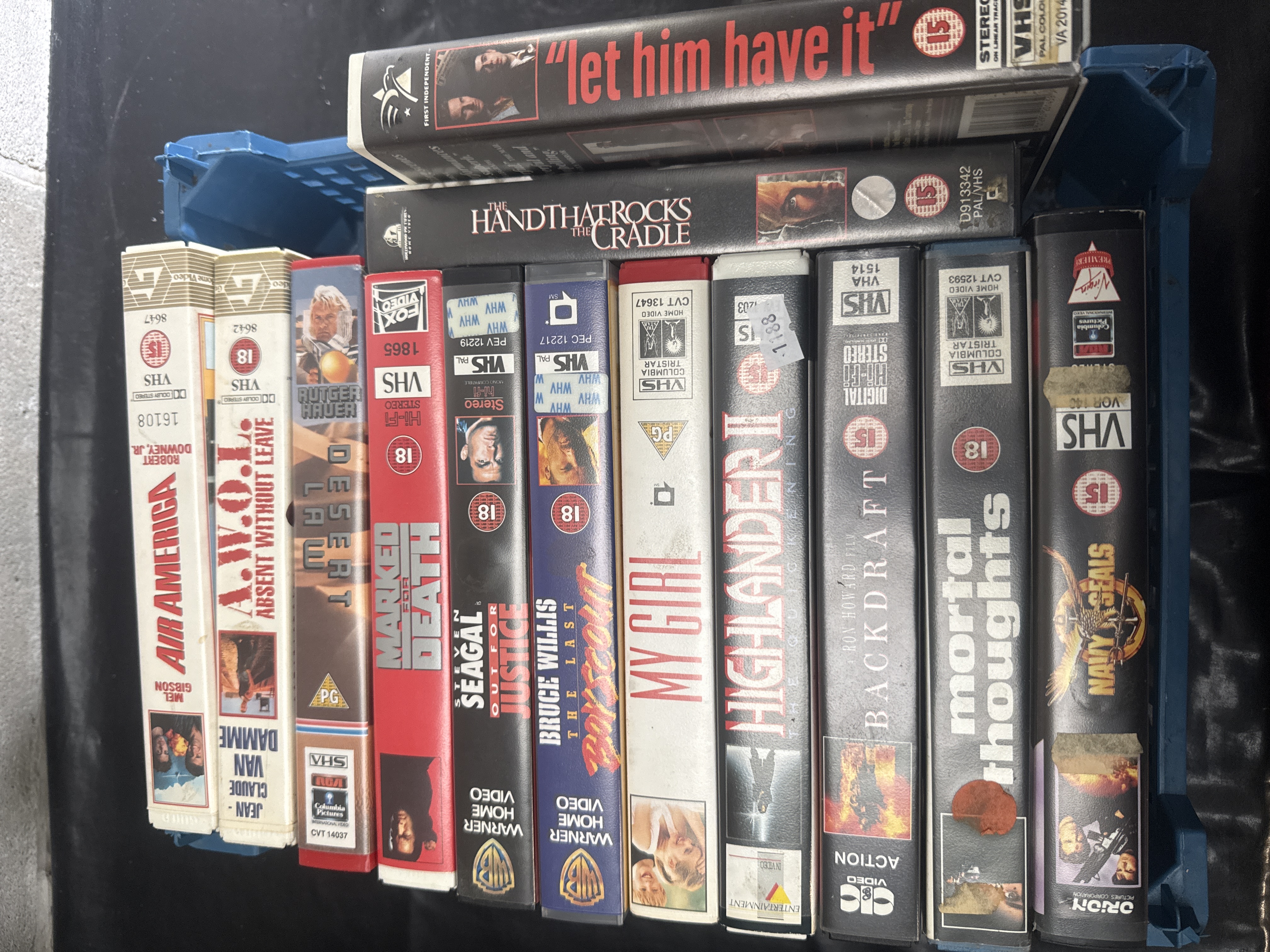 A collection of 13 original VHS movie tapes dating from the late 1980s and early 1990s. The lot includes various film titles such as Air America, A.W.O.L. (Absent Without Leave), Desert Law, Marked For Death, Out For Justice, The Last Boy Scout, My Girl, Highlander II: The Quickening, Backdraft, Mortal Thoughts, Navy Seals, The Hand That Rocks The Cradle, and Let Him Have It. The tapes are housed in their original plastic protective cases. Branding from major distributors is present on the spines, including Warner Home Video, Fox Video, Columbia TriStar Home Video, CIC Video, Orion, and First Independent. Each tape features UK BBFC age ratings and is in PAL format. The items are presented in a blue plastic storage crate.