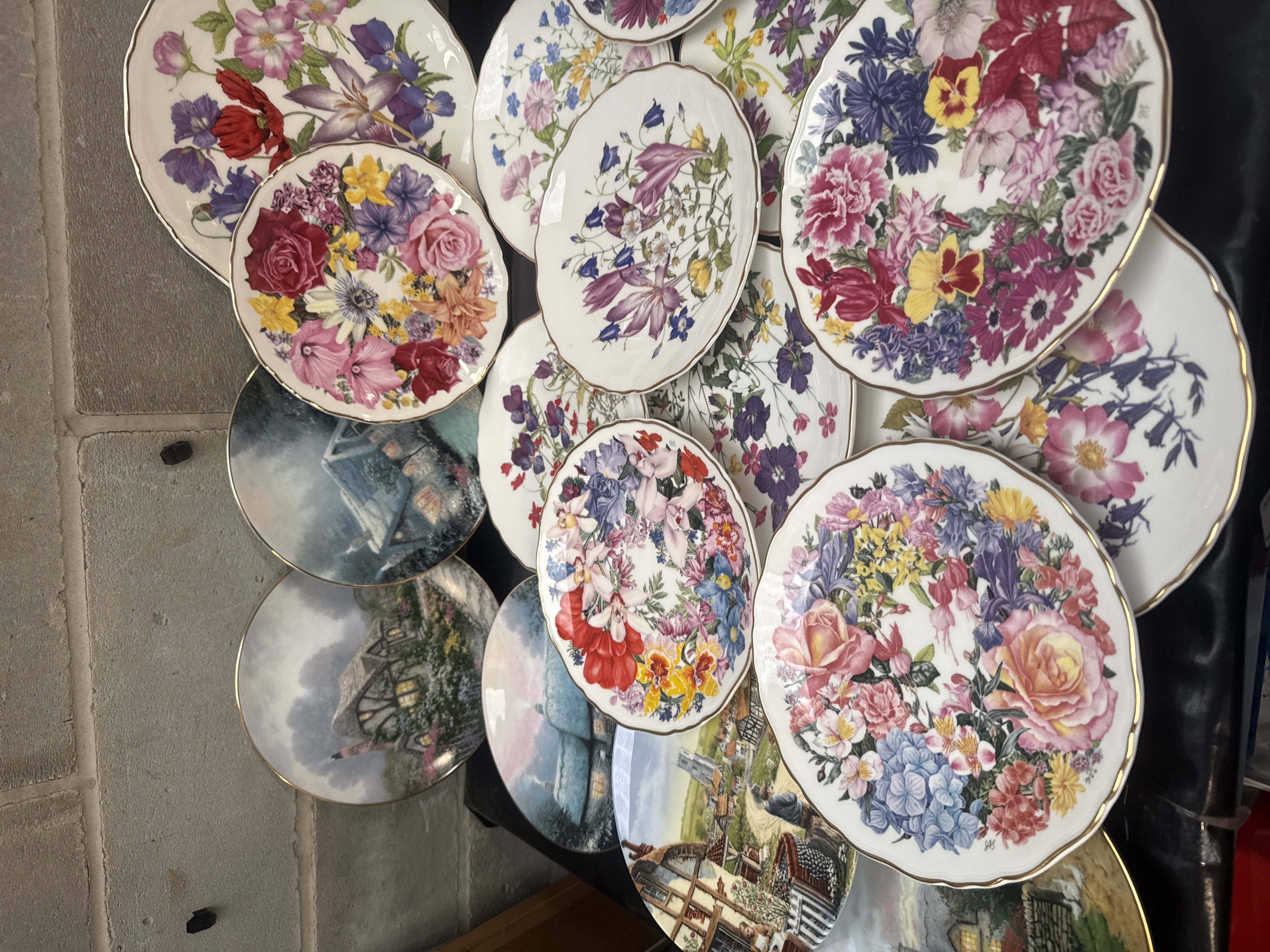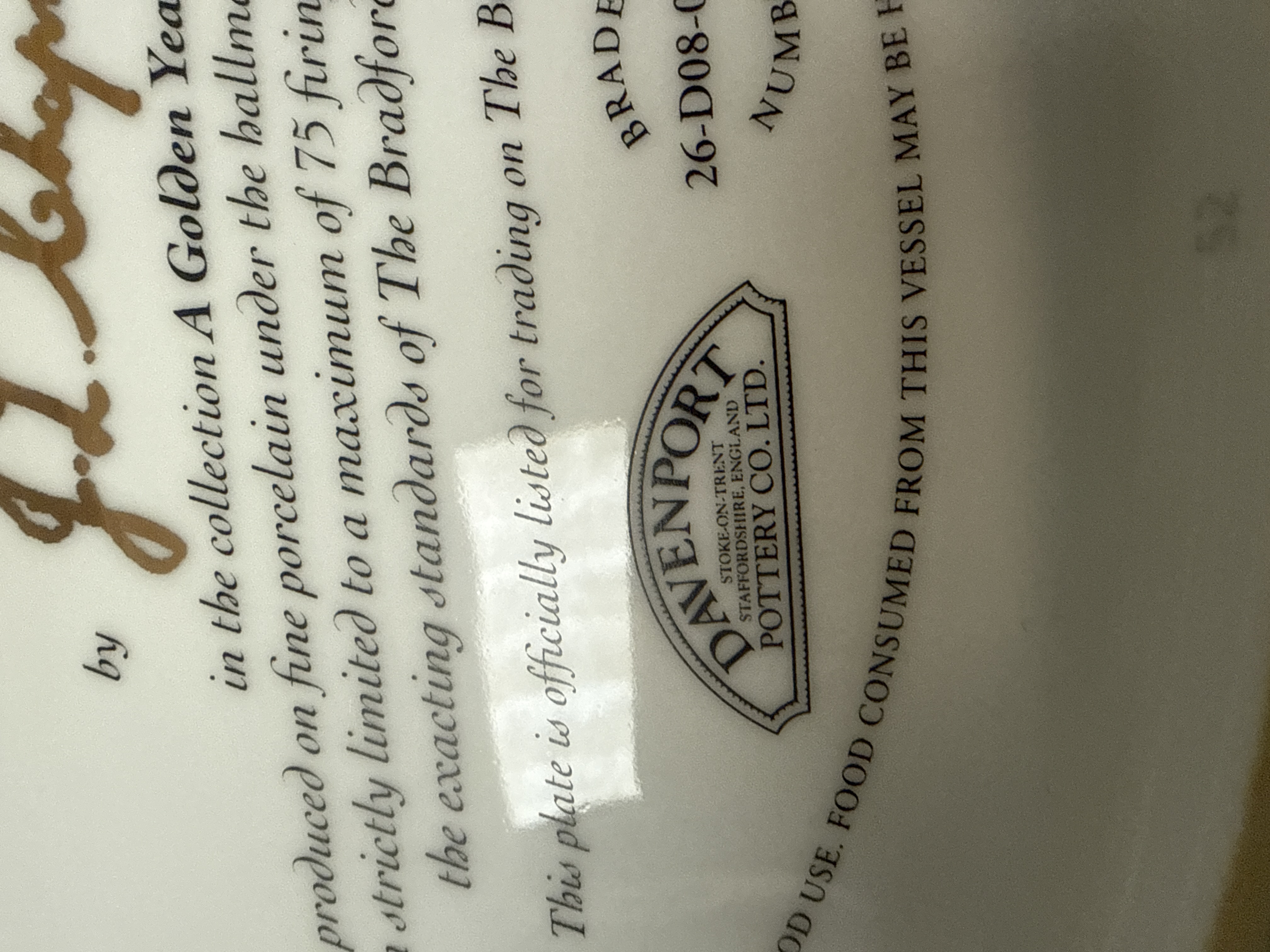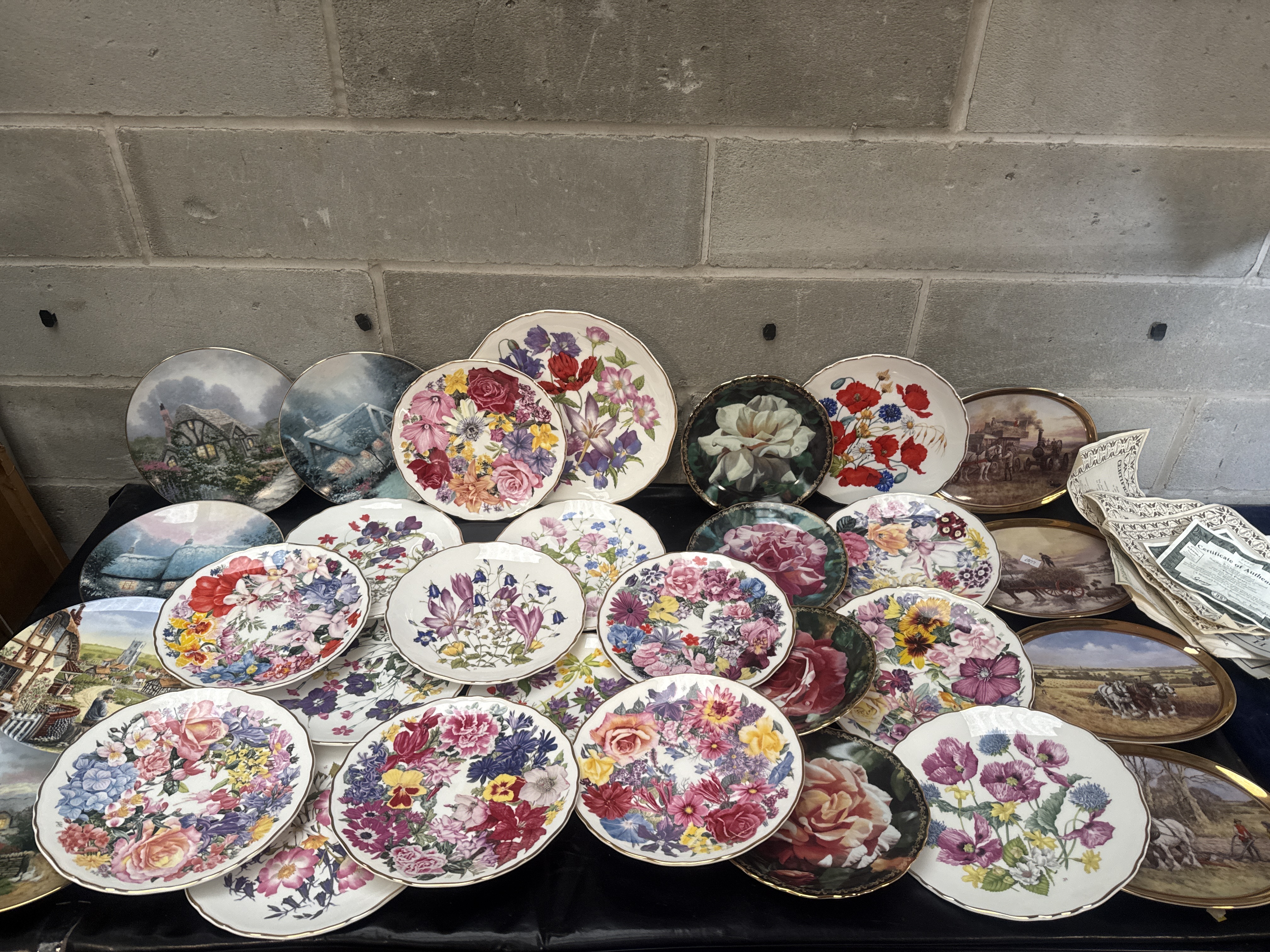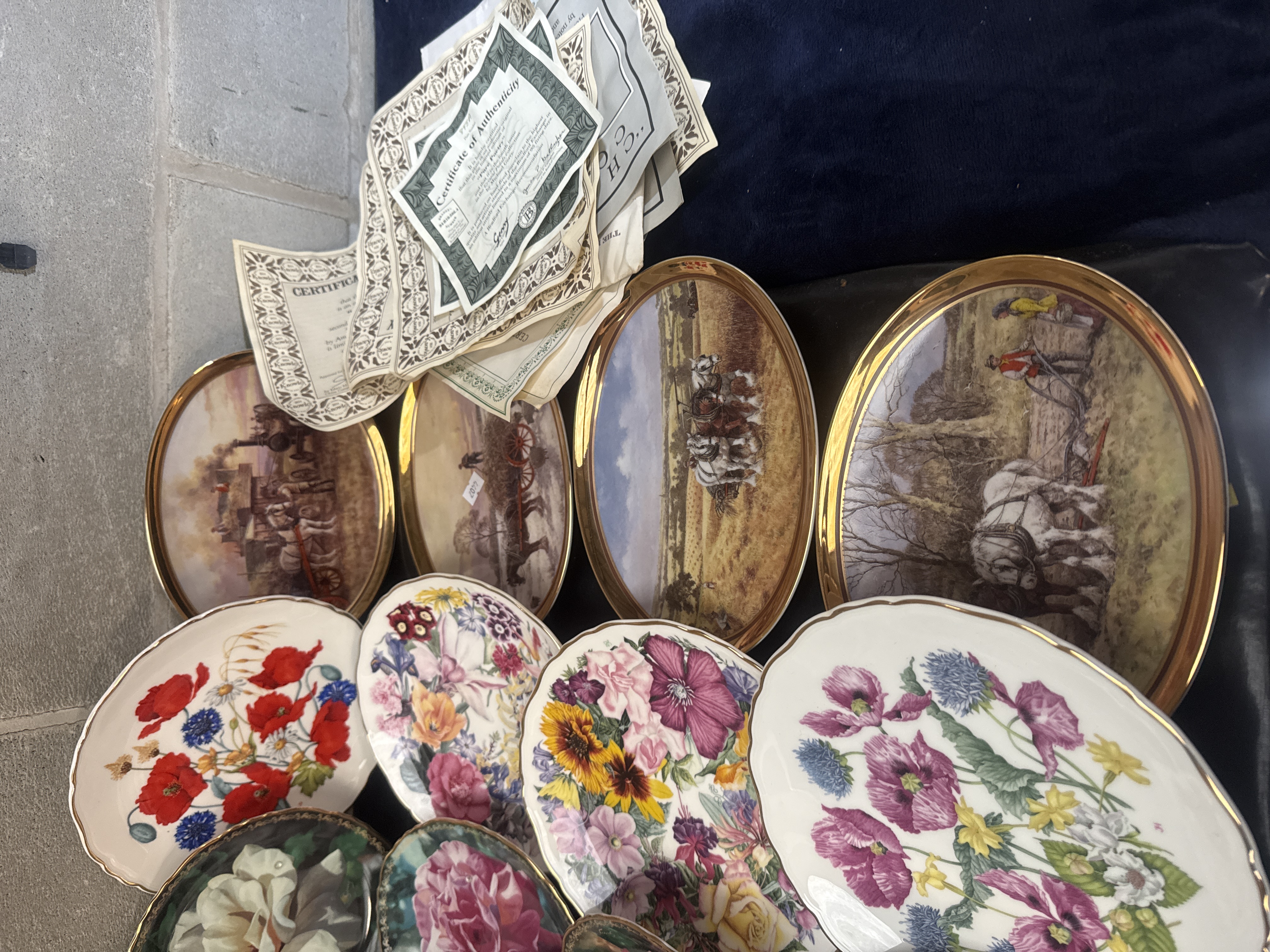 A collection of 30 decorative porcelain collector plates from various manufacturers including Royal Albert, Davenport Pottery Co. Ltd., and the Knowles China Company, with several pieces issued by the Bradford Exchange. The group features a variety of series such as Pure Poetry by Michael Gerry, A Golden Year by J.L. Chapman, and A Bouquet for the Queen Mother by Sara Anne Schofield. The plates are primarily constructed from fine or hard-fire porcelain and many feature gilt-edged rims. Decorative motifs include floral bouquets, botanical illustrations, and pastoral landscapes. Reverse markings include manufacturer backstamps, series titles, and Bradex identification numbers. The collection is accompanied by a group of corresponding certificates of authenticity.