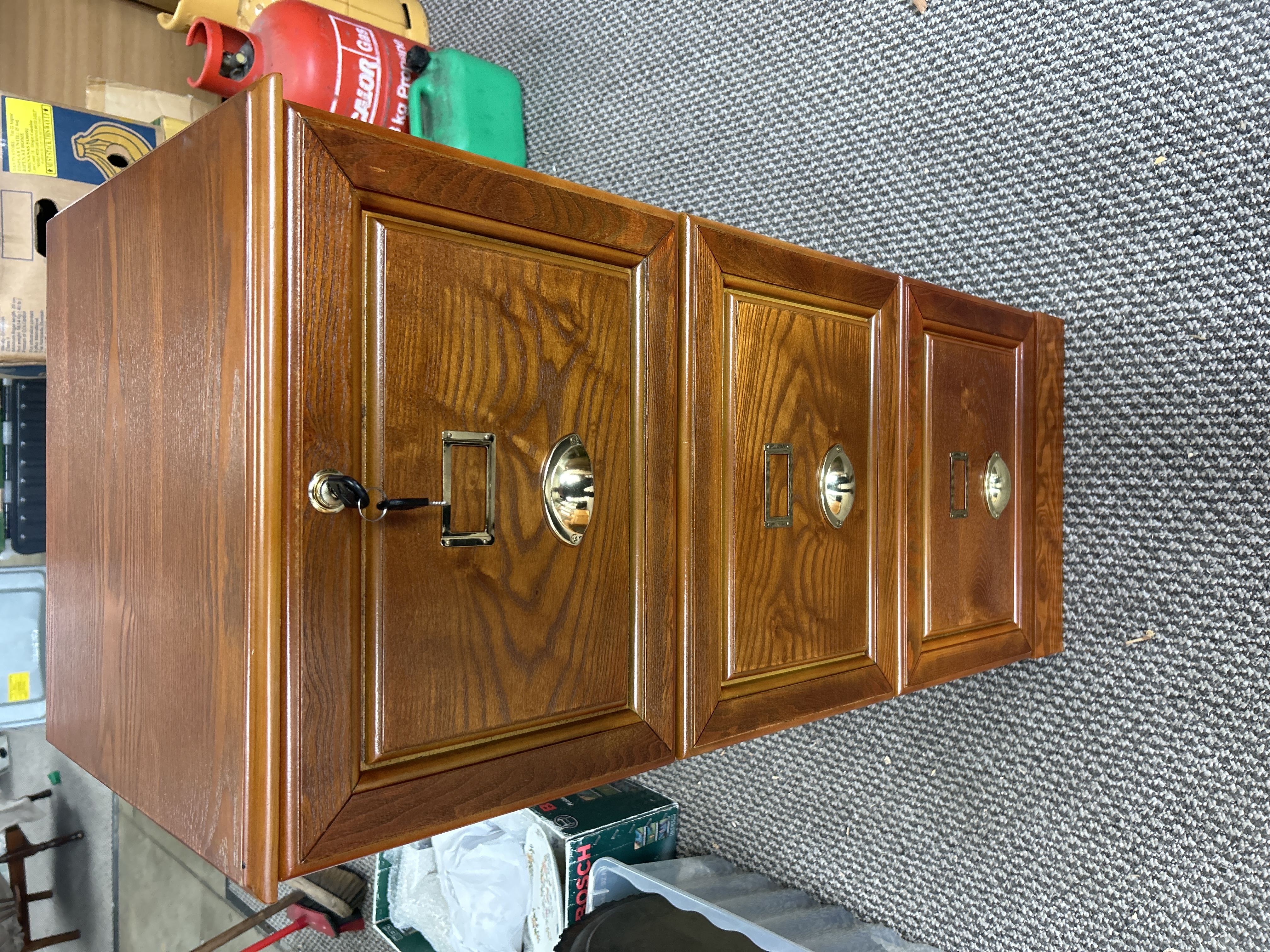 A three-drawer filing cabinet featuring a medium-toned oak-effect grain finish. The construction includes drawer fronts with raised paneling, each fitted with polished brass-toned hardware consisting of a cup-style pull handle and a rectangular label holder. The top drawer is equipped with a circular key lock and includes a set of keys. The unit is designed with a flat top and vertical side panels.