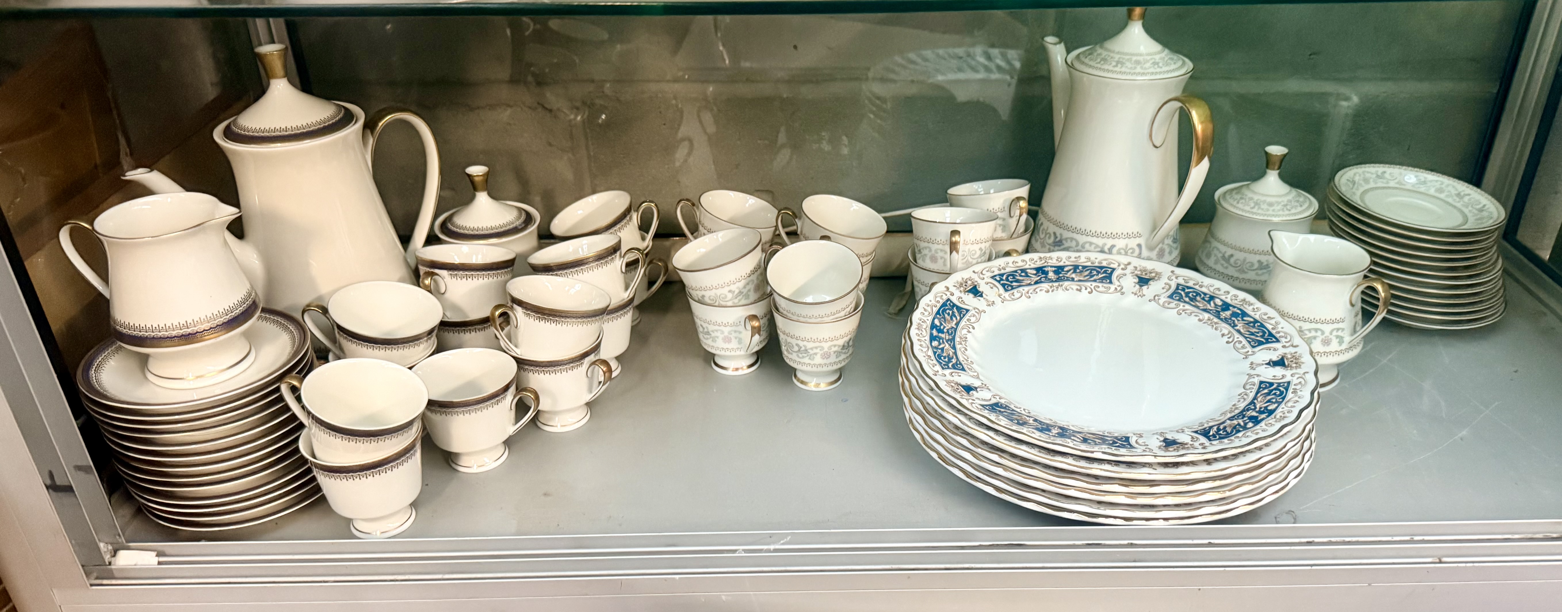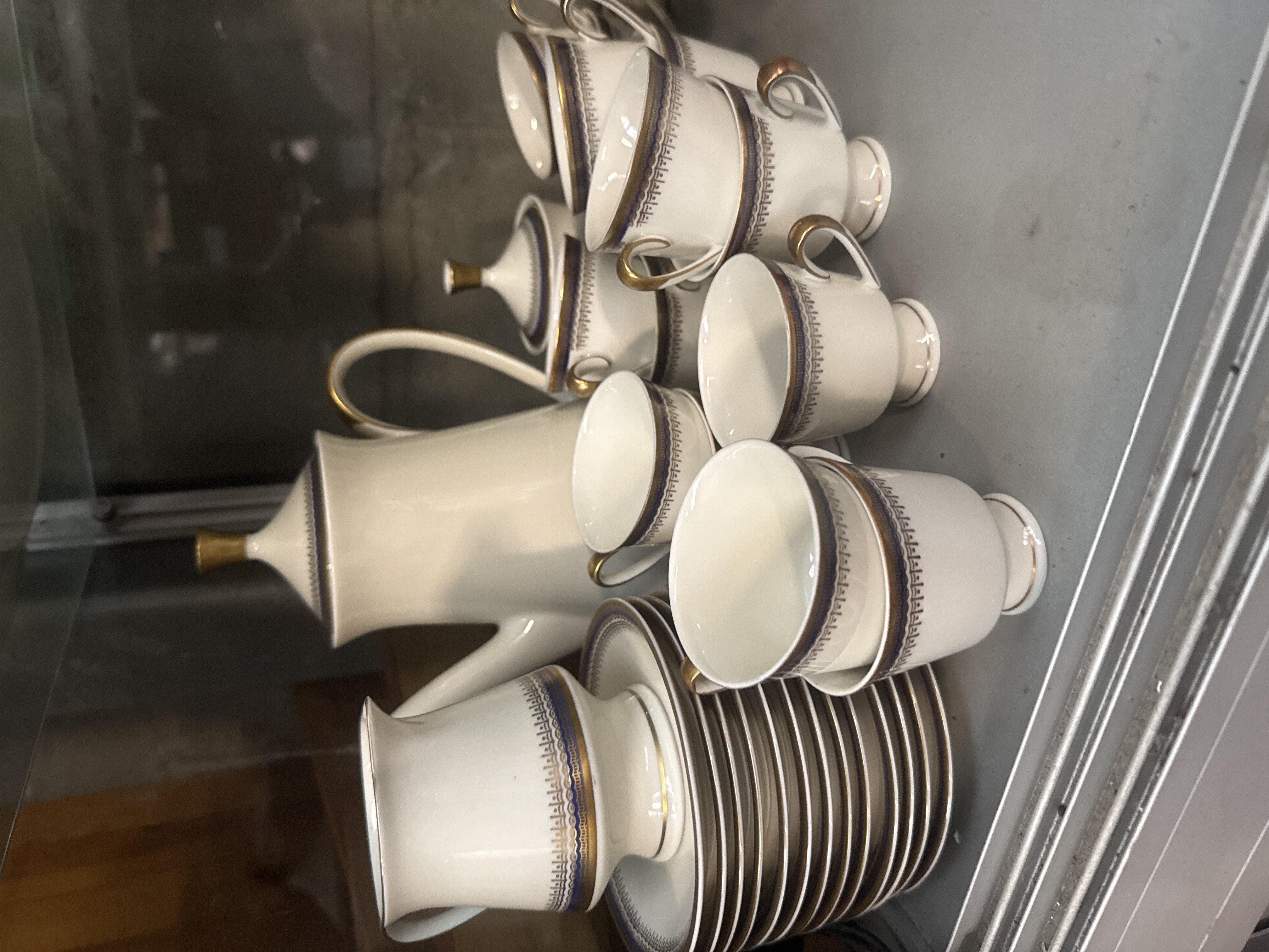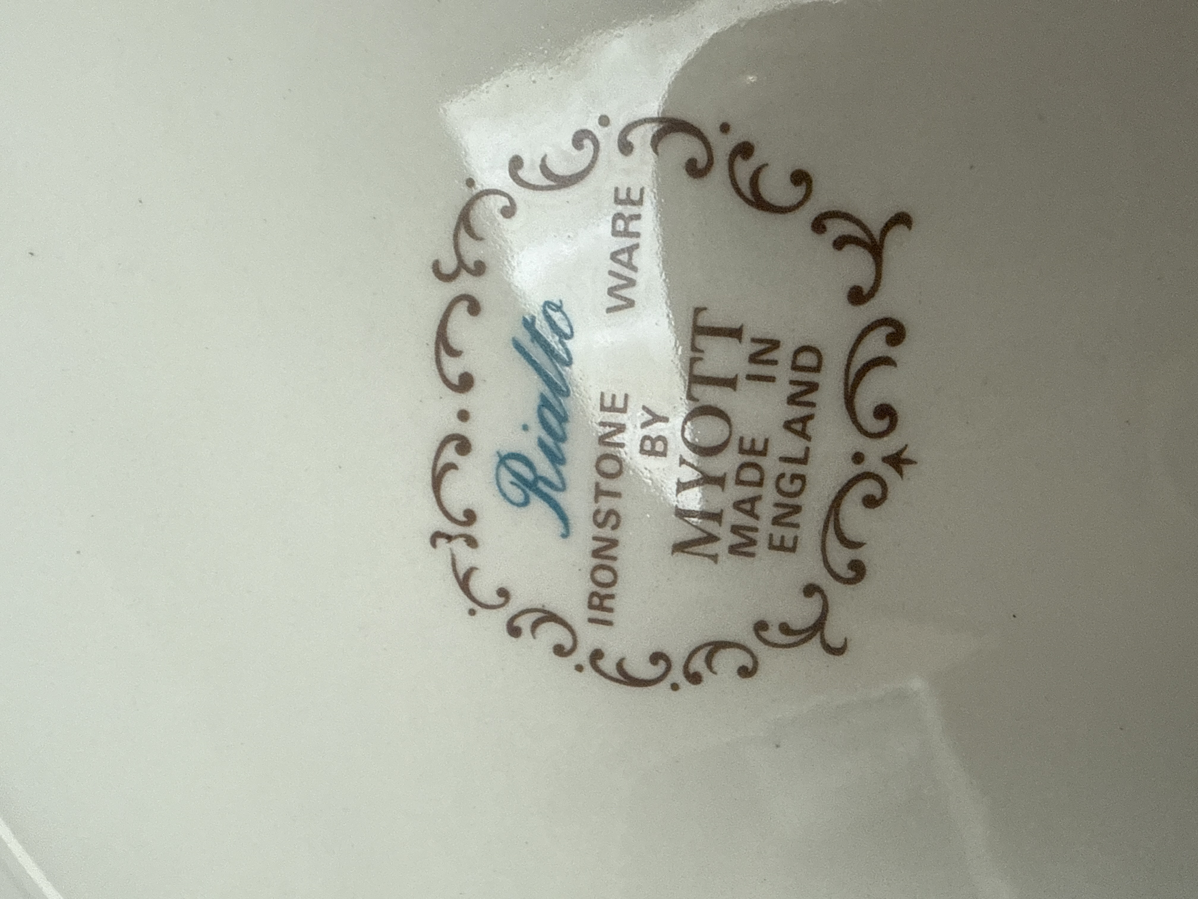 An assortment of two partial tea and dinner services. The first group is composed of white ironstone in the Rialto pattern by Myott, Made in England. This set features light blue and gray scrollwork with floral motifs and gilt rims, including a coffee pot, a lidded sugar bowl, a cream pitcher, teacups, saucers, and dinner plates. The second group is crafted from white porcelain by Johann Seltmann, Vohenstrauss, Bavaria. This service features dark navy and gold-tone geometric banding and includes a coffee pot, a cream pitcher, a lidded sugar bowl, teacups, and saucers. The bases of the Myott pieces bear the Rialto Ironstone by Myott Made in England backstamp. The Seltmann pieces are marked with the Bavaria Vohenstrauss Johann Seltmann crown logo and various numerical stamps.