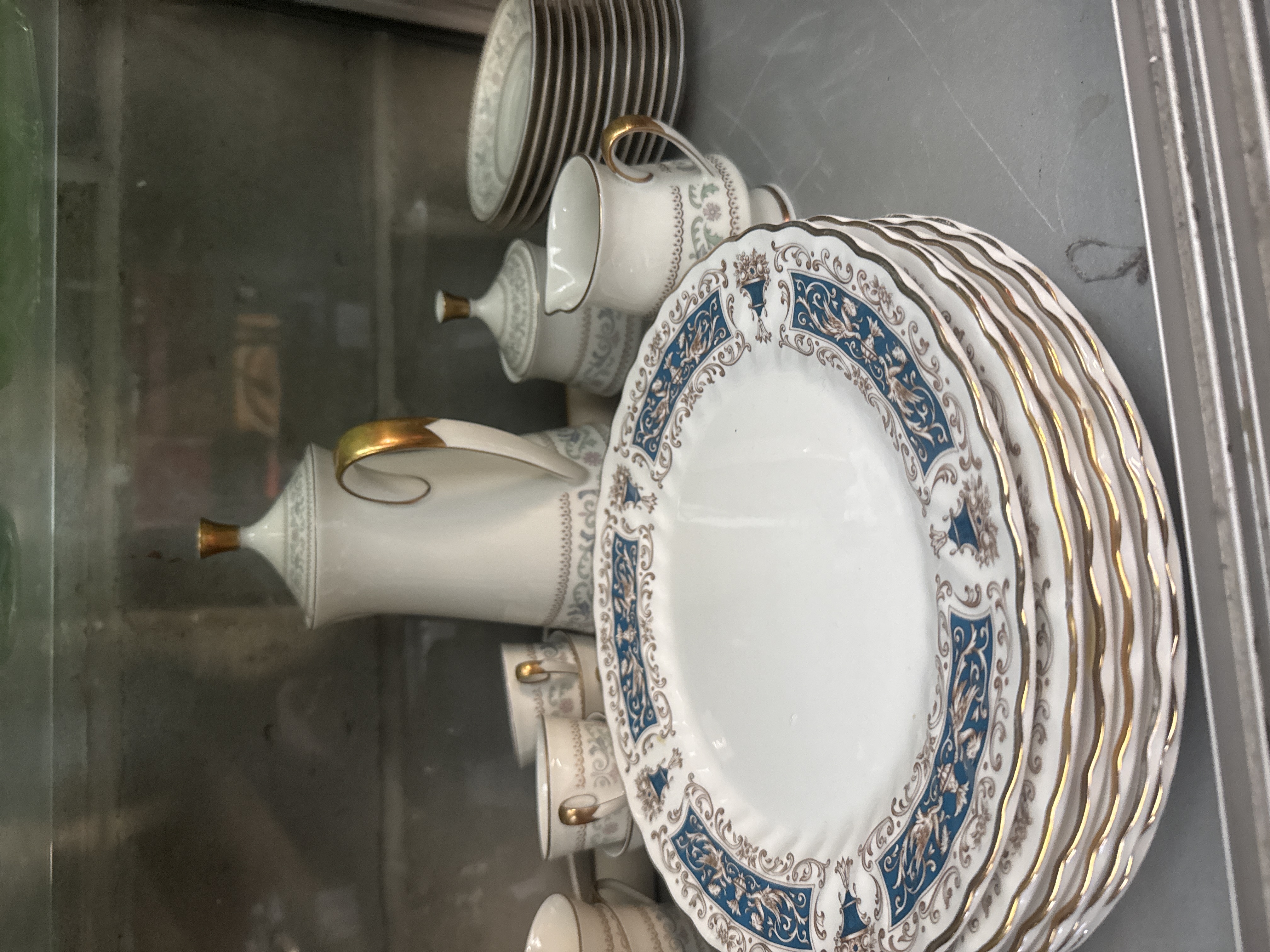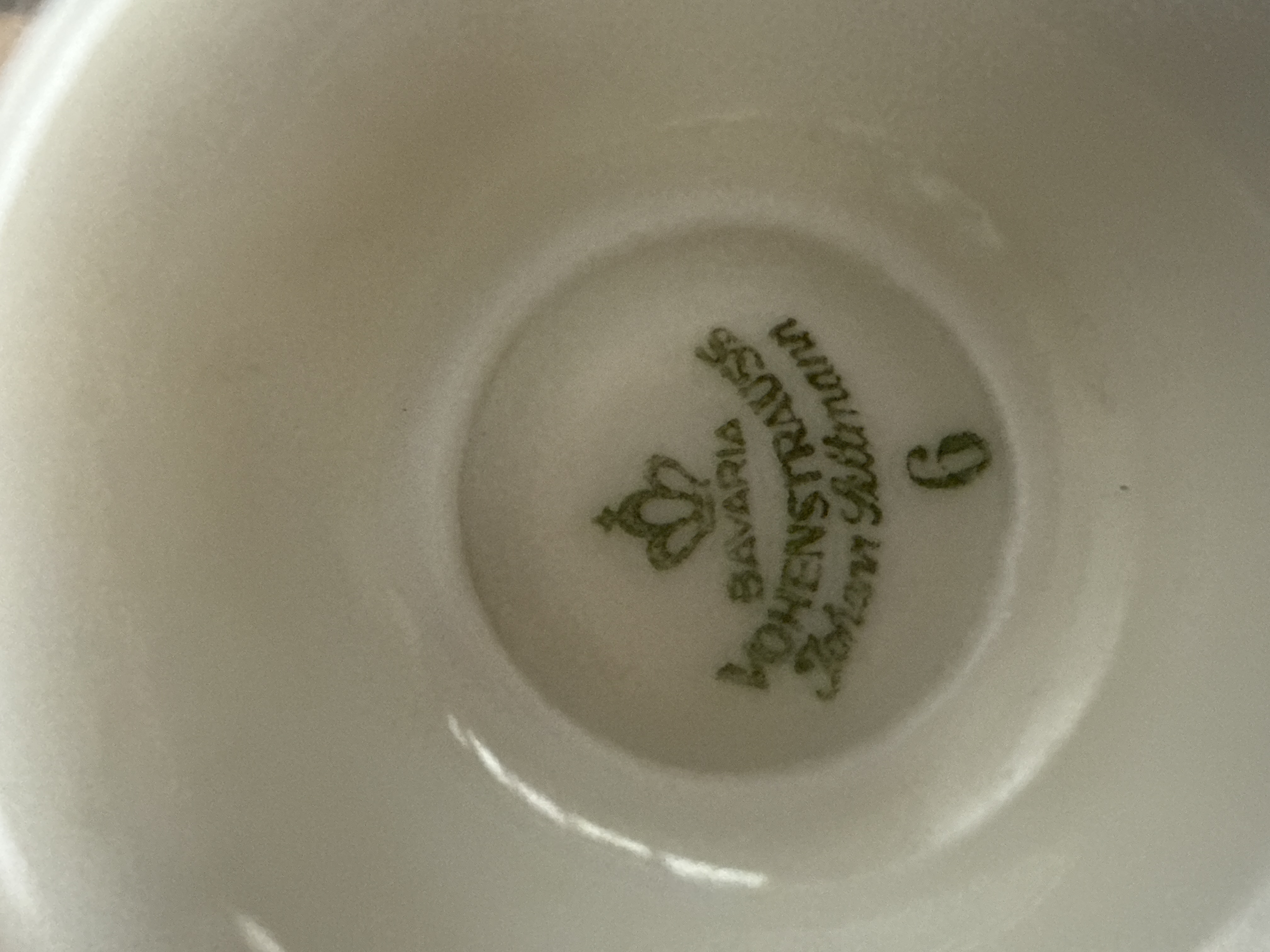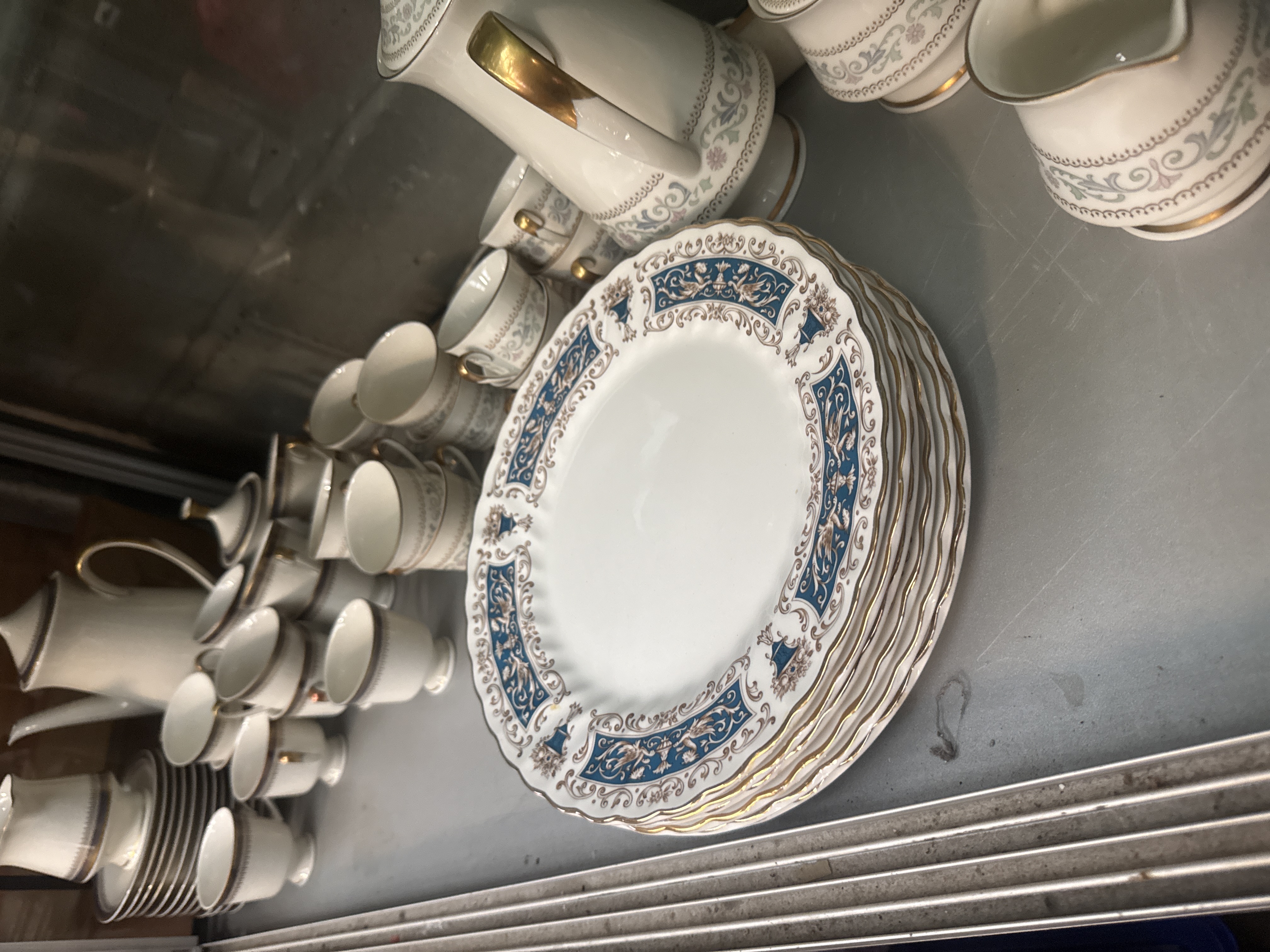 An assortment of two partial tea and dinner services. The first group is composed of white ironstone in the Rialto pattern by Myott, Made in England. This set features light blue and gray scrollwork with floral motifs and gilt rims, including a coffee pot, a lidded sugar bowl, a cream pitcher, teacups, saucers, and dinner plates. The second group is crafted from white porcelain by Johann Seltmann, Vohenstrauss, Bavaria. This service features dark navy and gold-tone geometric banding and includes a coffee pot, a cream pitcher, a lidded sugar bowl, teacups, and saucers. The bases of the Myott pieces bear the Rialto Ironstone by Myott Made in England backstamp. The Seltmann pieces are marked with the Bavaria Vohenstrauss Johann Seltmann crown logo and various numerical stamps.