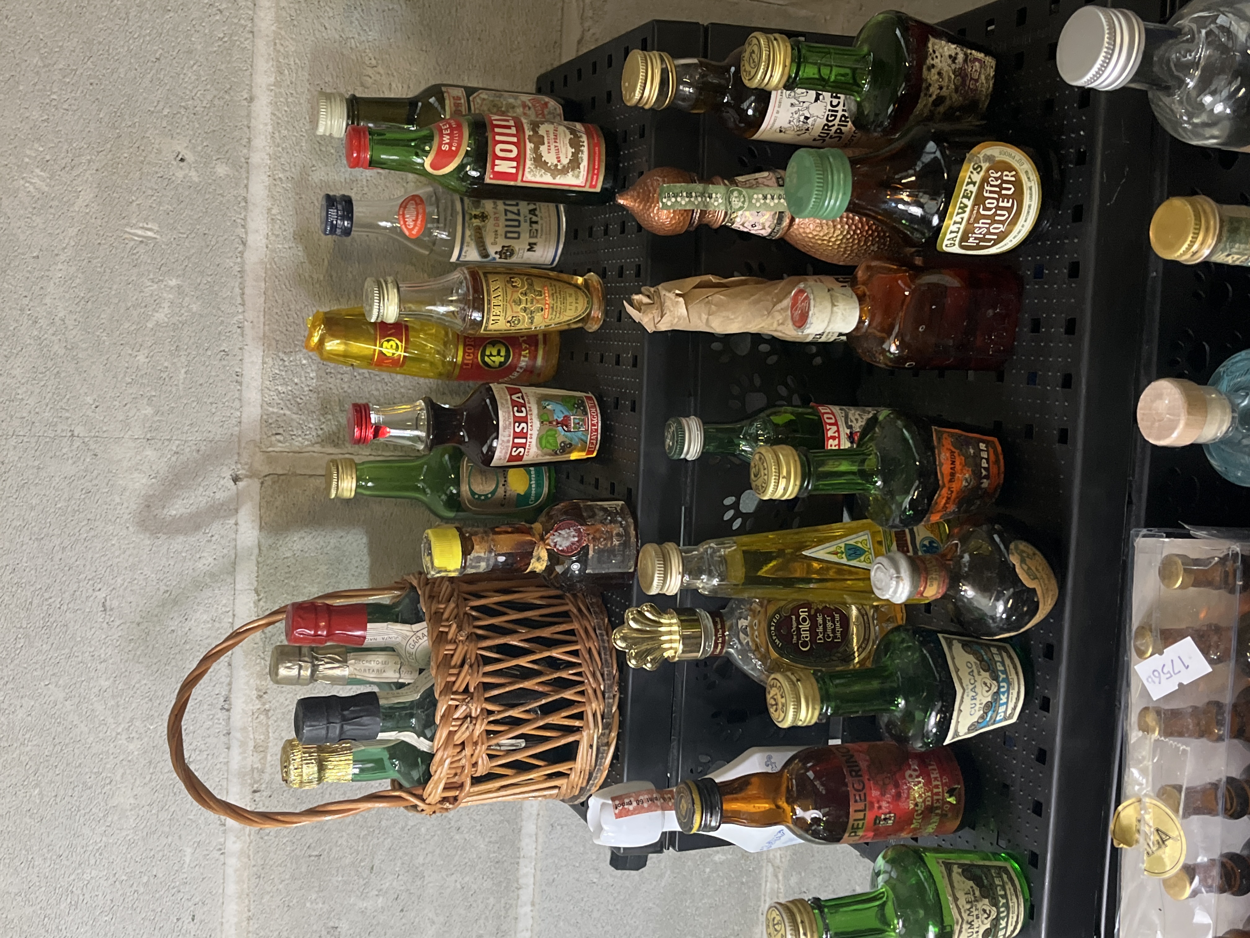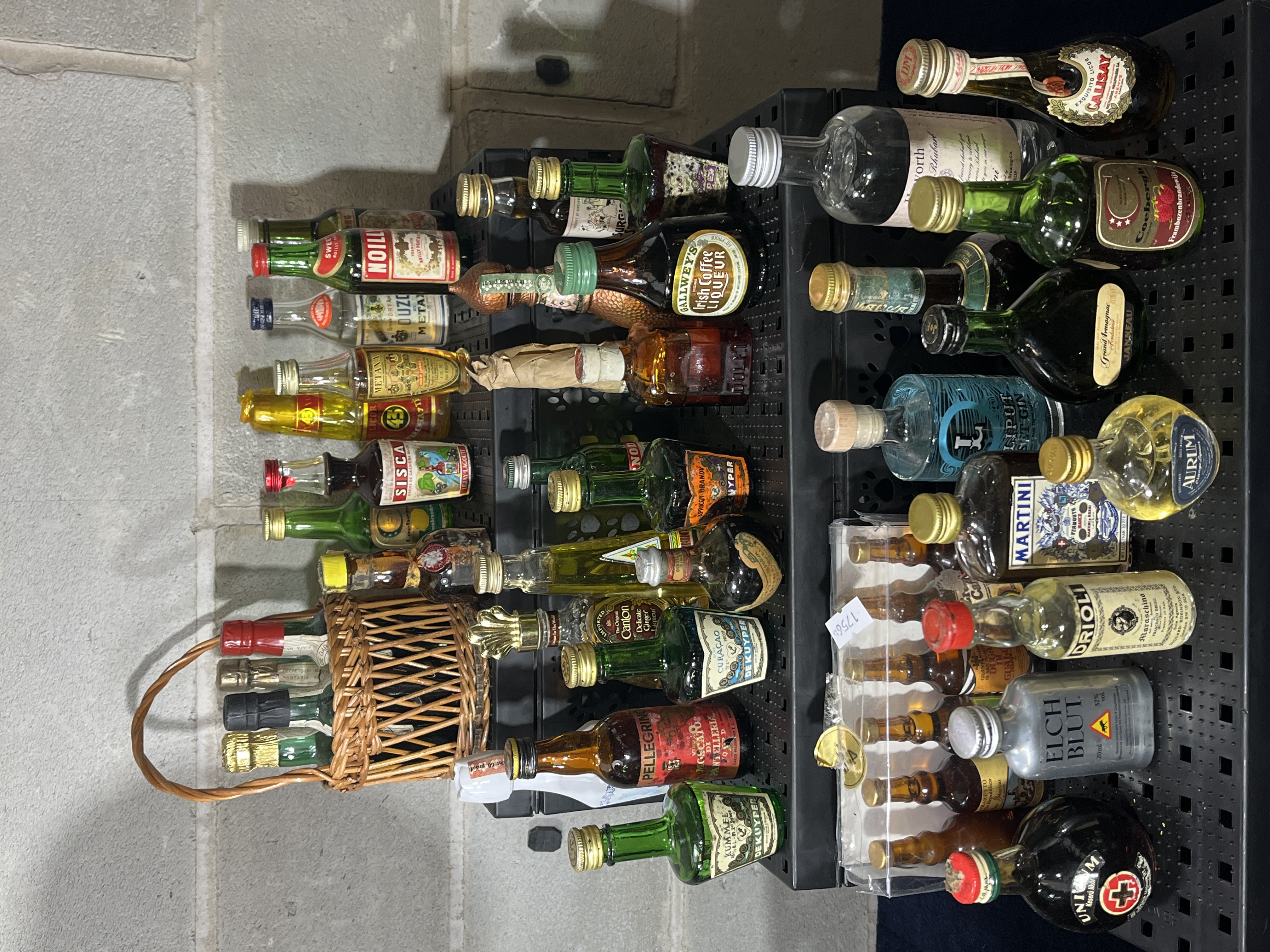 An assortment of vintage miniature liquor and spirit bottles of international origin. The collection includes a diverse range of glass vessels containing various spirits and liqueurs. Notable brands represented include Gallwey’s Irish Coffee Liqueur, Noilly Prat vermouth, Martini, De Kuyper (Curaçao and Kummel), Metaxa, Pellegrino, and Unicum. Labels are printed in multiple languages, including English, Italian, and German. Several bottles retain original seals and tax stamps. The group is accompanied by a small decorative wicker basket and a clear plastic display sleeve containing a subset of bottles.