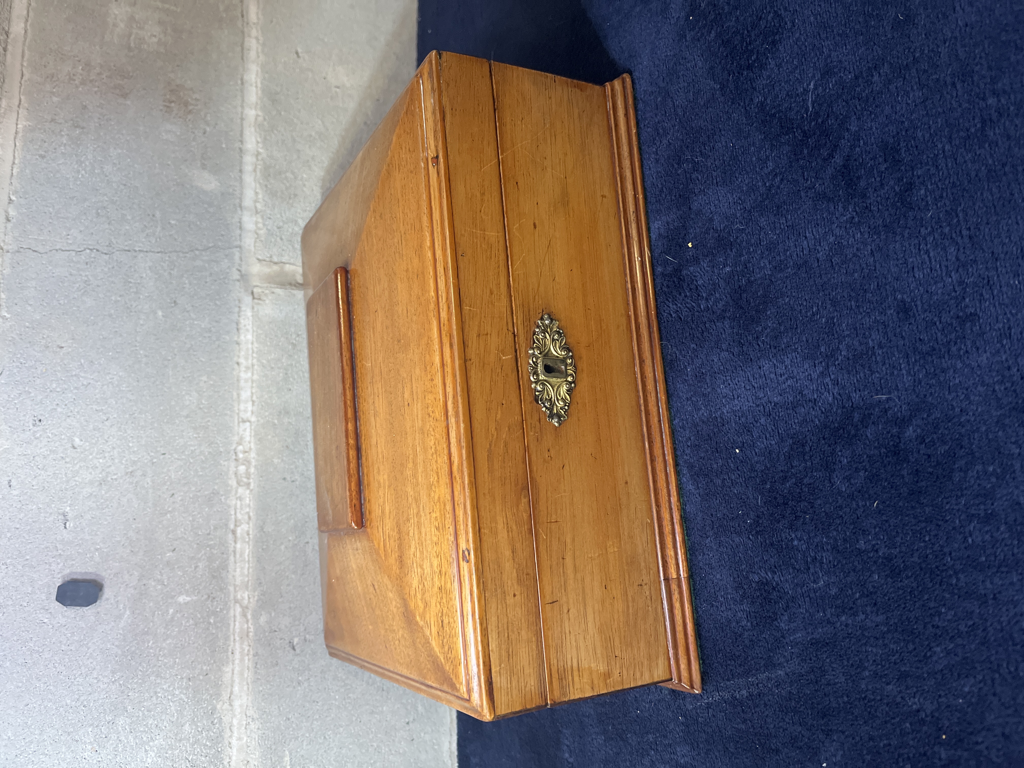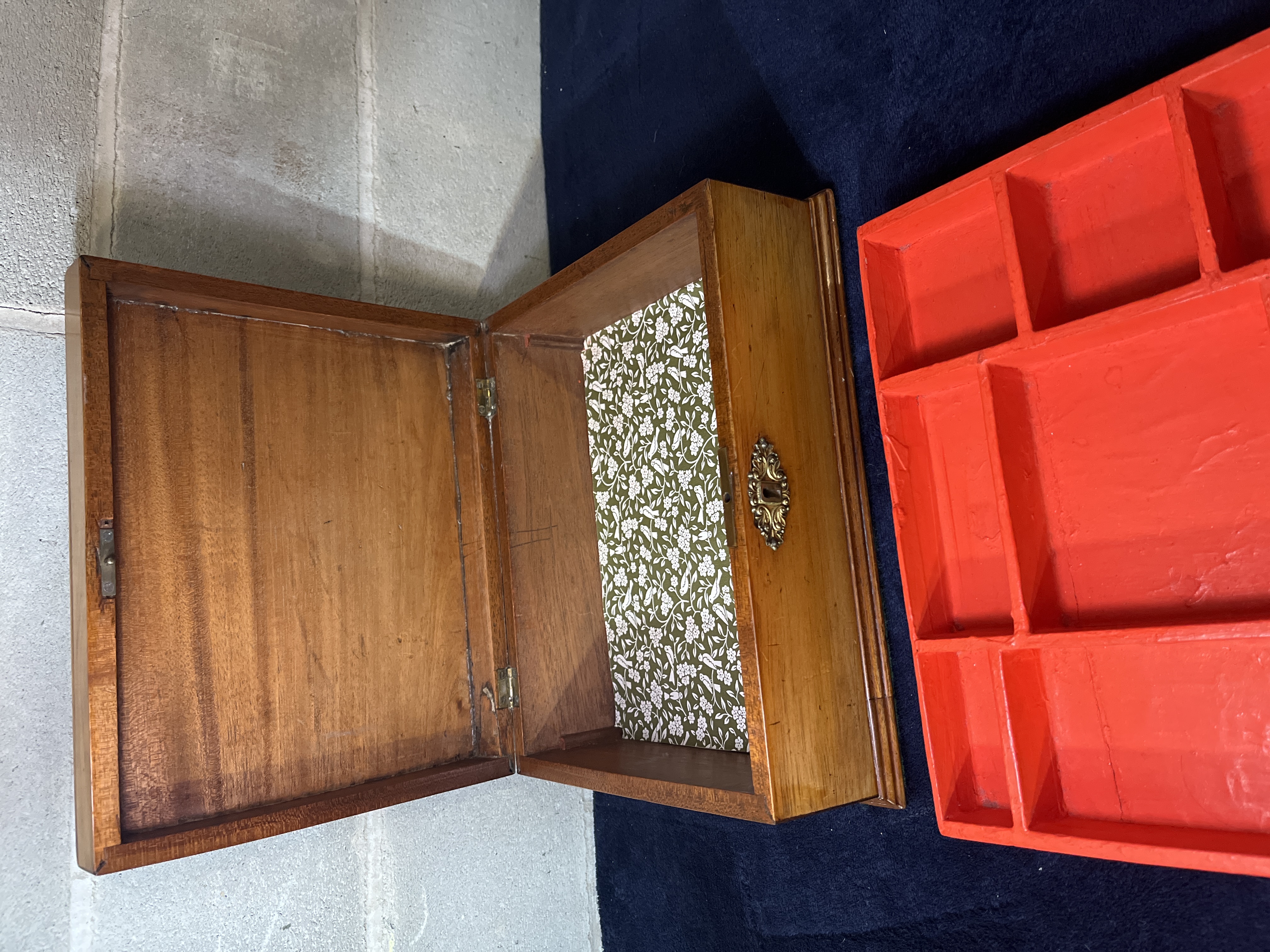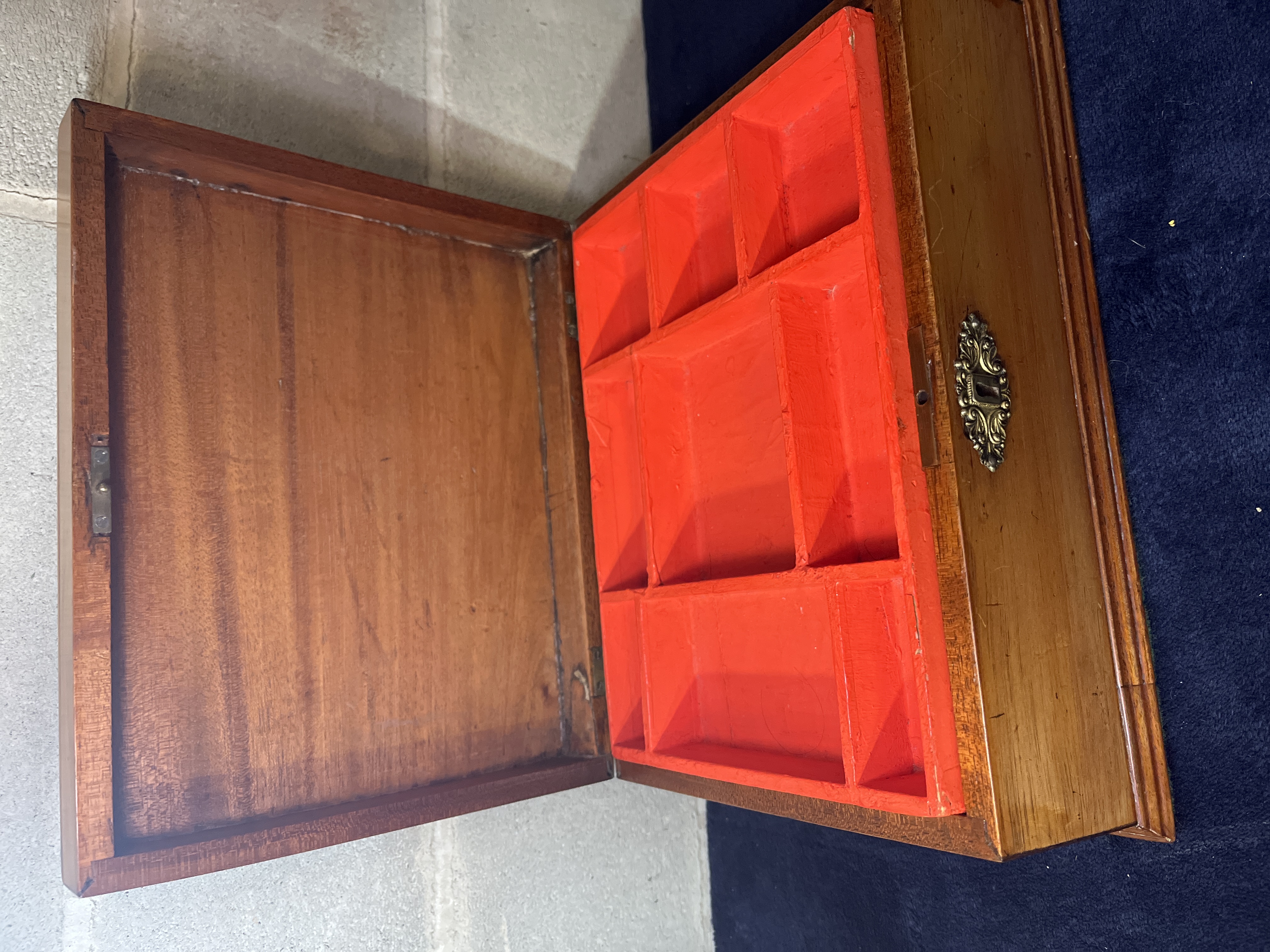 This 19th-century box is constructed from a polished hardwood. The box features a rectangular form measuring 12 inches by 9 inches with a slanted, hinged lid and is decorated with an ornate brass scrollwork escutcheon at the keyhole. The interior houses a removable, tiered wooden tray painted red with multiple compartments of various sizes. Beneath the tray, the bottom surface is lined with a green and white floral-patterned paper.