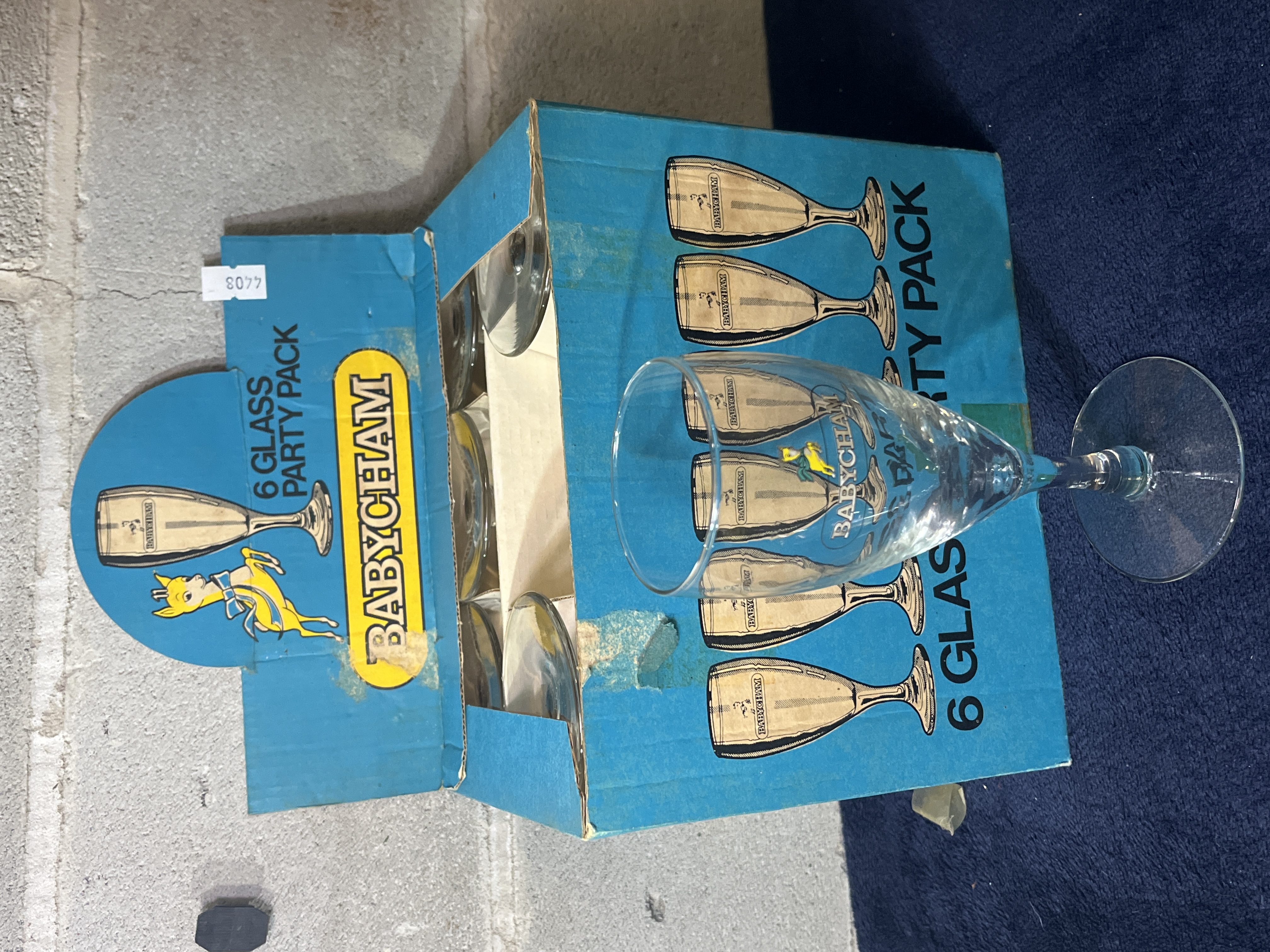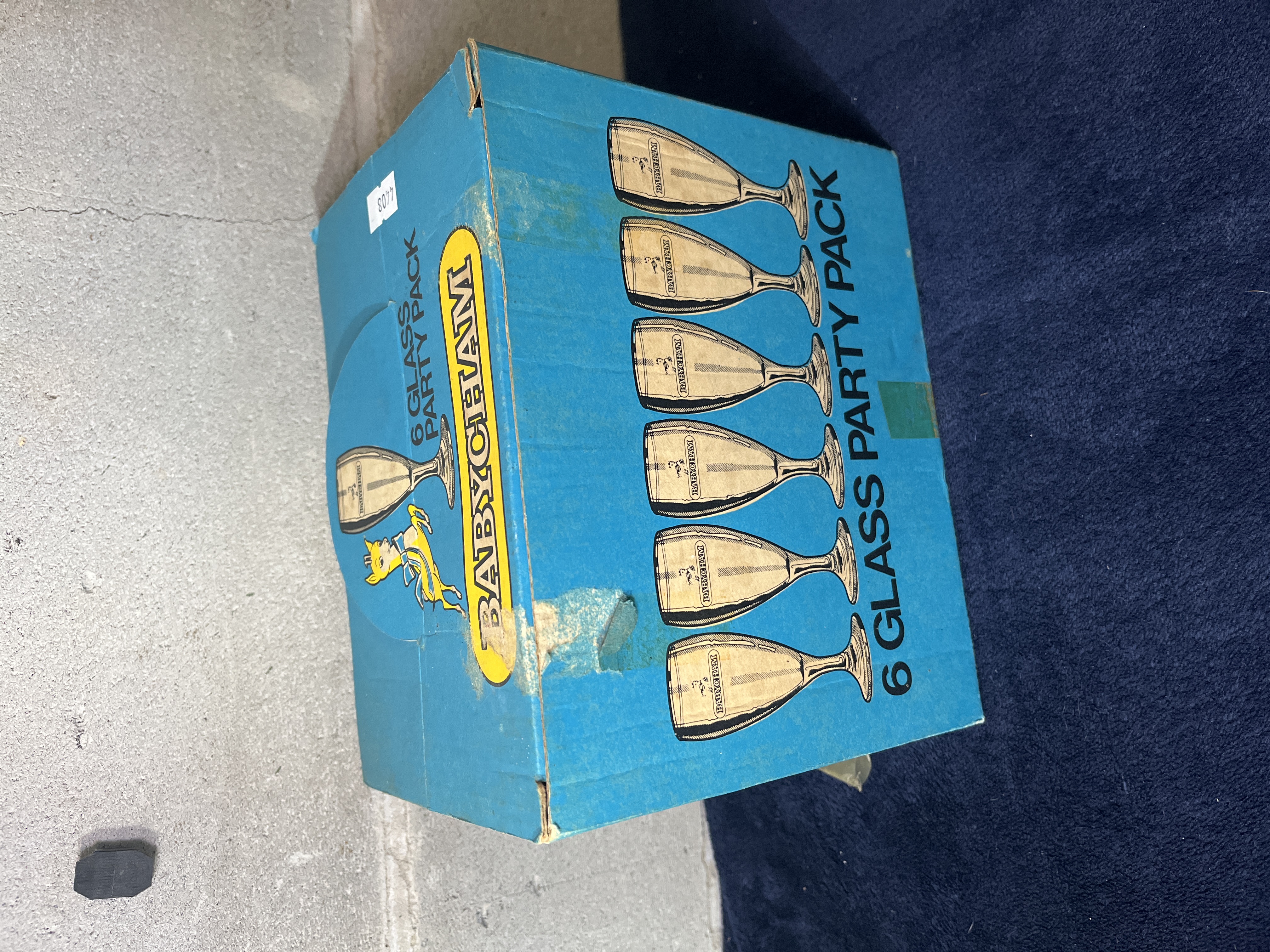 A set of six vintage Babycham advertising flutes. Each clear glass flute features printed enamel graphics depicting the yellow chamois mascot and the Babycham brand name. The set is presented in its original blue cardboard retail packaging, which is printed with the text 6 GLASS PARTY PACK and features period-specific branding and illustrations. These items are examples of commercial barware produced during the mid-to-late 20th century.