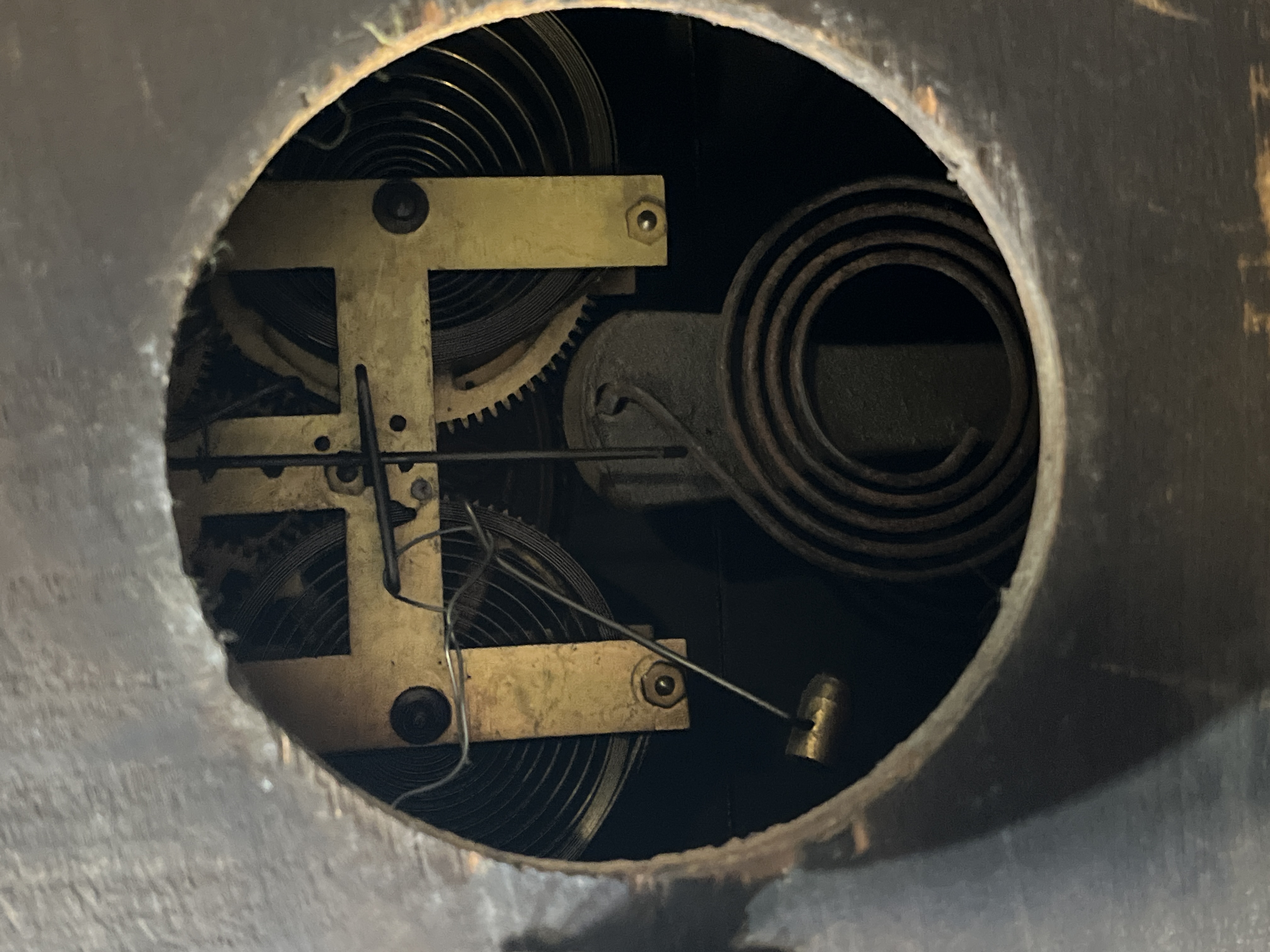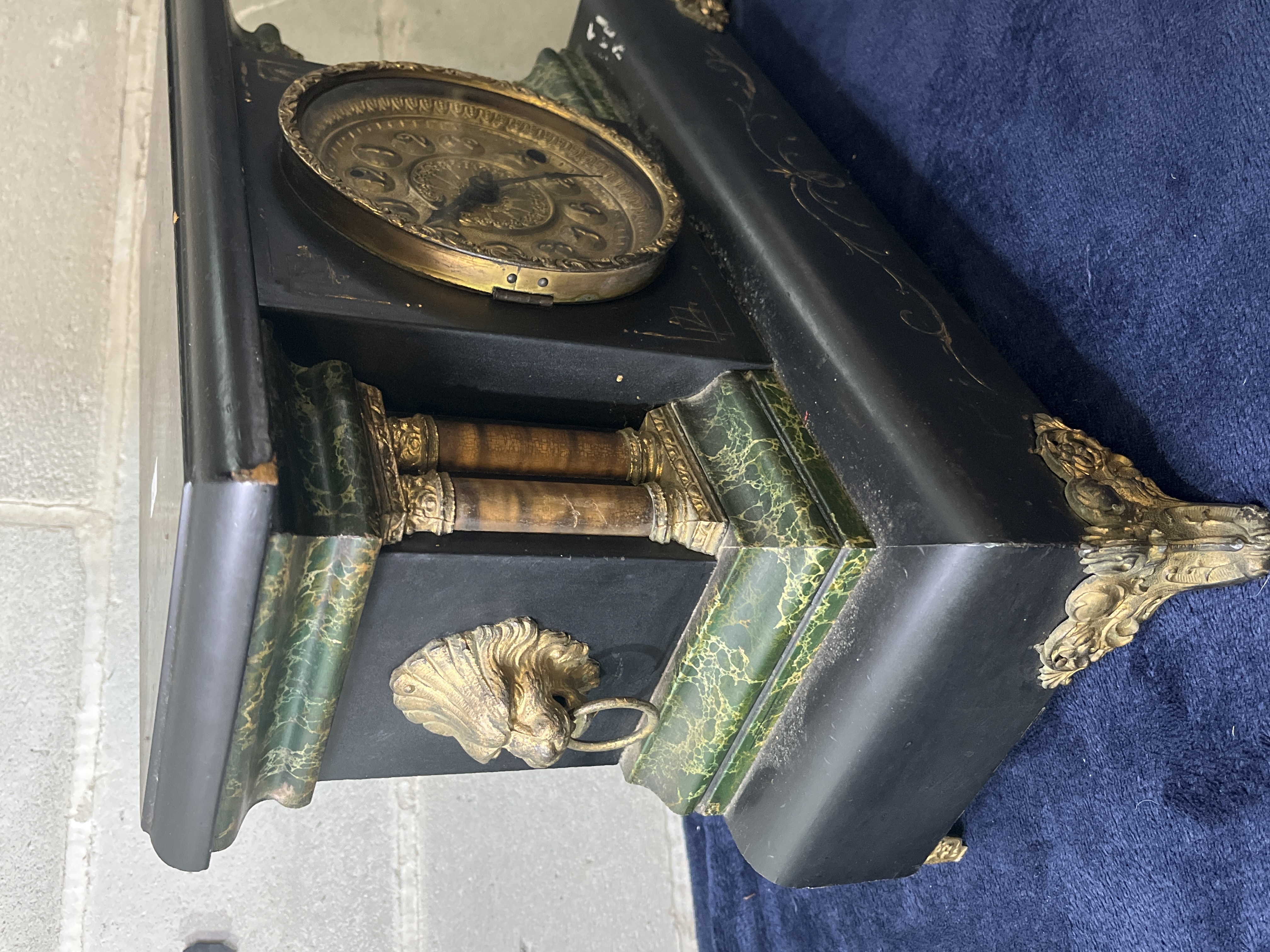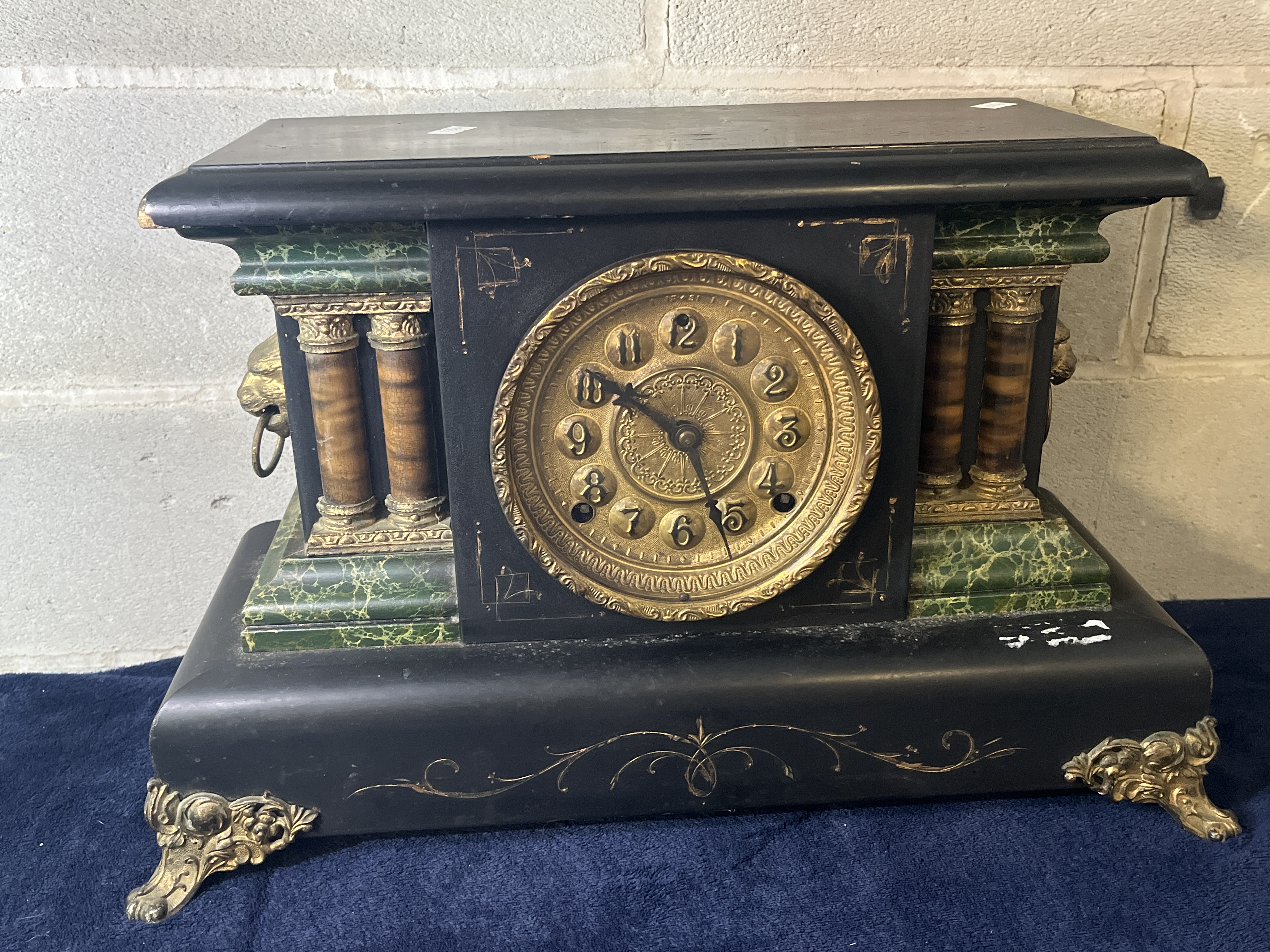 A Seth Thomas mantel clock featuring an architectural case with an adamantine faux-marble finish. The rectangular black case is accented with green faux-marble panels and four decorative columns with gilt-tone capitals and bases. The circular brass-tone dial displays Arabic numerals on raised roundels and includes two winding holes for the mechanical movement. Decorative elements include cast metal lion-head side handles, ornate scroll feet, and gilded filigree detailing on the front and base. A rear circular aperture reveals the internal mechanical movement consisting of brass plates, gears, and mainsprings.