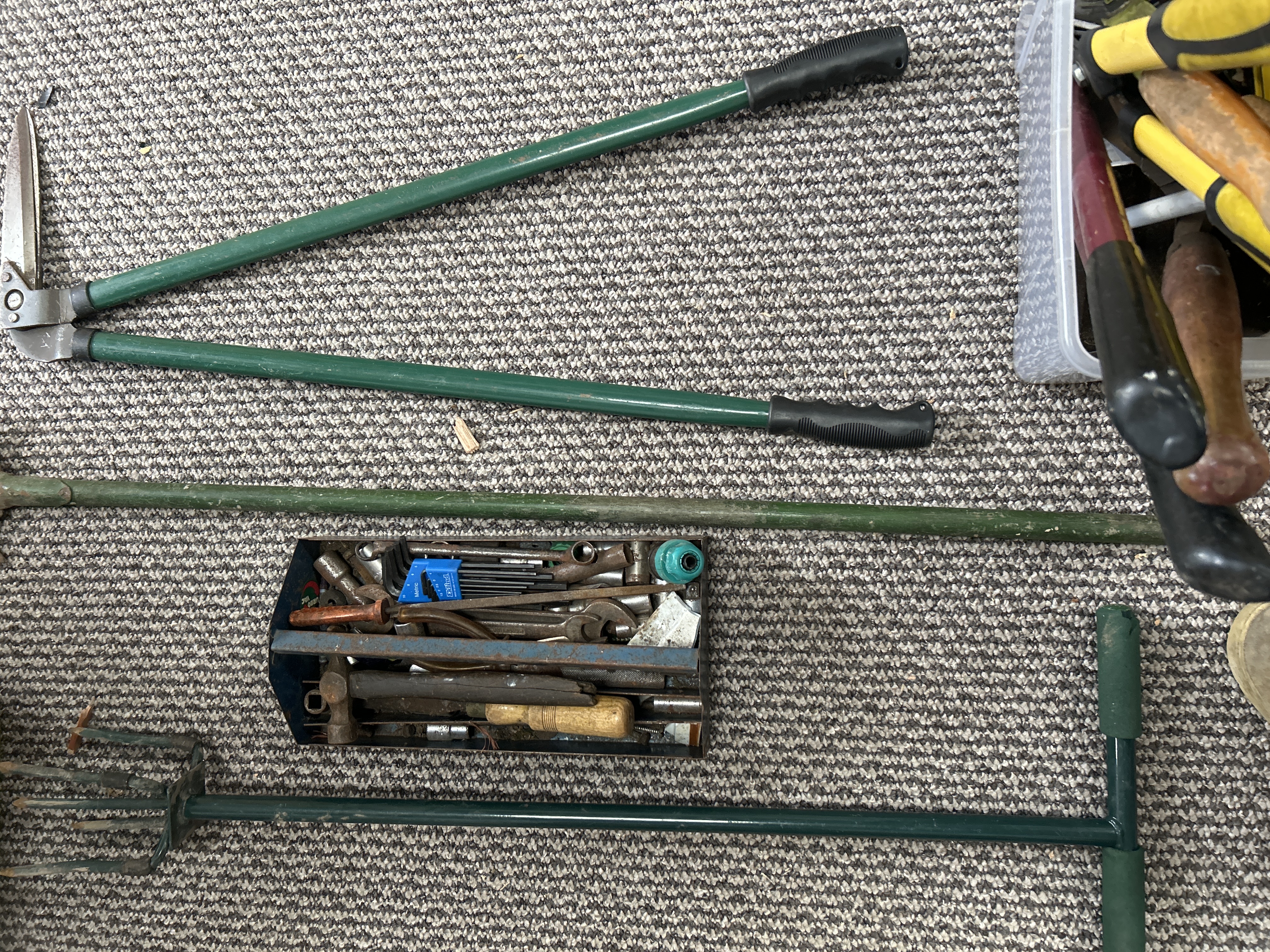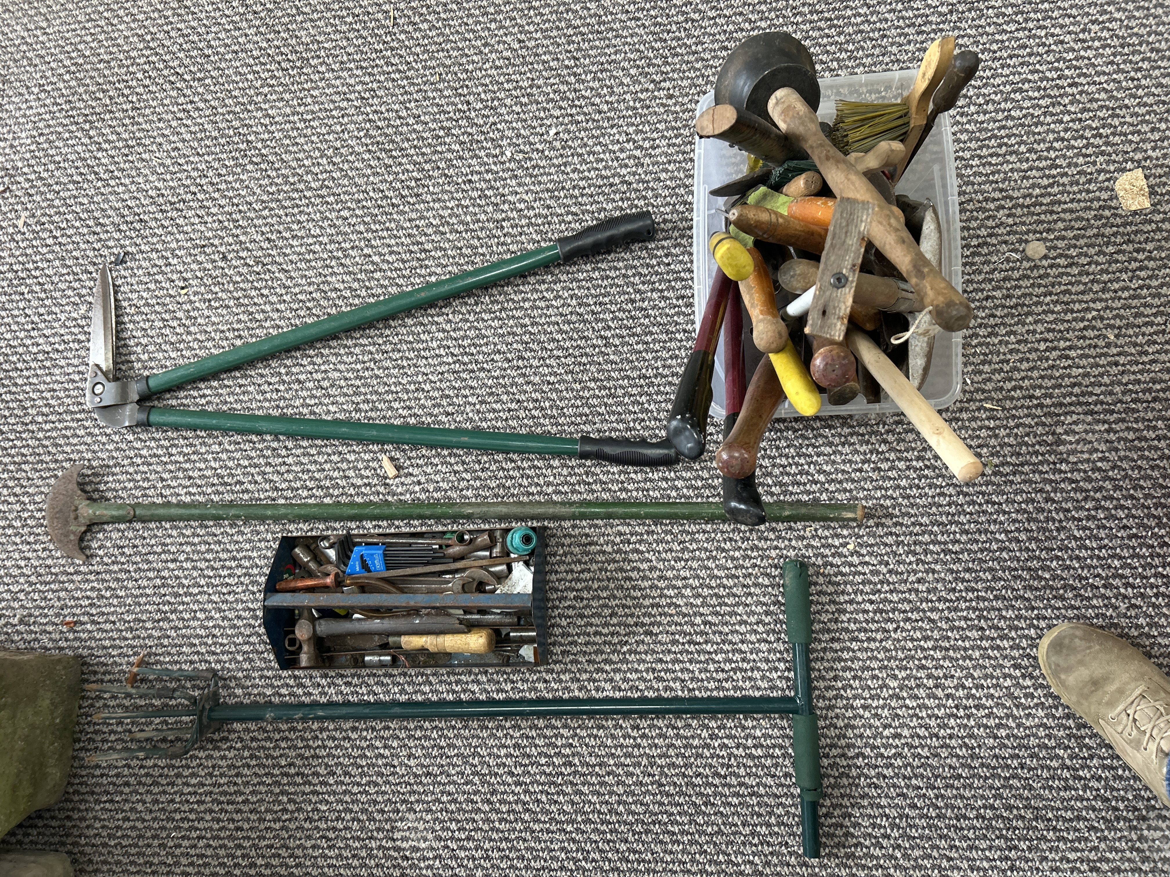 An assortment of hand tools for garden and workshop maintenance. The lot includes long-handled garden shears with green metal arms and black grips, an edging iron, and a garden fork. A metal toolbox contains various implements including hammers, wrenches, and a set of Eklind brand metric hex keys. A clear plastic tub contains multiple hand tools including mallets and hammers with wooden handles, wire brushes, a rubber plunger, and screwdrivers with plastic and wooden grips. The items are primarily constructed from steel, wood, and plastic.