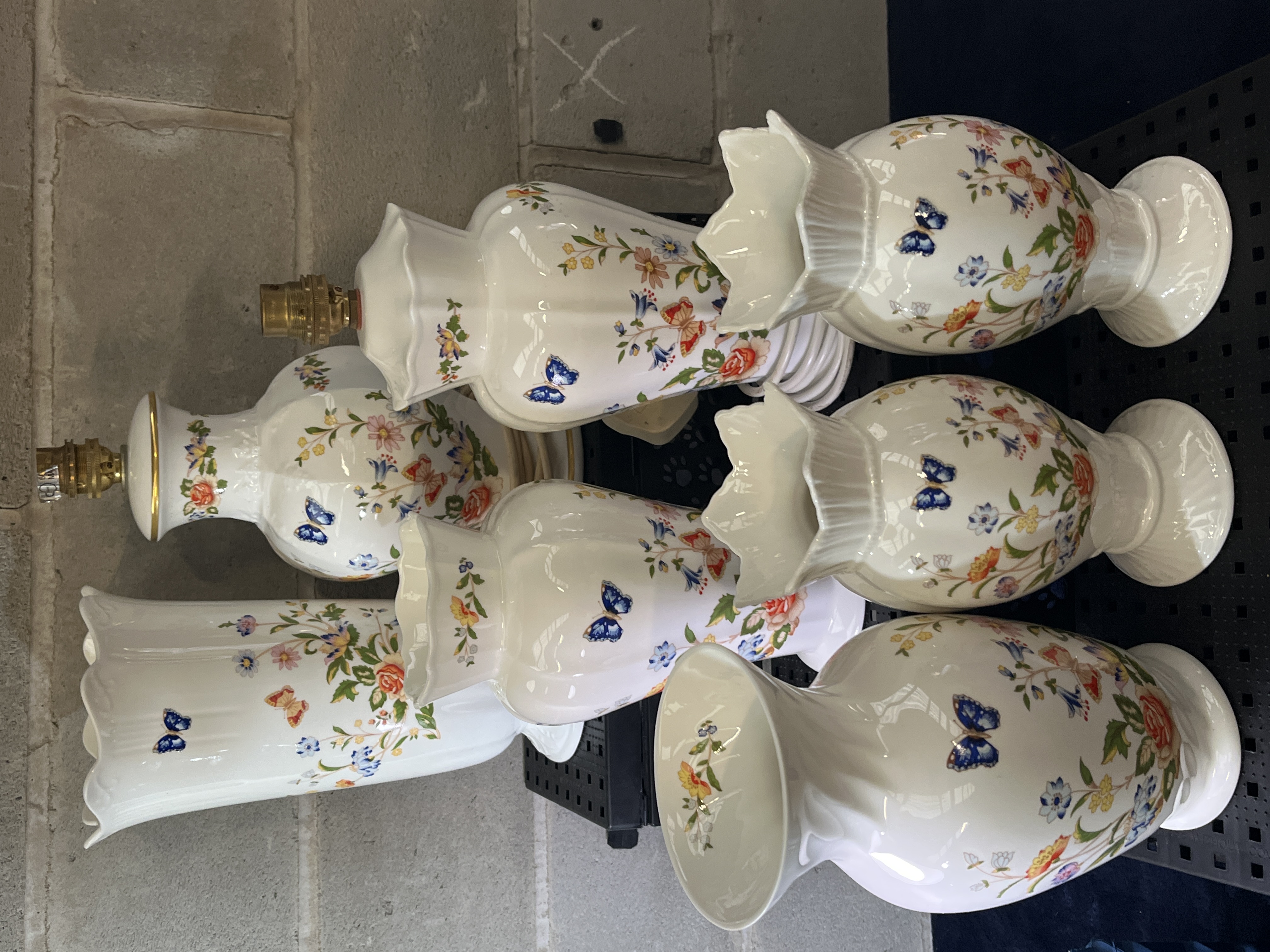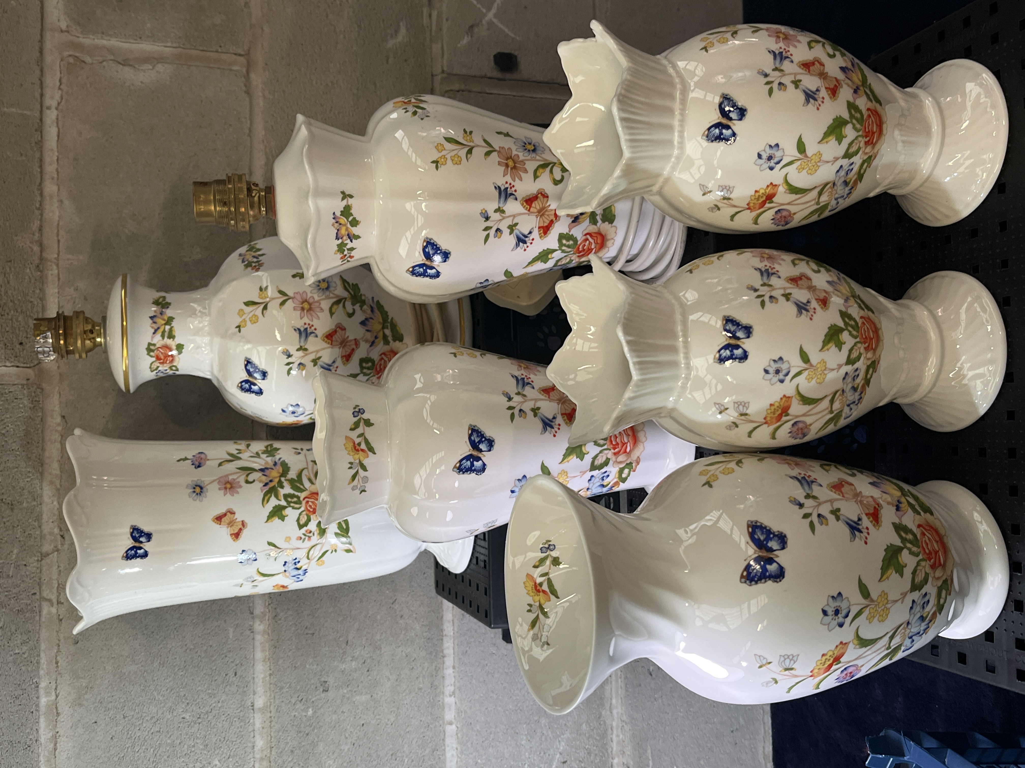 A collection of fine bone china decorative items produced by John Aynsley and Sons in the Cottage Garden pattern. The group consists of several vases of varying forms and table lamp bases. Each piece features a white glazed ground decorated with polychrome transfer-printed motifs of butterflies and various floral sprays, including roses and wildflowers. The vases exhibit diverse shapes such as baluster and cylindrical forms, with some featuring fluted or scalloped rims. The lamp bases are fitted with brass-tone sockets and white electrical cords.