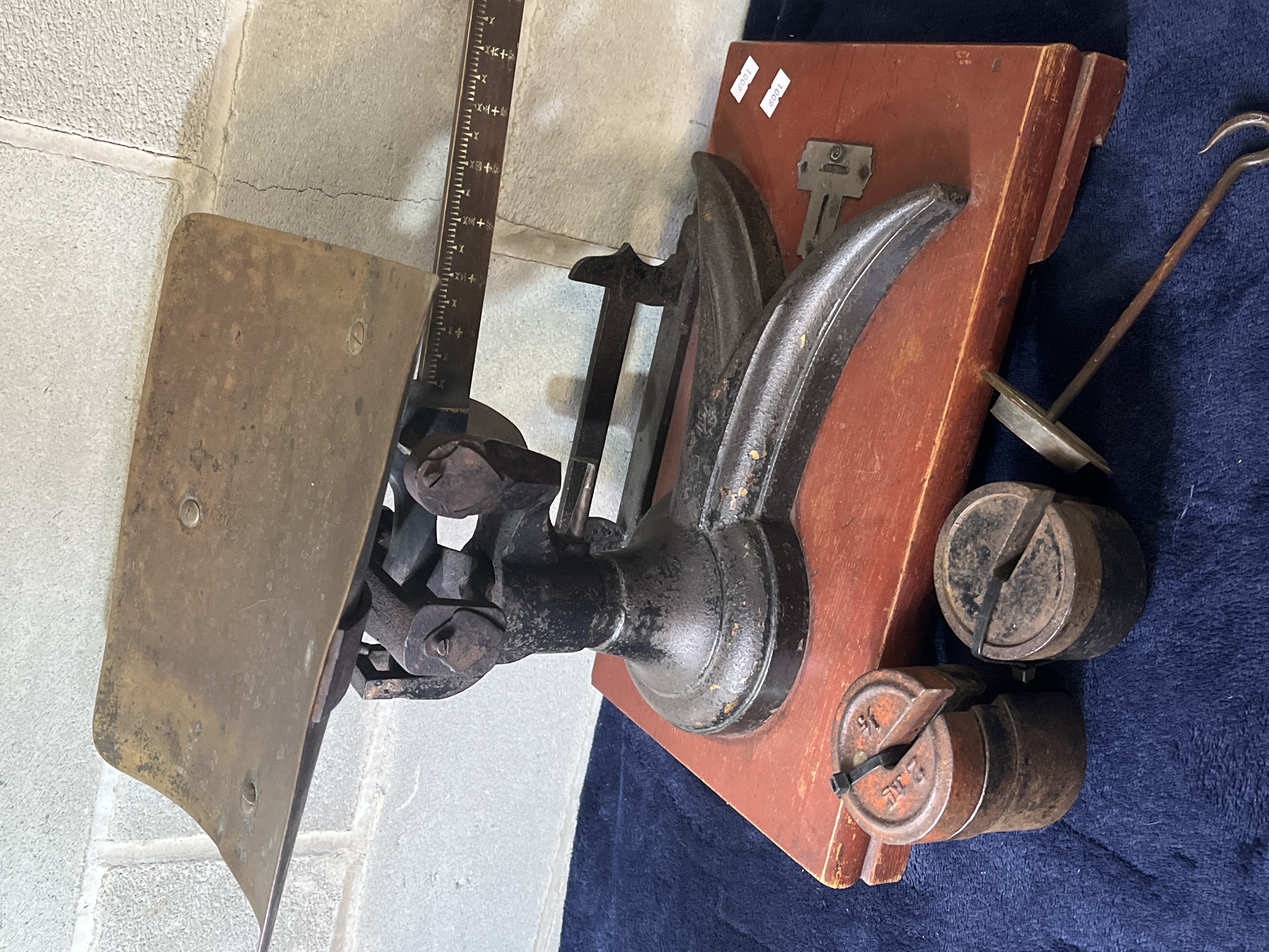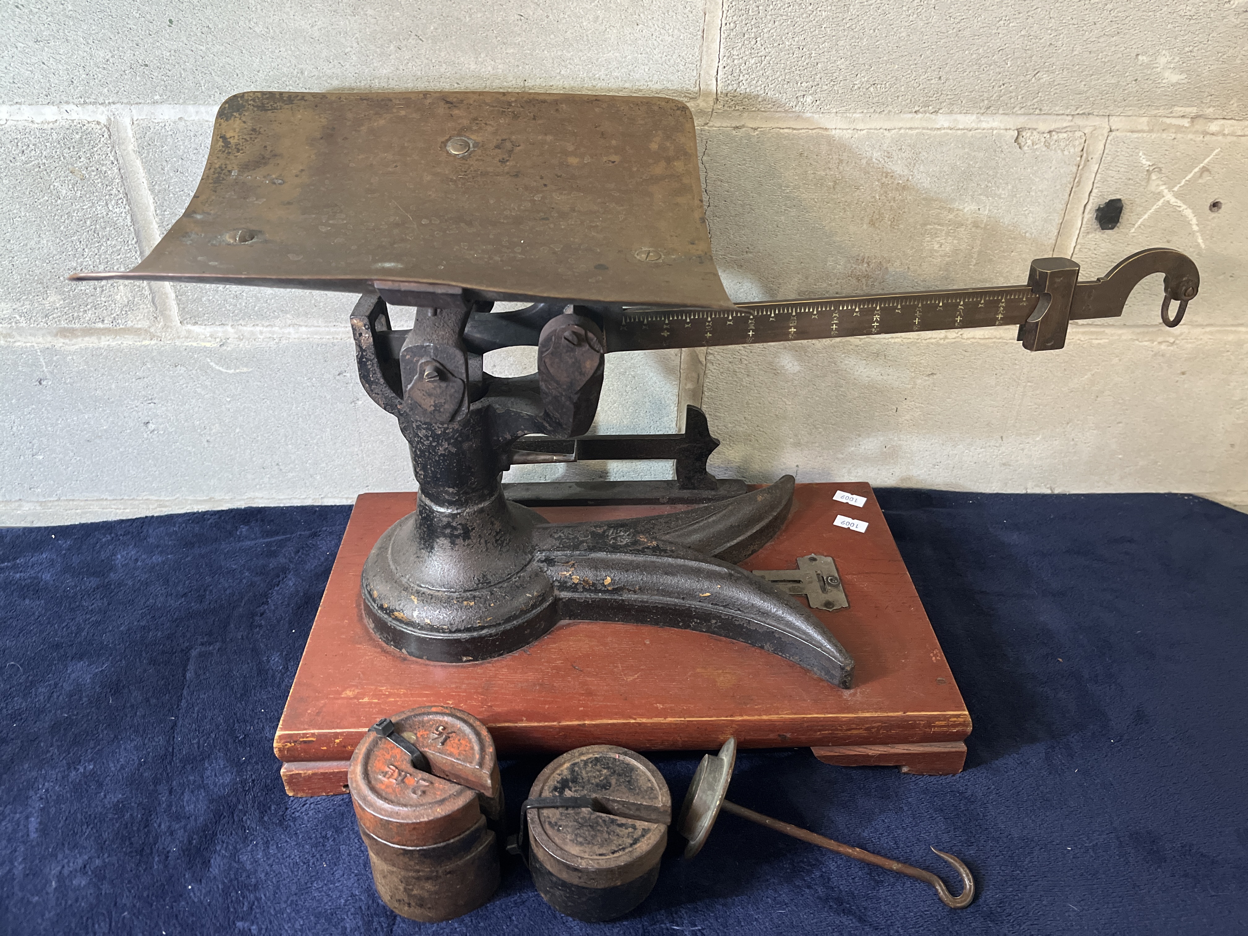 This antique industrial-style counter platform scale measures 18 inches by 12 inches and features a cast-iron frame and mechanism mounted to a rectangular reddish-brown wooden base. The assembly includes a wide metal platform with a curved profile and a graduated beam with a sliding poise. The lot includes an assortment of cylindrical metal counterweights and a metal weight hanger. One weight is marked with 5 LBS and 2 KG.