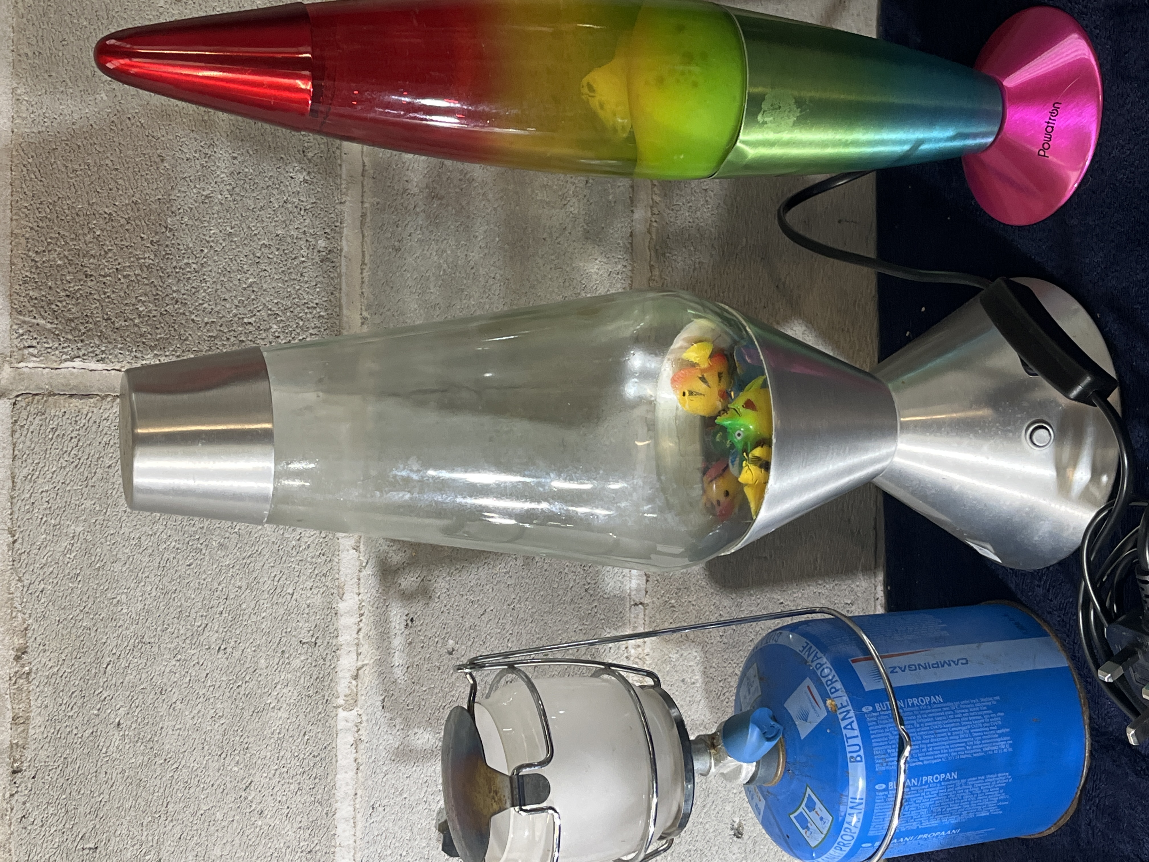 A trio of contemporary lighting and portable equipment. The group includes a Powatron rocket-style rainbow motion lamp featuring a multi-colored gradient glass vessel in red, yellow, and green, with a pink metallic-finish base and cap. Also included is a conical motion lamp with a clear glass body containing multiple colorful fish-shaped figures, mounted on a brushed metal base with a matching top cap. Completing the set is a Campingaz portable gas lantern, comprising a blue butane/propane fuel canister, a frosted glass globe, and a protective metal wire cage. The electrical items are fitted with standard plugs.
