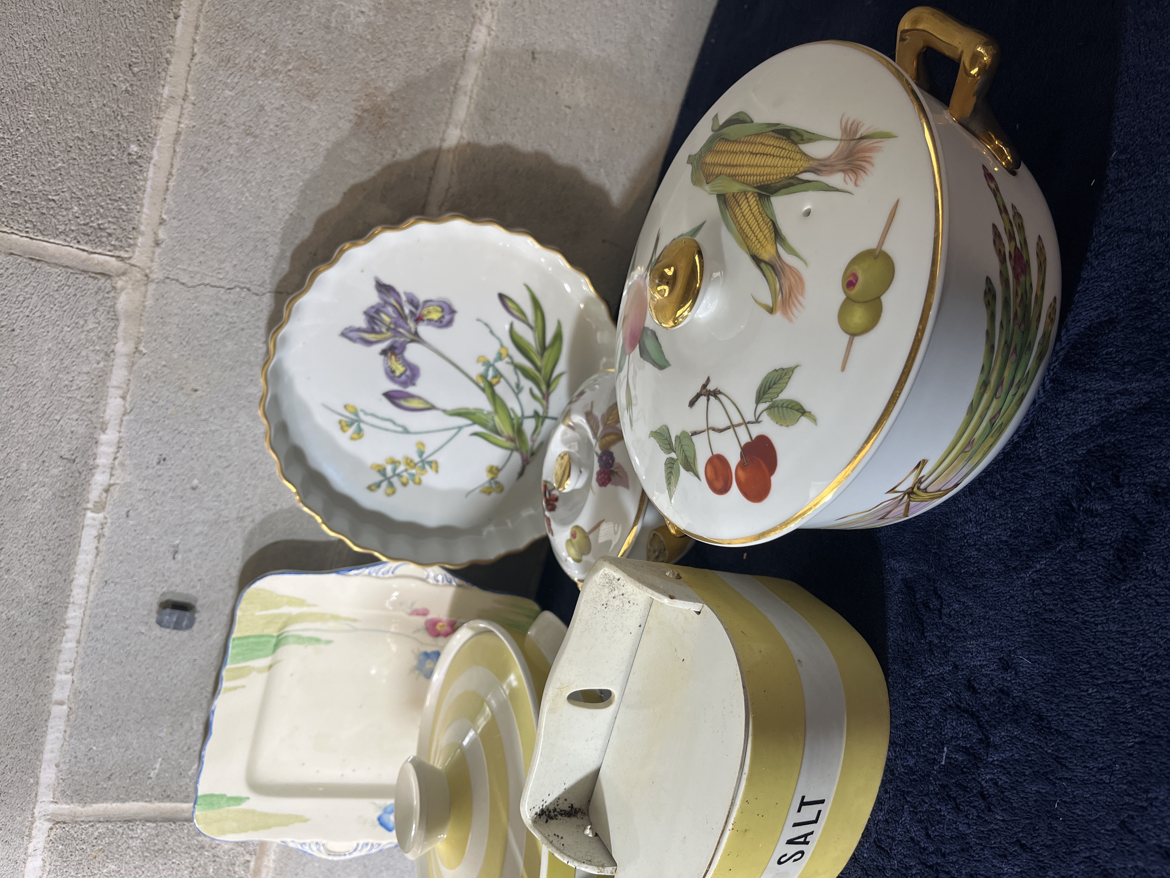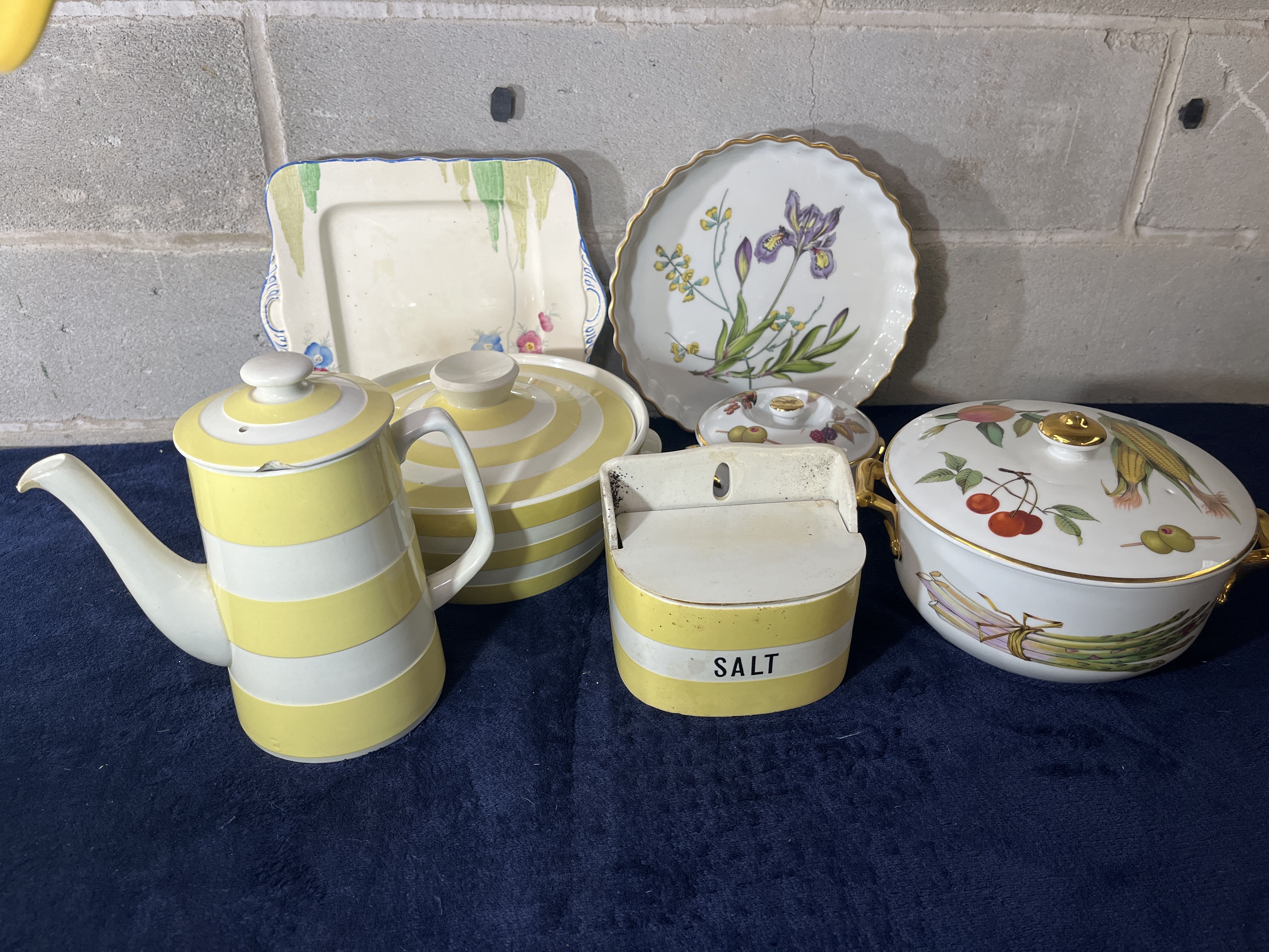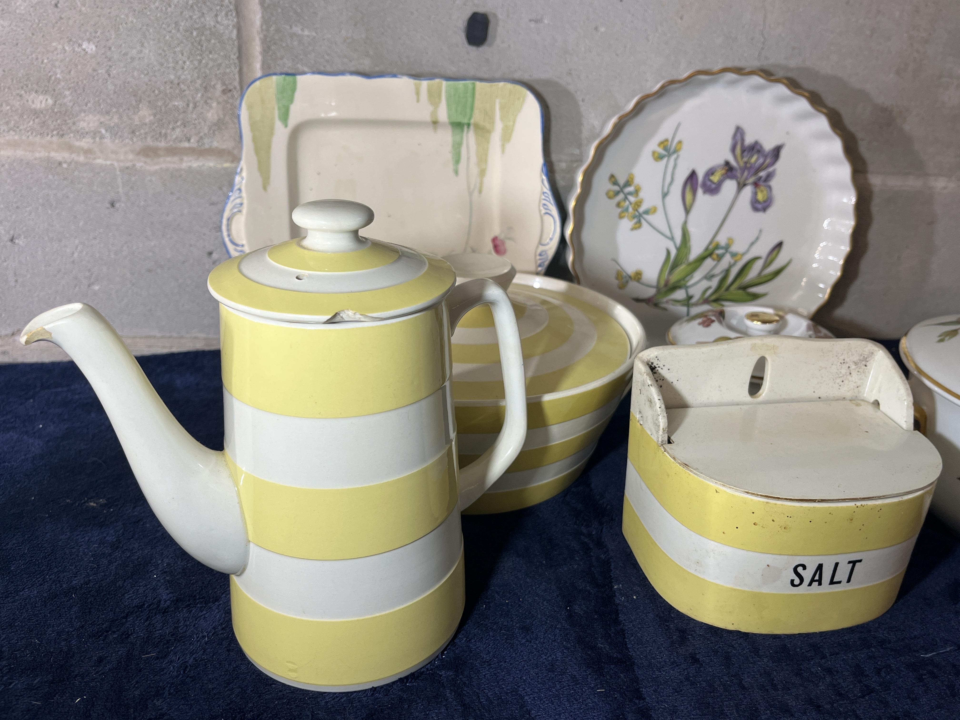 A collection of ceramic and porcelain tableware featuring a group of T.G. Green yellow and white horizontal-banded kitchenware. The T.G. Green pieces include a lidded teapot, a covered bowl, and a wall-mountable salt box marked SALT. The assortment also includes an Art Deco-style square plate with a scalloped rim and hand-painted floral motifs, a circular scalloped-edge plate depicting a purple iris with a gilt rim, and a white lidded tureen decorated with botanical illustrations of corn, cherries, and asparagus, finished with gilt handles and finials.