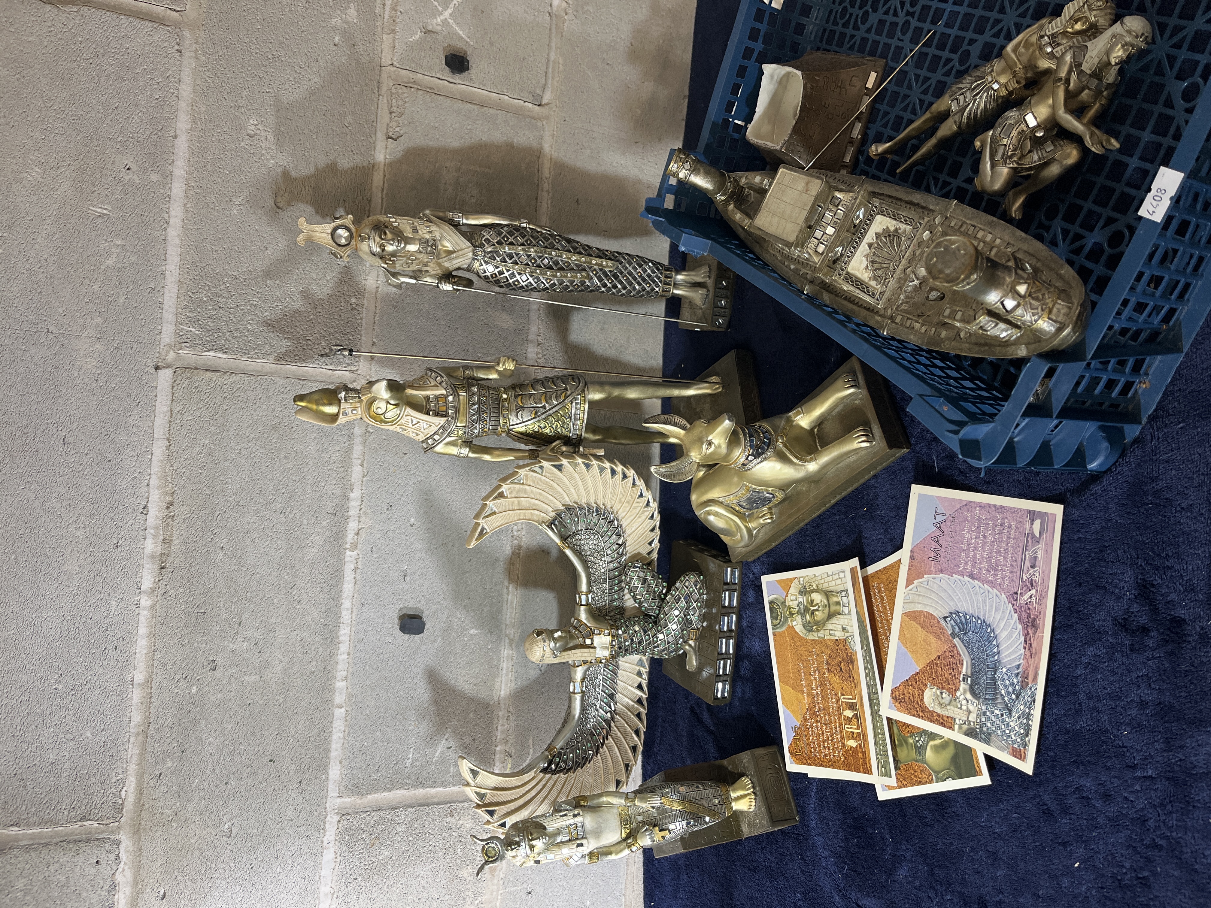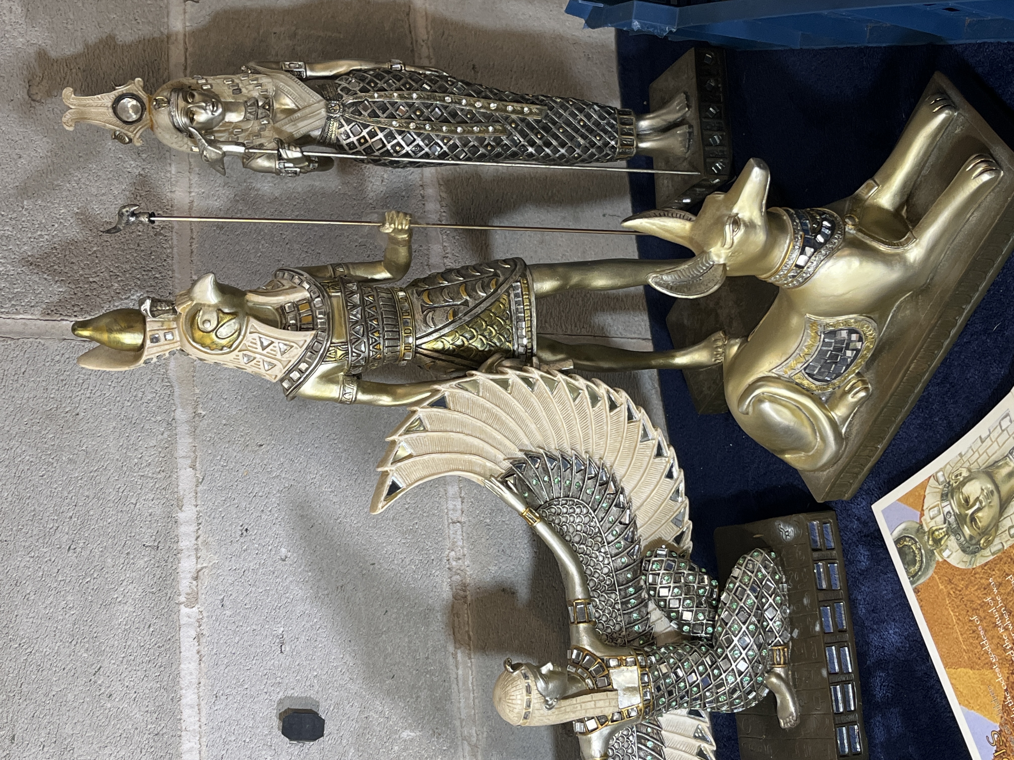 A collection of contemporary Egyptian-themed decorative figurines produced by Ebros Gift. The group includes representations of various deities including a winged Isis, a falcon-headed Horus, and a recumbent Anubis jackal. The items are constructed from cast resin with metallic gold and silver-toned finishes. Several figures feature inlaid decorative embellishments including mirrored glass and colored glass accents. The lot is accompanied by multiple color-printed informational cards providing mythological context for figures such as Isis and Maat. Also included is a small decorative box and a blue plastic storage crate.
