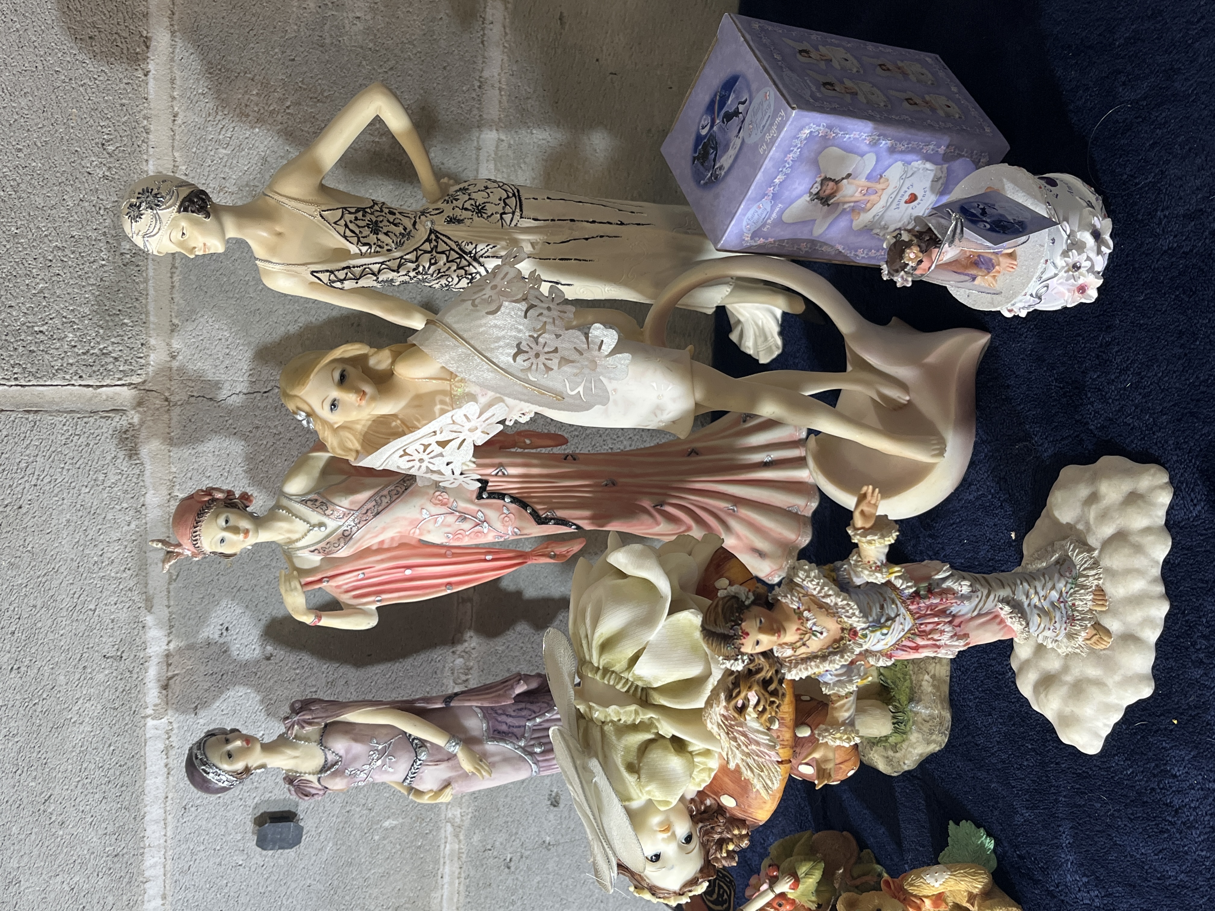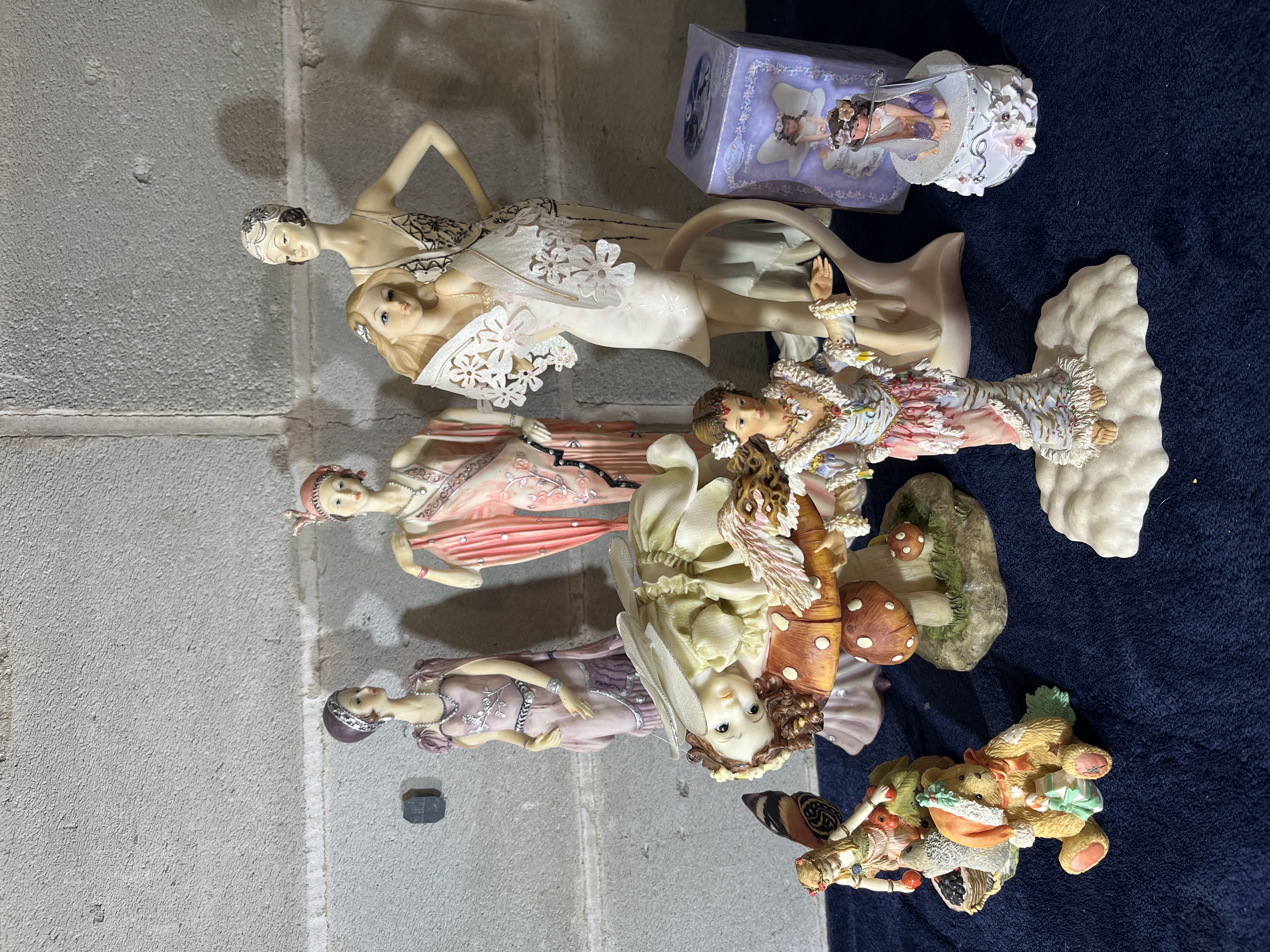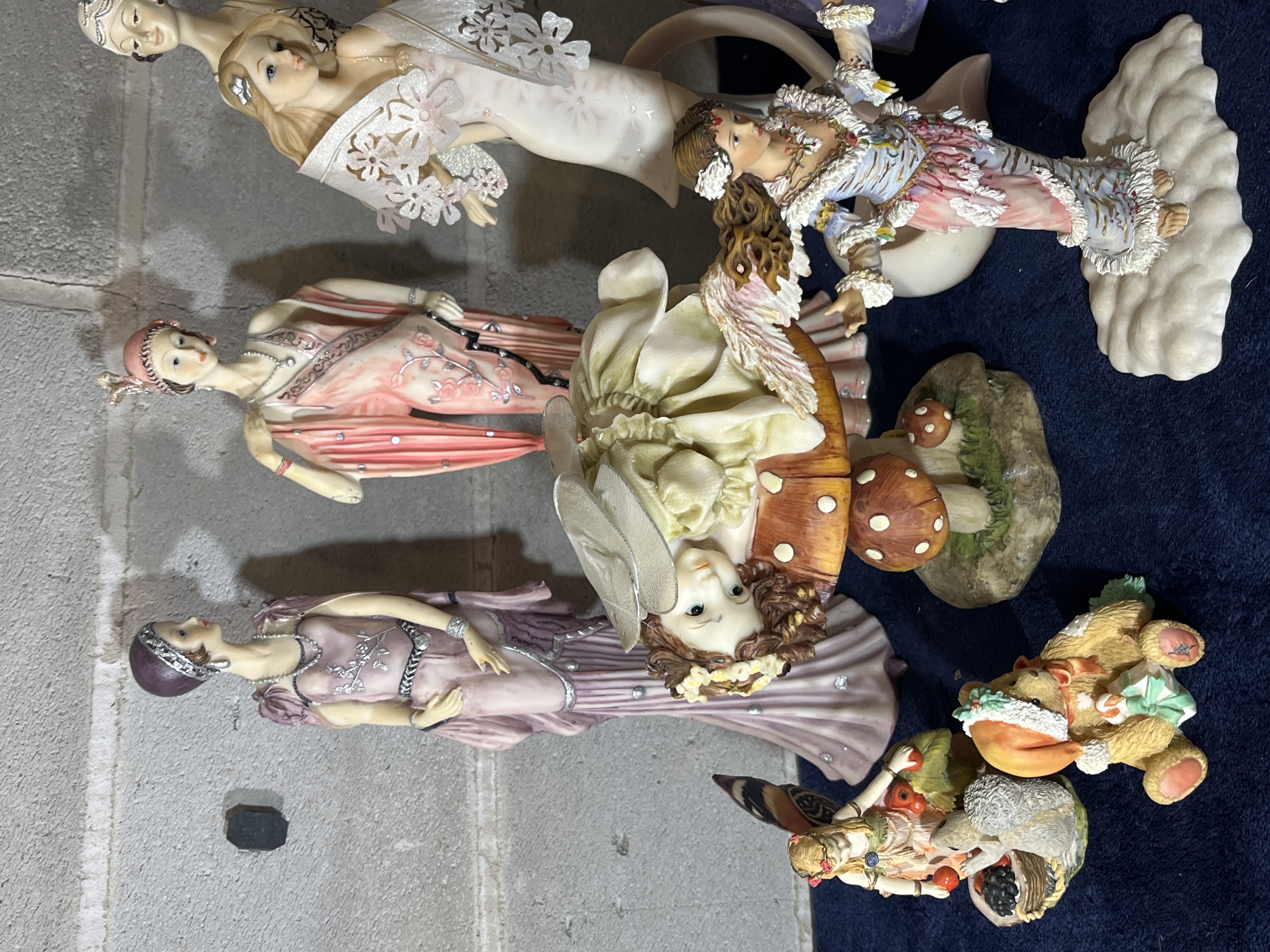 This collection comprises several painted cast resin figurines, including pieces from the Franklin Mint and Regency. Among the items are tall, slender female figures in detailed gowns, one of which is positioned on a cloud-form base, consistent with the Franklin Mint Rapunzel figure. The group also includes fantasy-themed subjects, such as a fairy resting on a large toadstool and a standing fairy. One figurine is contained within its original retail packaging, identified as January Garnet from the Fairy Wonderland by Regency series. A small teddy bear figurine is also included. The figures feature varied textures and hand-painted finishes.