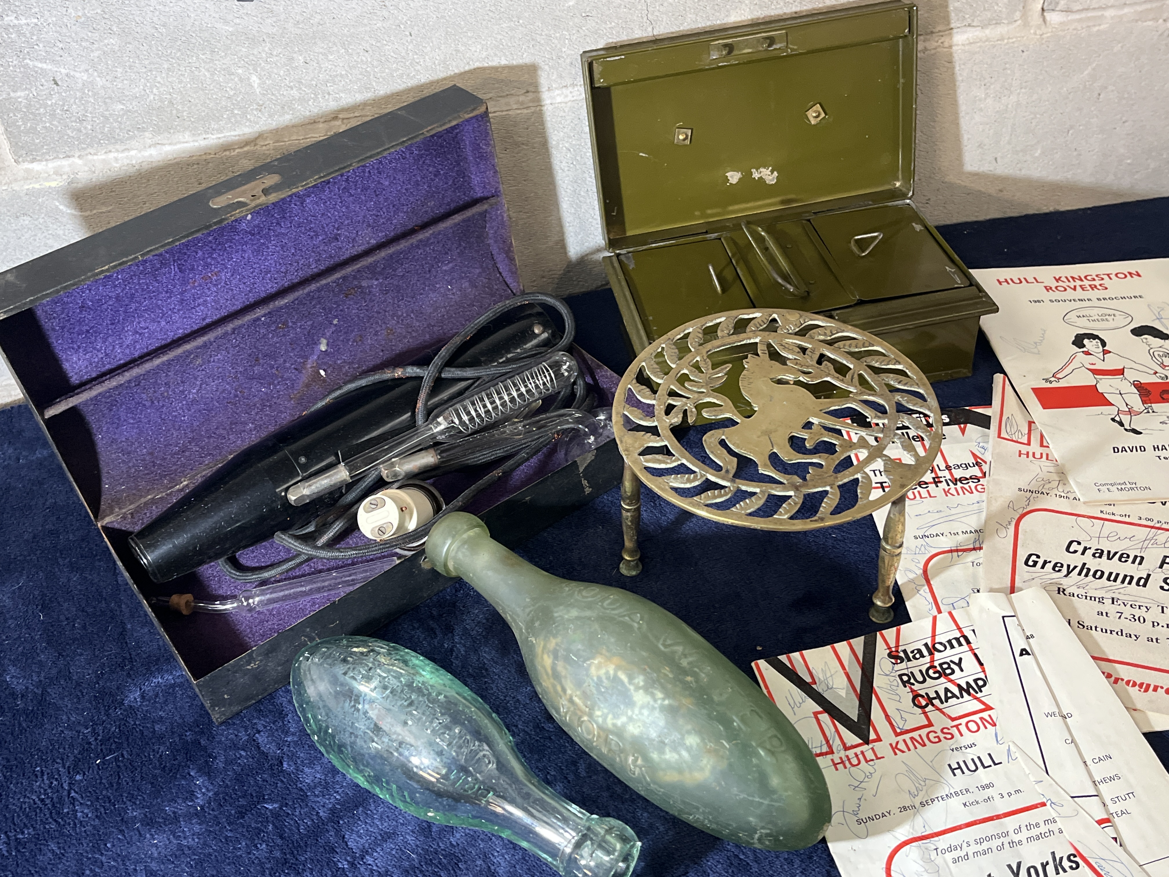 A group of sports ephemera primarily related to Hull Kingston Rovers Rugby League and Craven Park Greyhound Stadium, including programs and souvenir brochures from the early 1980s, several featuring multiple ink signatures. The lot includes two antique glass torpedo-style mineral water bottles, one example embossed with J. L. P. COULSON HULL. Also featured is a decorative brass circular trivet with a pierced design of a horse amongst foliage, an olive green enameled metal field box with internal compartments, and a vintage high-frequency electro-medical apparatus with glass electrodes, housed in a fitted black case with a purple velvet-lined interior.