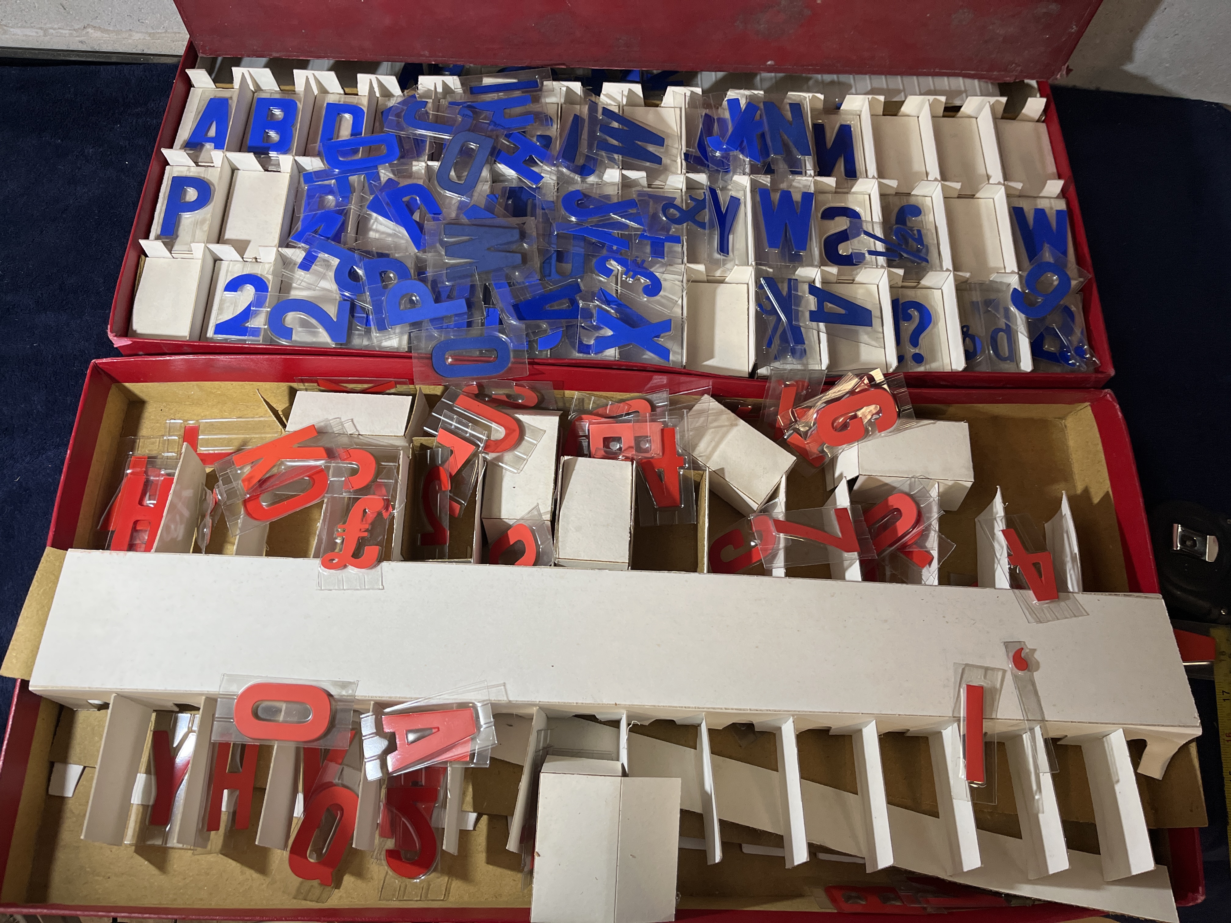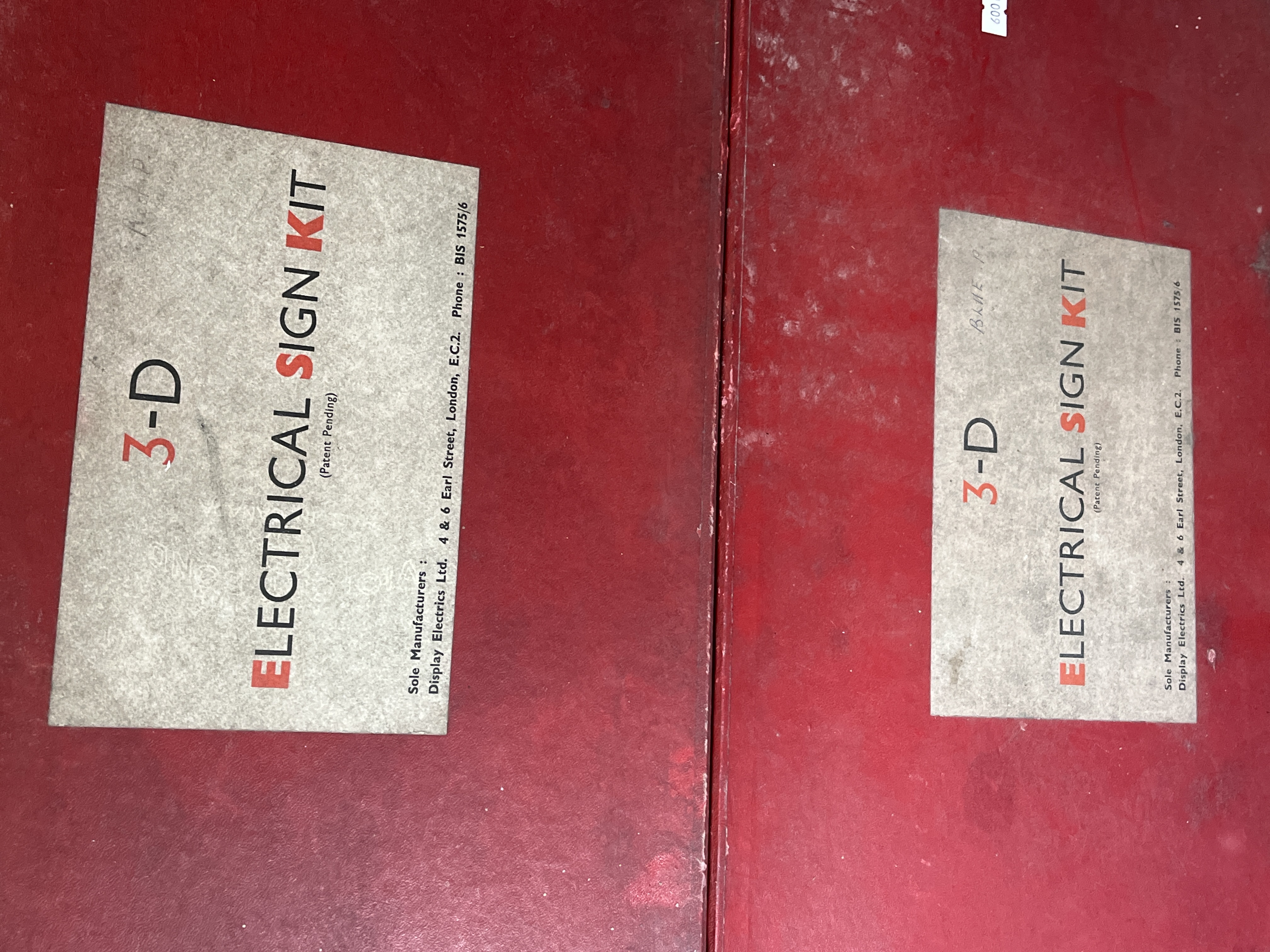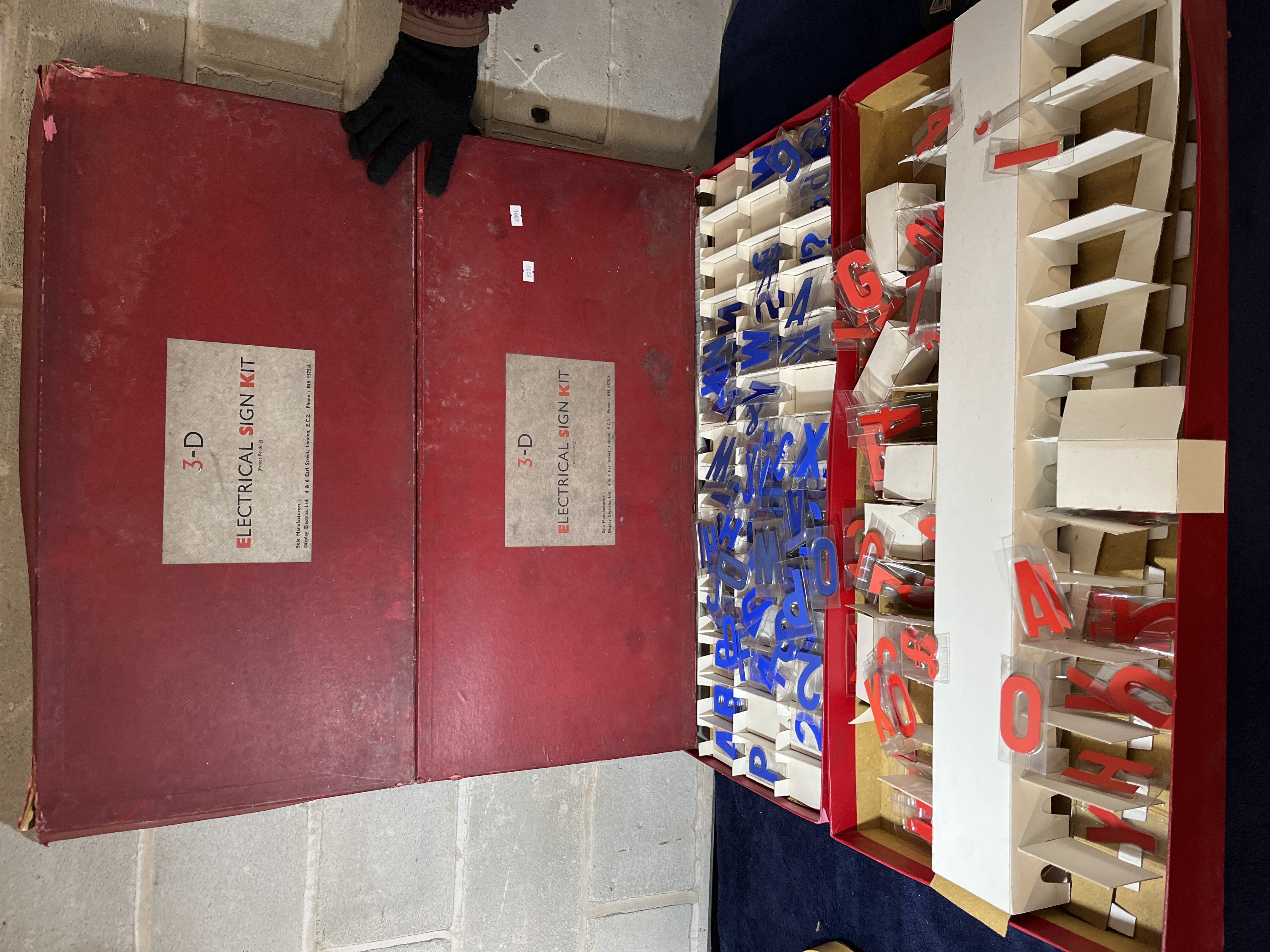 A pair of mid-20th century commercial signage kits manufactured by Display Electrics Ltd. of London. Each kit is housed in a large, rectangular red-covered case with a printed paper label on the lid. The labels identify the contents as a 3-D Electrical Sign Kit with a Patent Pending notice and the manufacturer address at 4 and 6 Earl Street, London, E.C.2. The interiors are fitted with cardboard dividers containing an assortment of translucent plastic characters. One set features blue characters and the other features red characters. The collection includes uppercase letters, numerals, and various symbols including currency signs and punctuation.