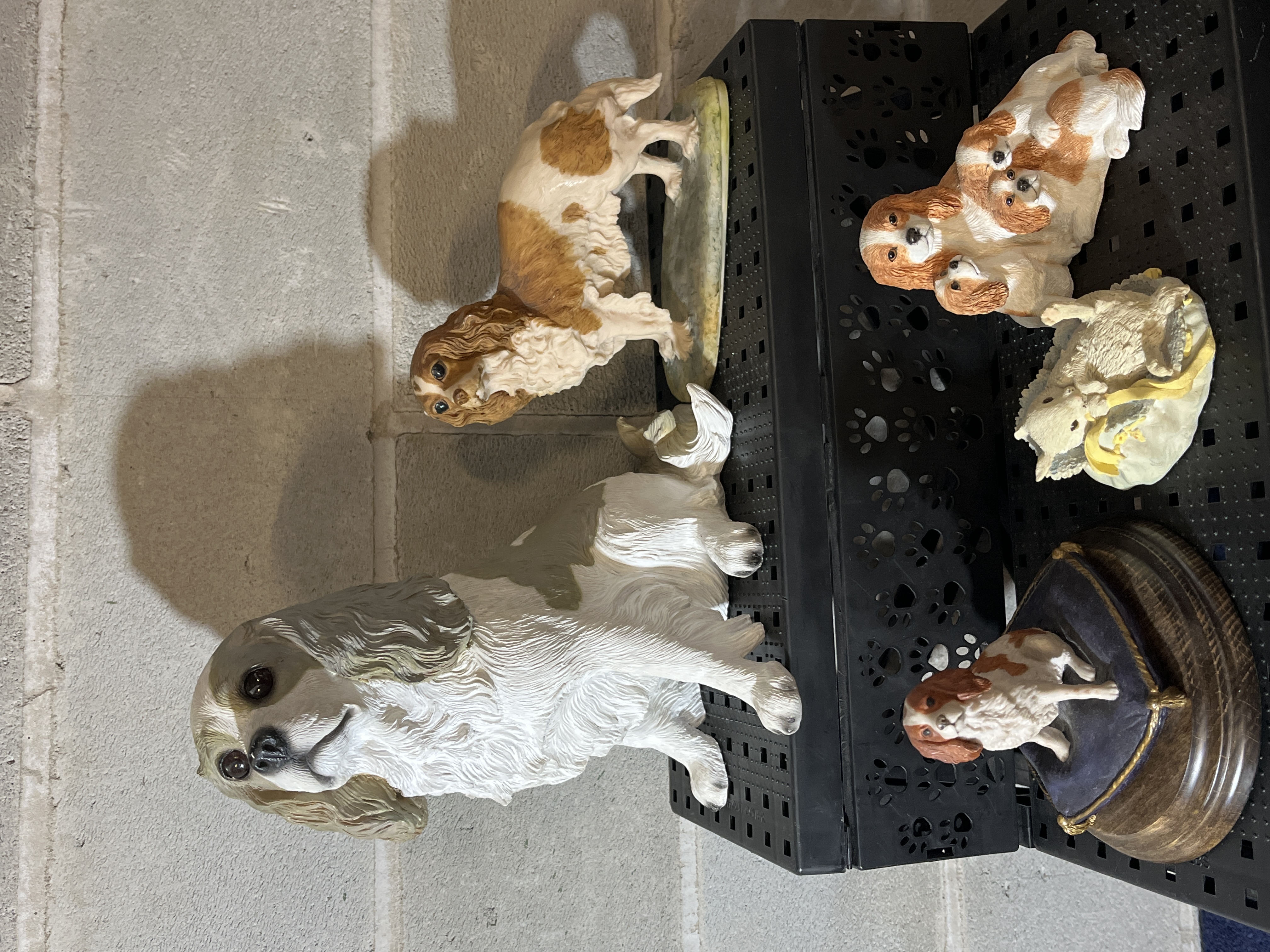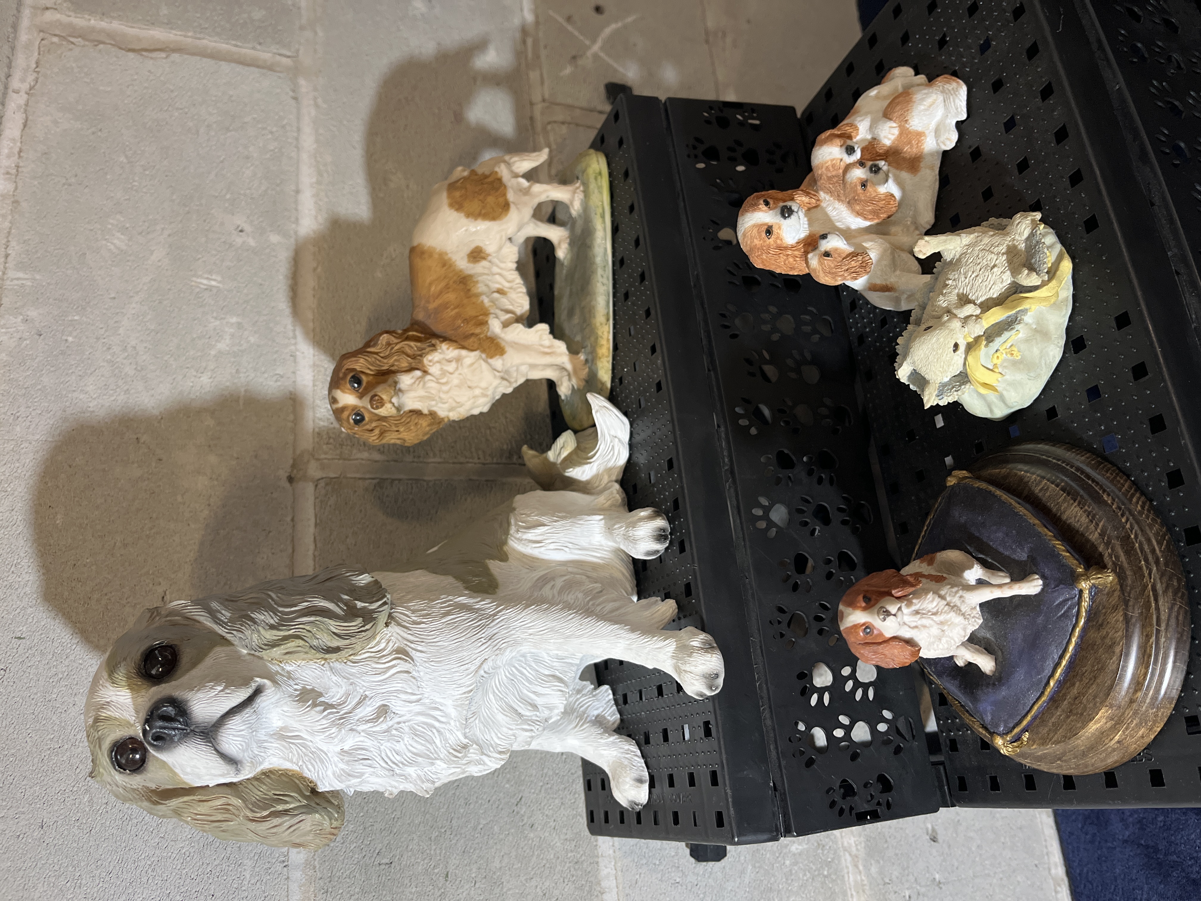 A collection of decorative figurines depicting Cavalier King Charles Spaniels in the Blenheim coloration of chestnut and white. The group includes a large seated spaniel with molded fur texture, a standing figure on a naturalistic green base, a mother dog with her litter, a spaniel positioned on a circular tiered base with a purple cushion-style top, and a small figure with a yellow ribbon. The items are crafted from painted cast resin and ceramic with realistic features and painted eyes. These pieces follow the tradition of English Staffordshire spaniel ornaments. No maker marks or signatures are visible on the pieces.