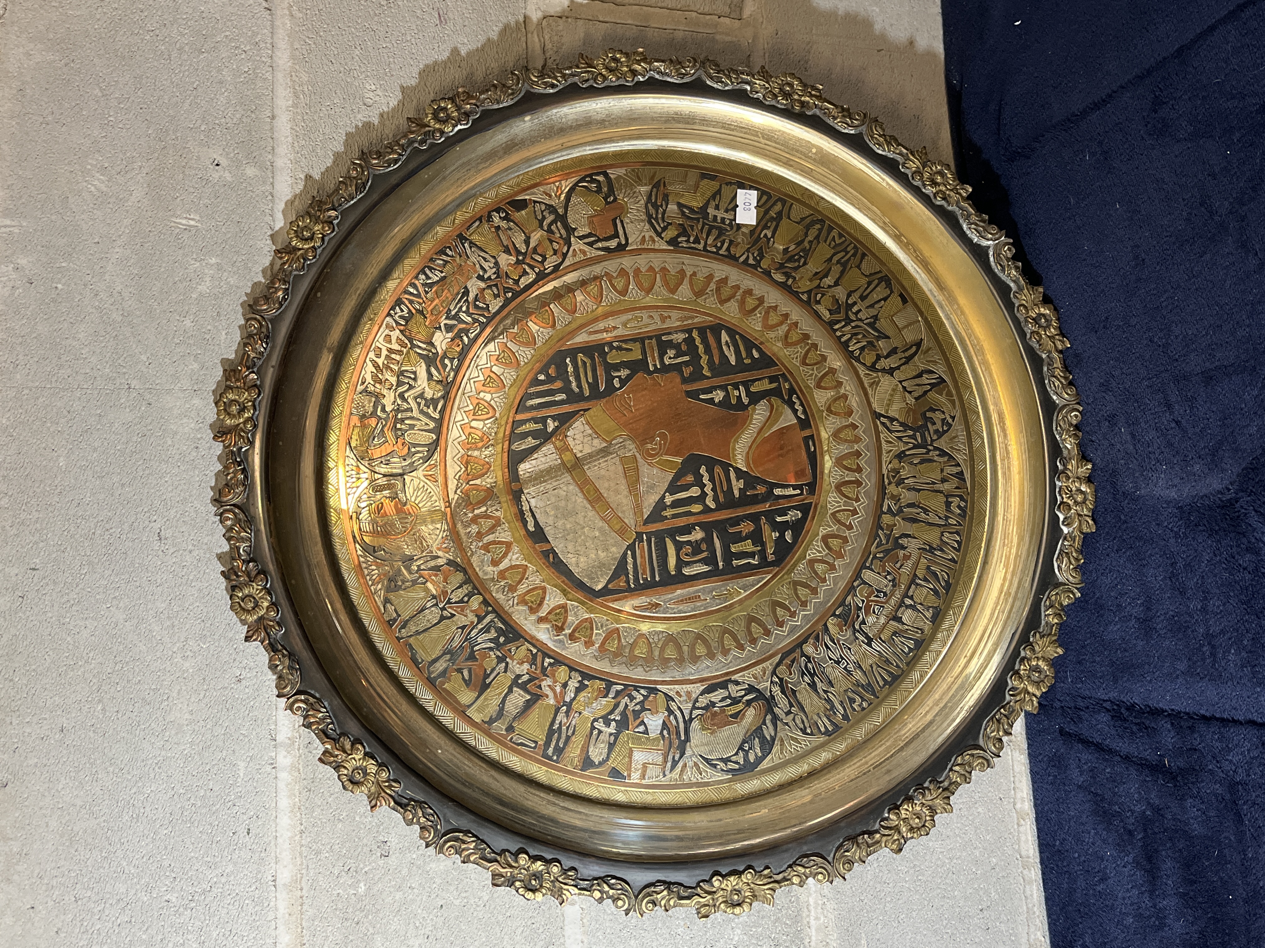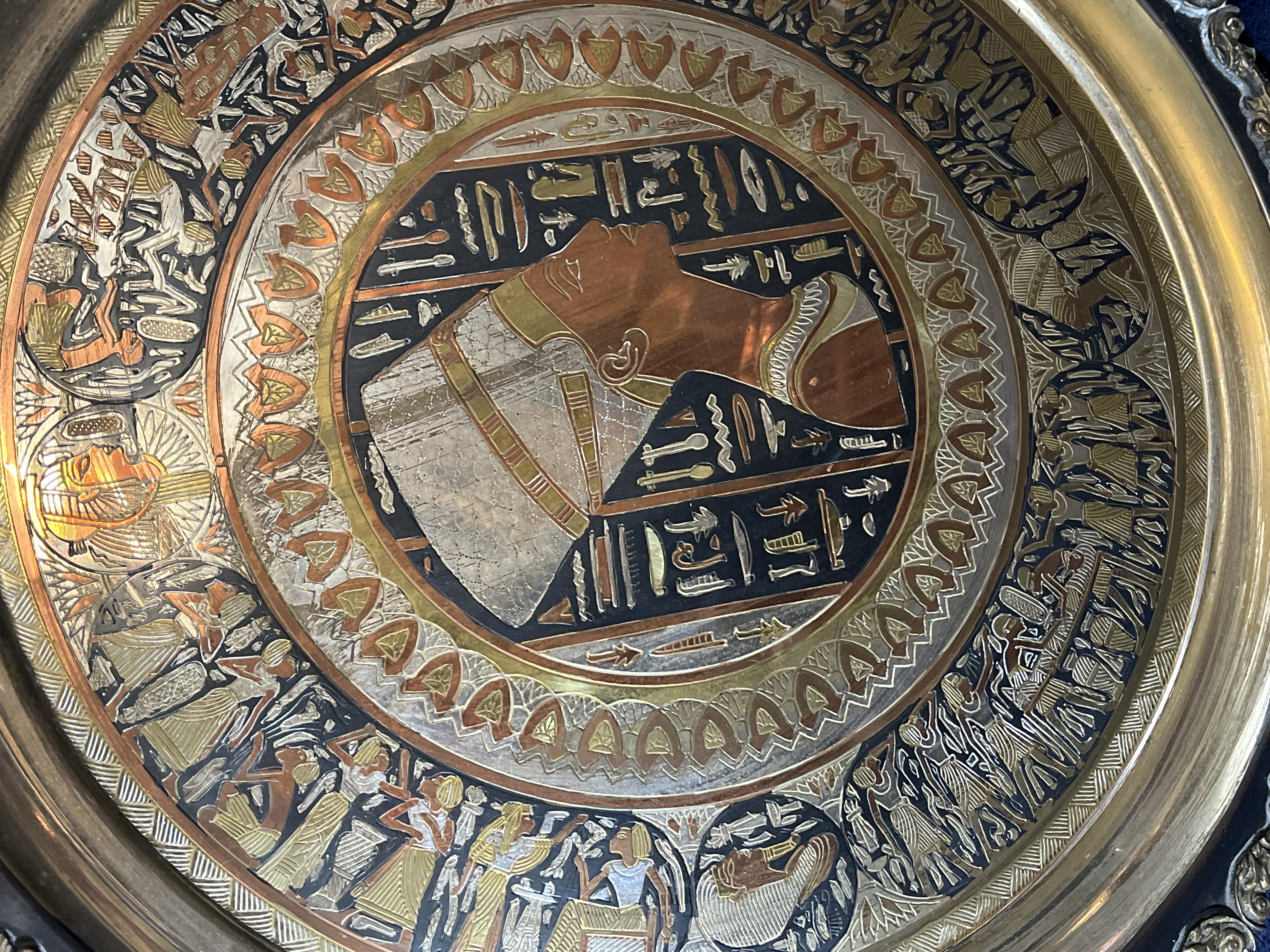 This large Egyptian Revival decorative wall plaque, in the style of Cairoware, is crafted from brass with mixed metal inlays in silver and copper tones. The circular design features a central medallion depicting a profile bust in a traditional Egyptian headdress, surrounded by hieroglyphic-style characters. This central image is framed by concentric decorative bands, including an outer frieze with various scenes of figures in ancient Egyptian attire. The piece is finished with an ornate, scalloped cast-metal rim featuring floral motifs.